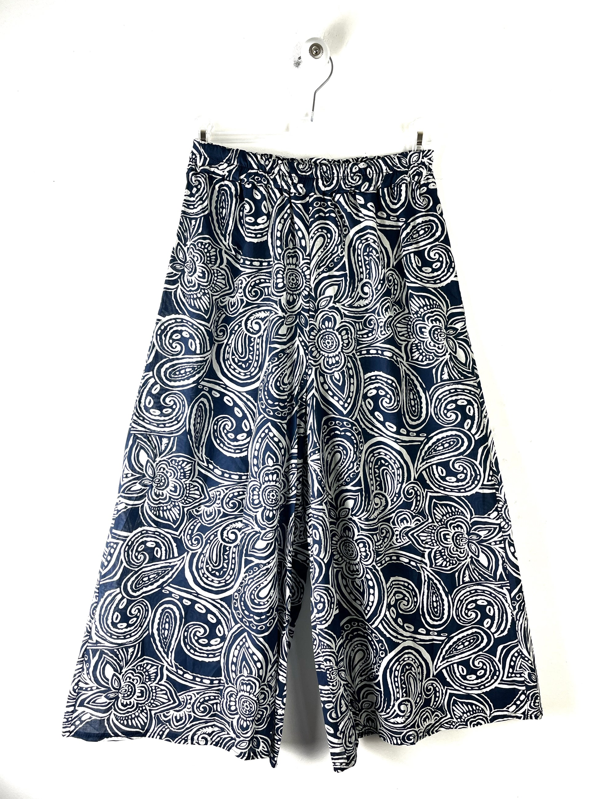 Pantalone in cotone leggerissimo. Vita alta con elastico. Gamba molto larga, effetto gonna. Lunghezza alla caviglia