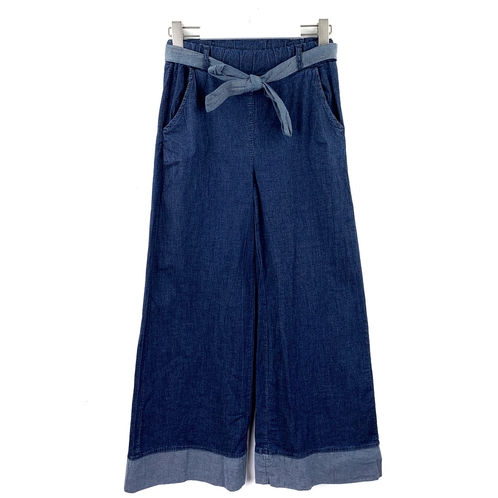 Pantalone in denim scuro leggero. Gamba larga a palazzo, lunghezza alla caviglia. Vita alta con elastico, passanti e cintura in denim chiaro. Finto risvolto sul fondo in denim più chiaro. 2 tasche sul davanti.