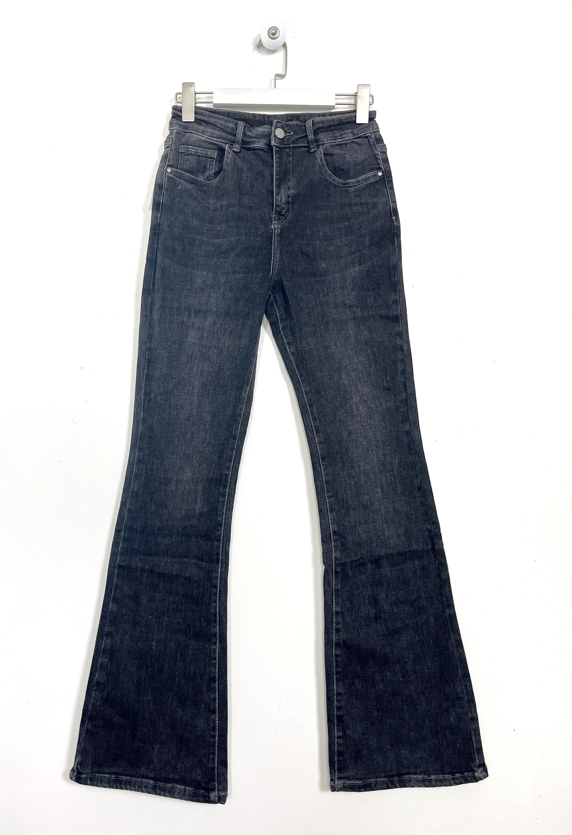 Denim 5 tasche vita alta superstretch a zampa. Patta con bottone e cerniera sul davanti e passanti per la cintura. Zampa larga 25 cm