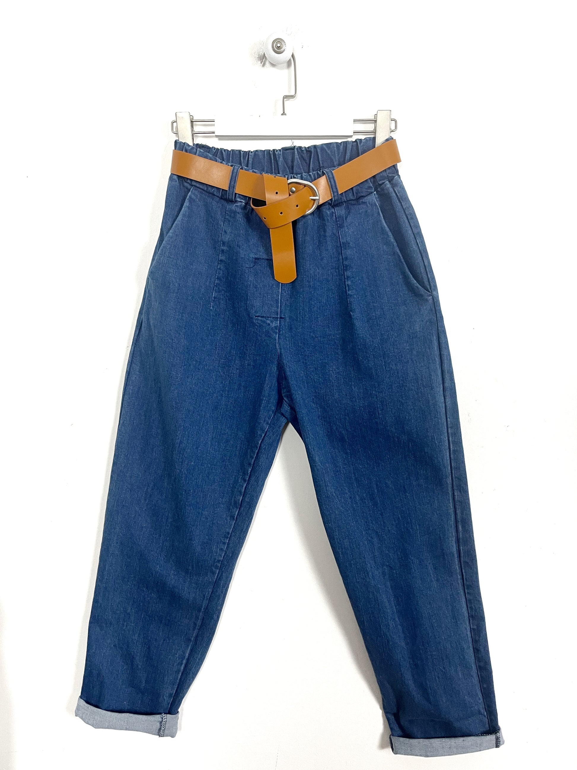 Jeans in cotone autunnale elasticizzato. Vita alta con elastico in vita, passanti con cintura in ecopelle. 2 tasche davanti oblique. Gamba larga ad ovetto, che va stringere leggermente sul fondo.