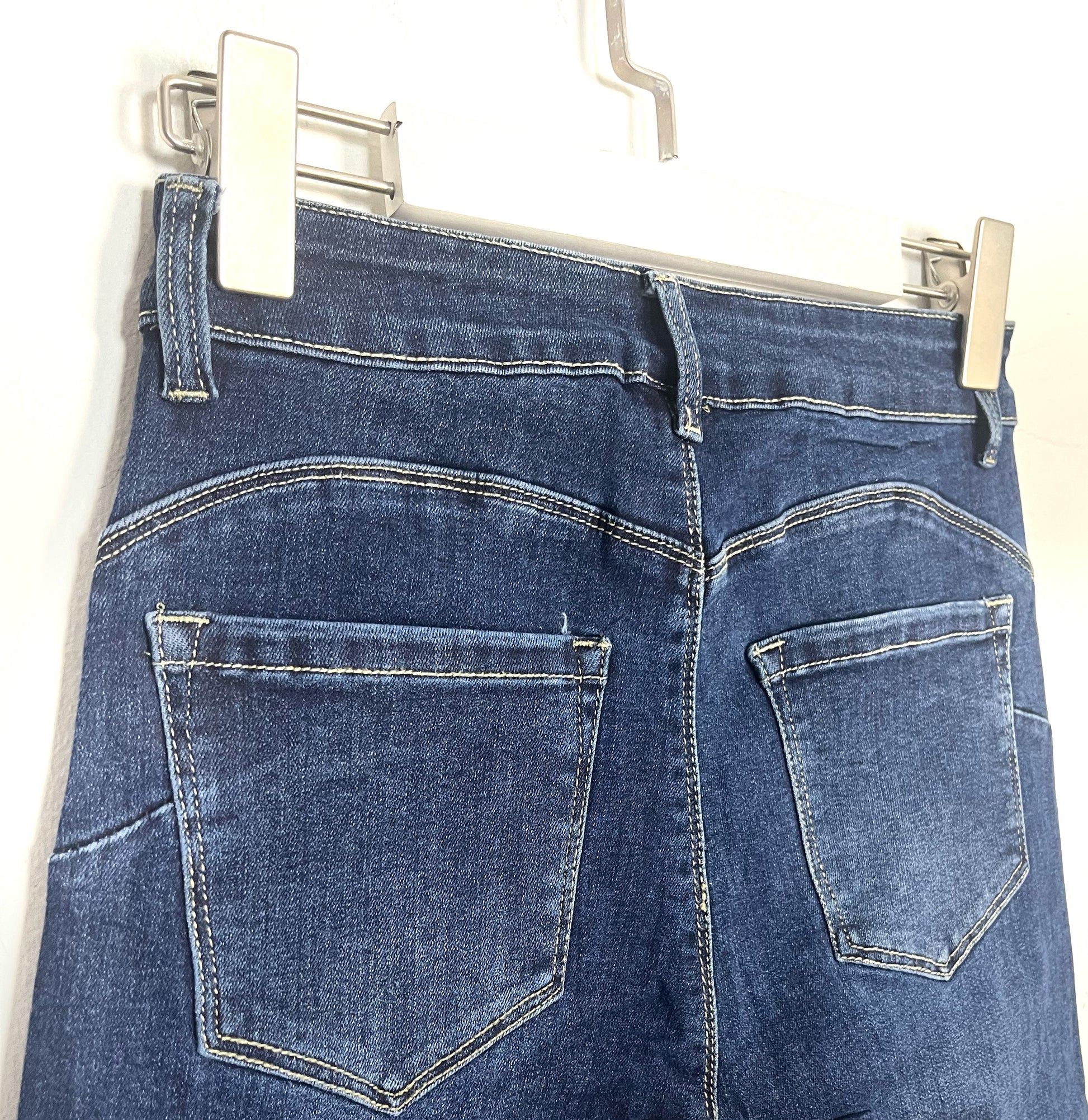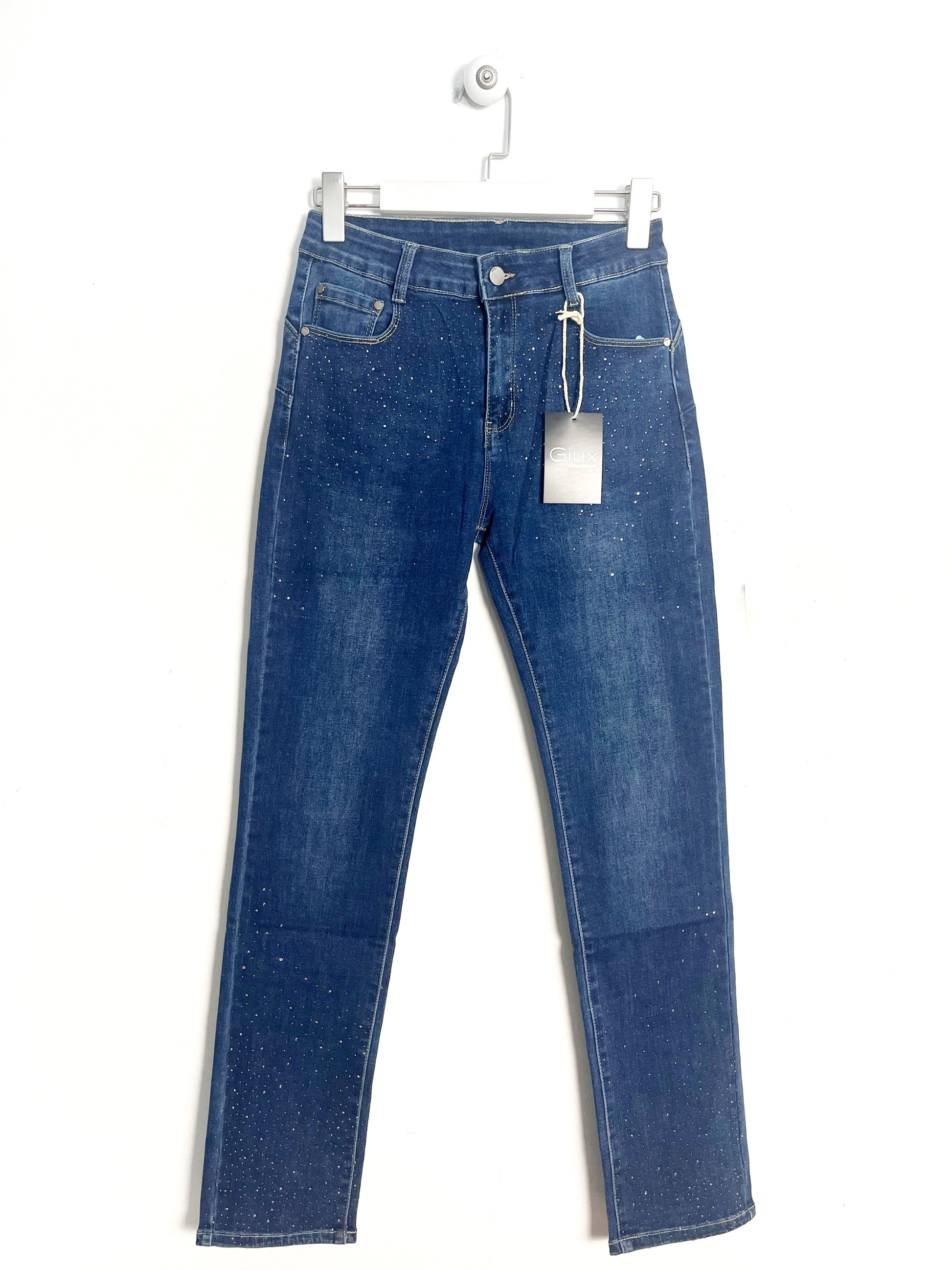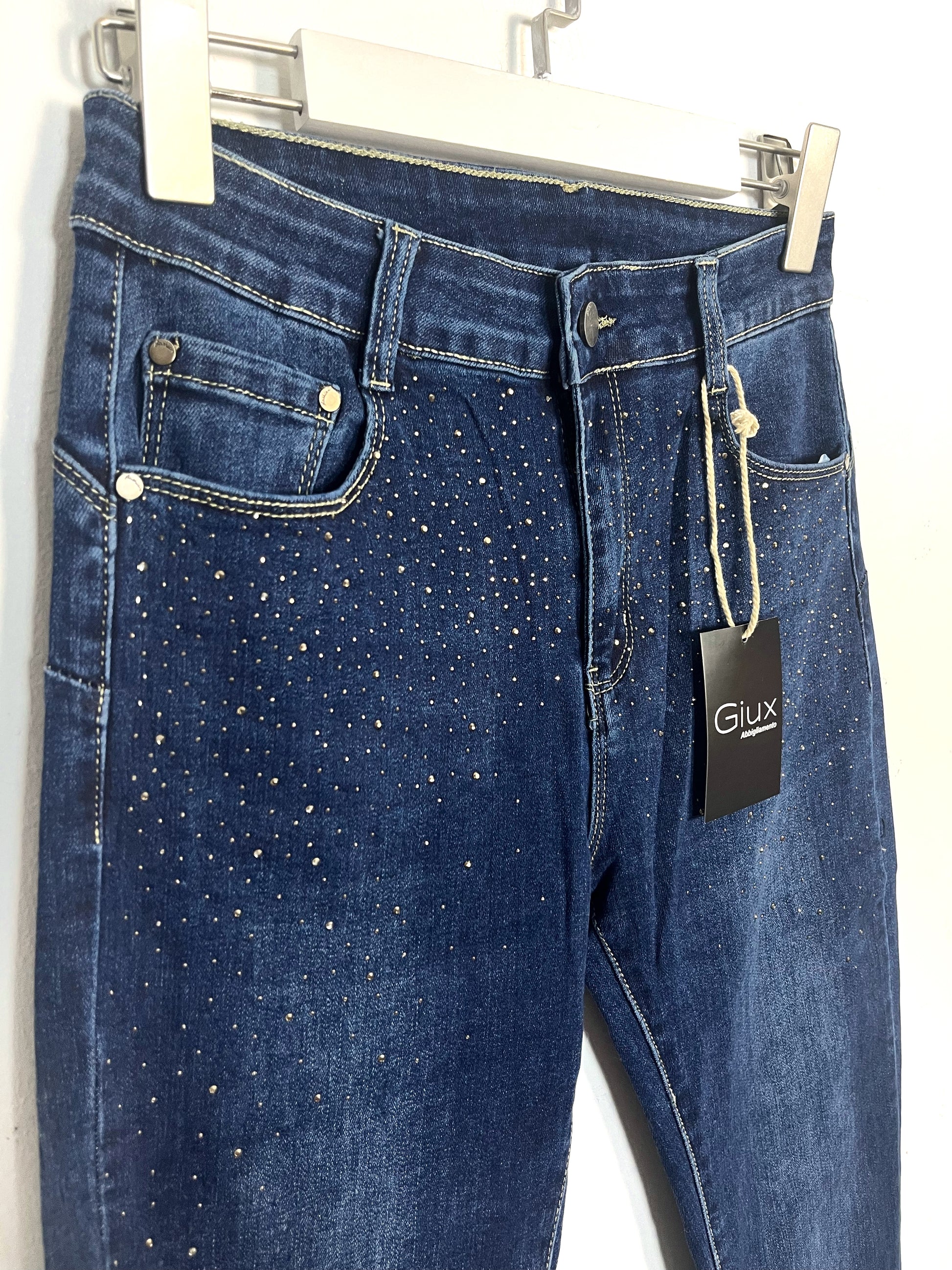 Denim 5 tasche vita alta superstretch. Gambale stretto. Patta con bottone e cerniera sul davanti e passanti per la cintura. Piccole borchiette e strass applicati sul davanti.