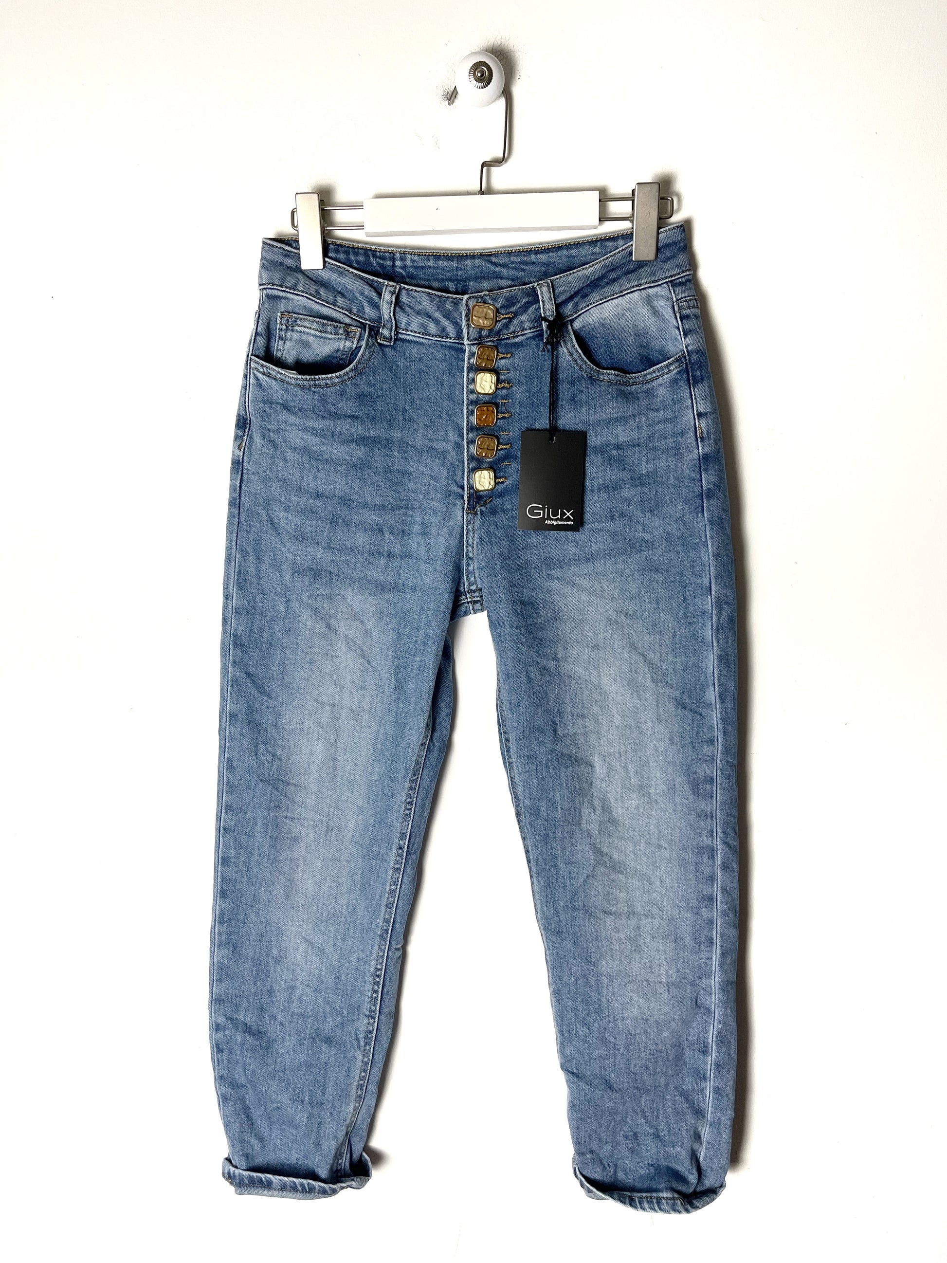 Jeans in denim chiaro di cotone elasticizzato. Gamba a sigaretta con vita alta, leggero effetto stropicciato e slavato. Chiusura con bottoni gioiello, 5 tasche.