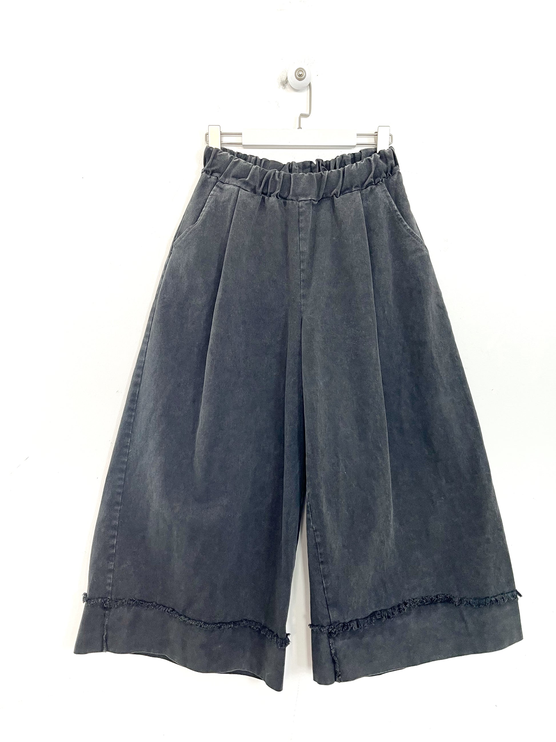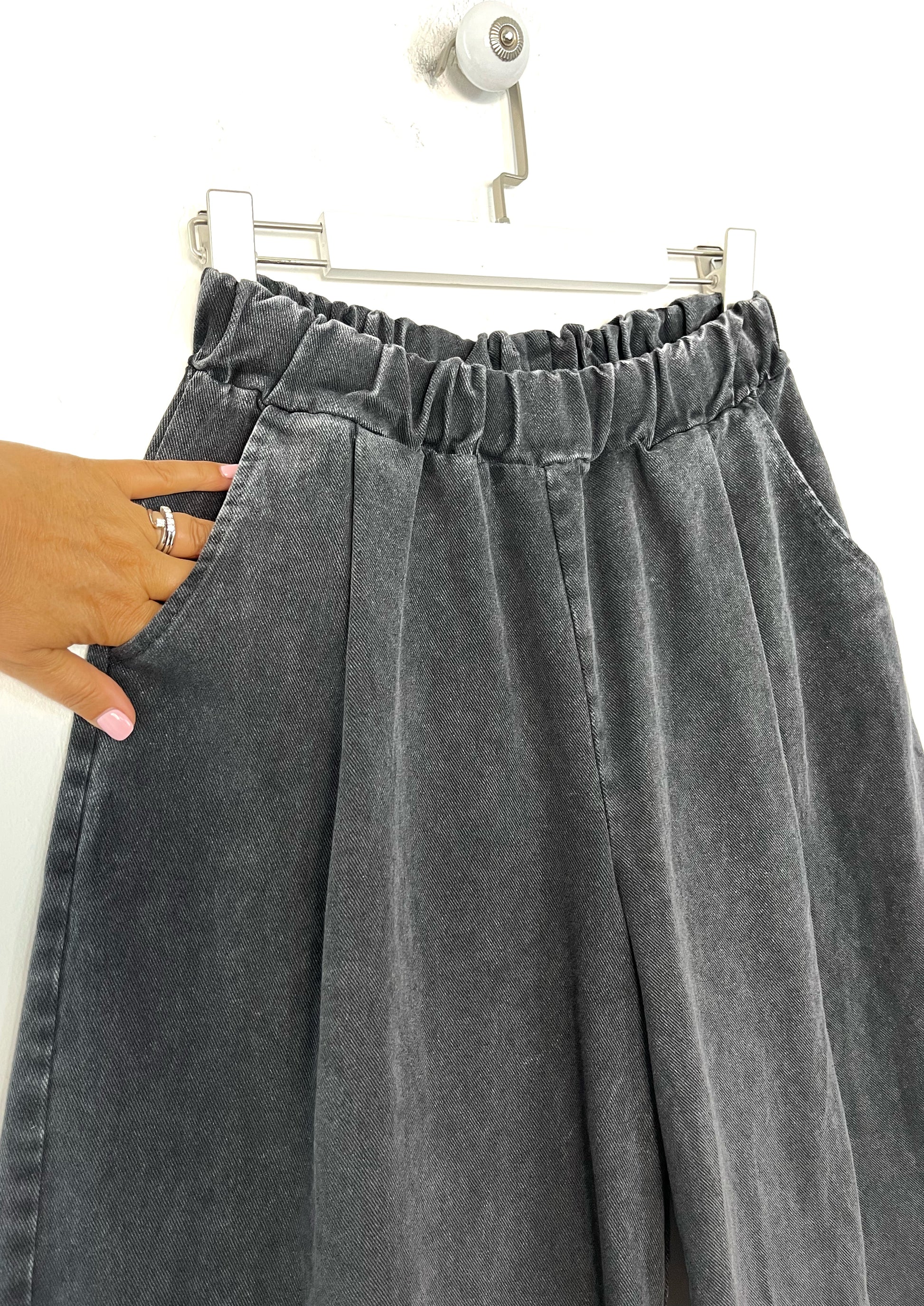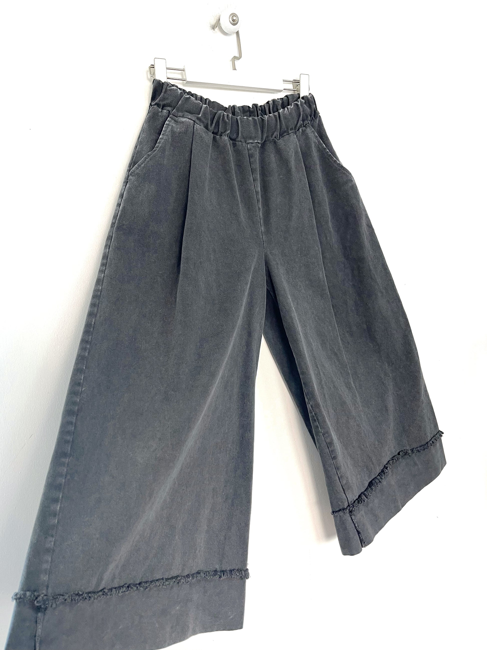 Jeans a gamba larga cropped con risvolto in denim grigio. Vita alta con elastico. Tasche laterali oblique.