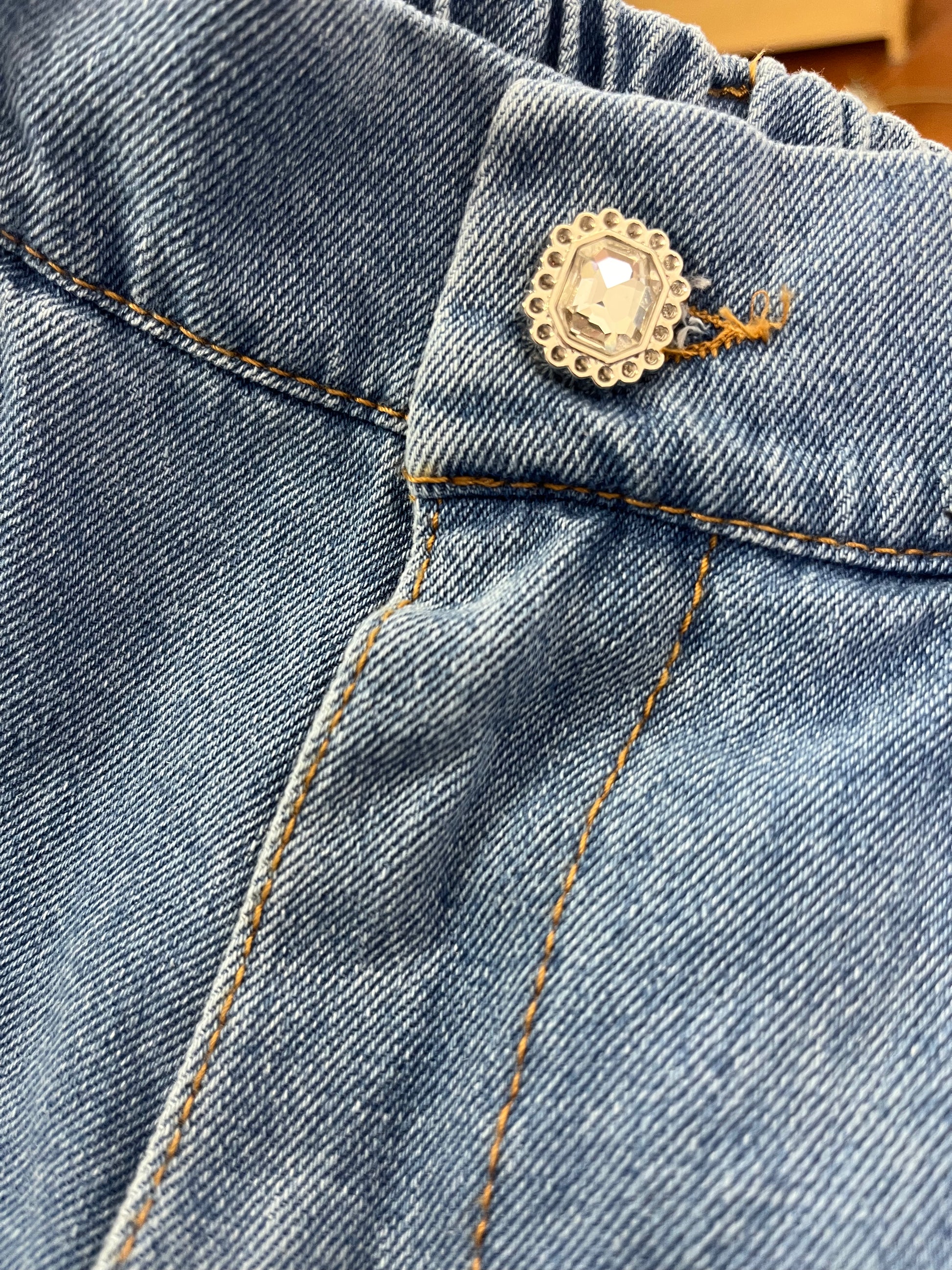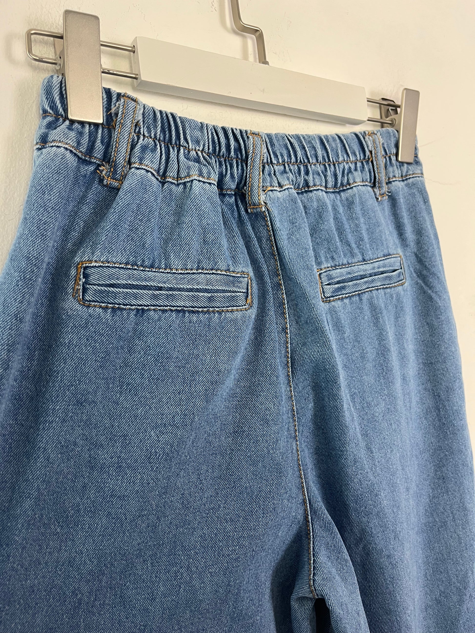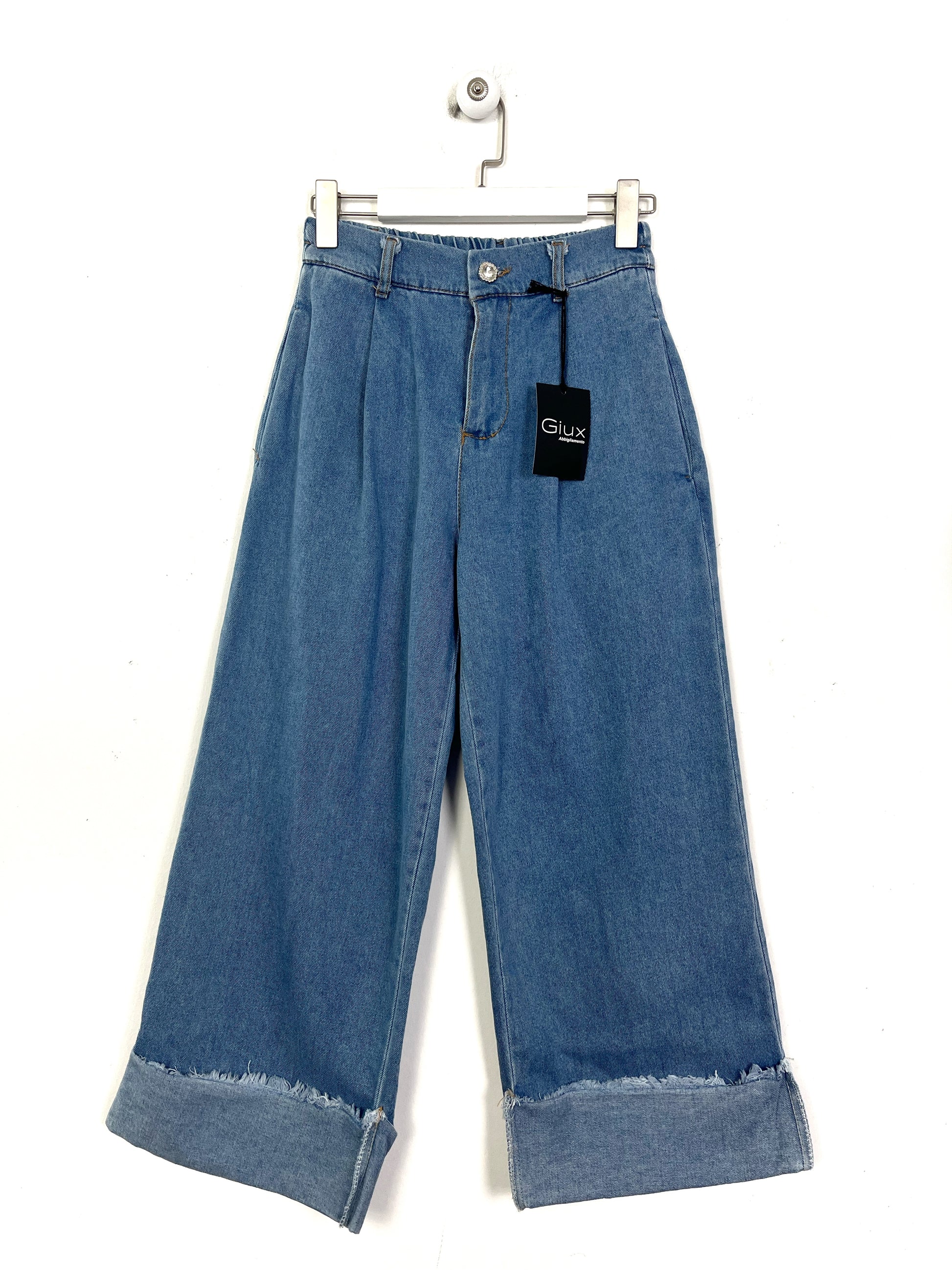Jeans a gamba larga cropped con risvolto in denim azzurro. Vita alta con elastico dietro, apertura con bottone gioiello. Passanti per cintura. Tasche laterali oblique.