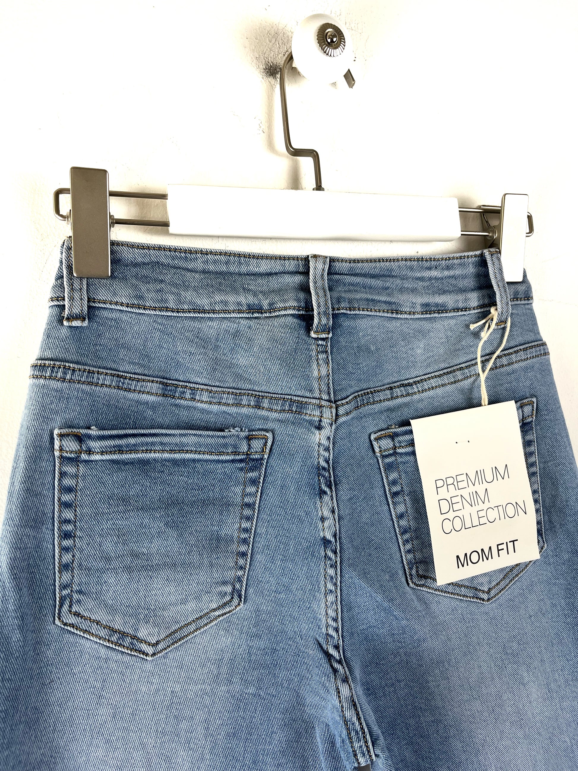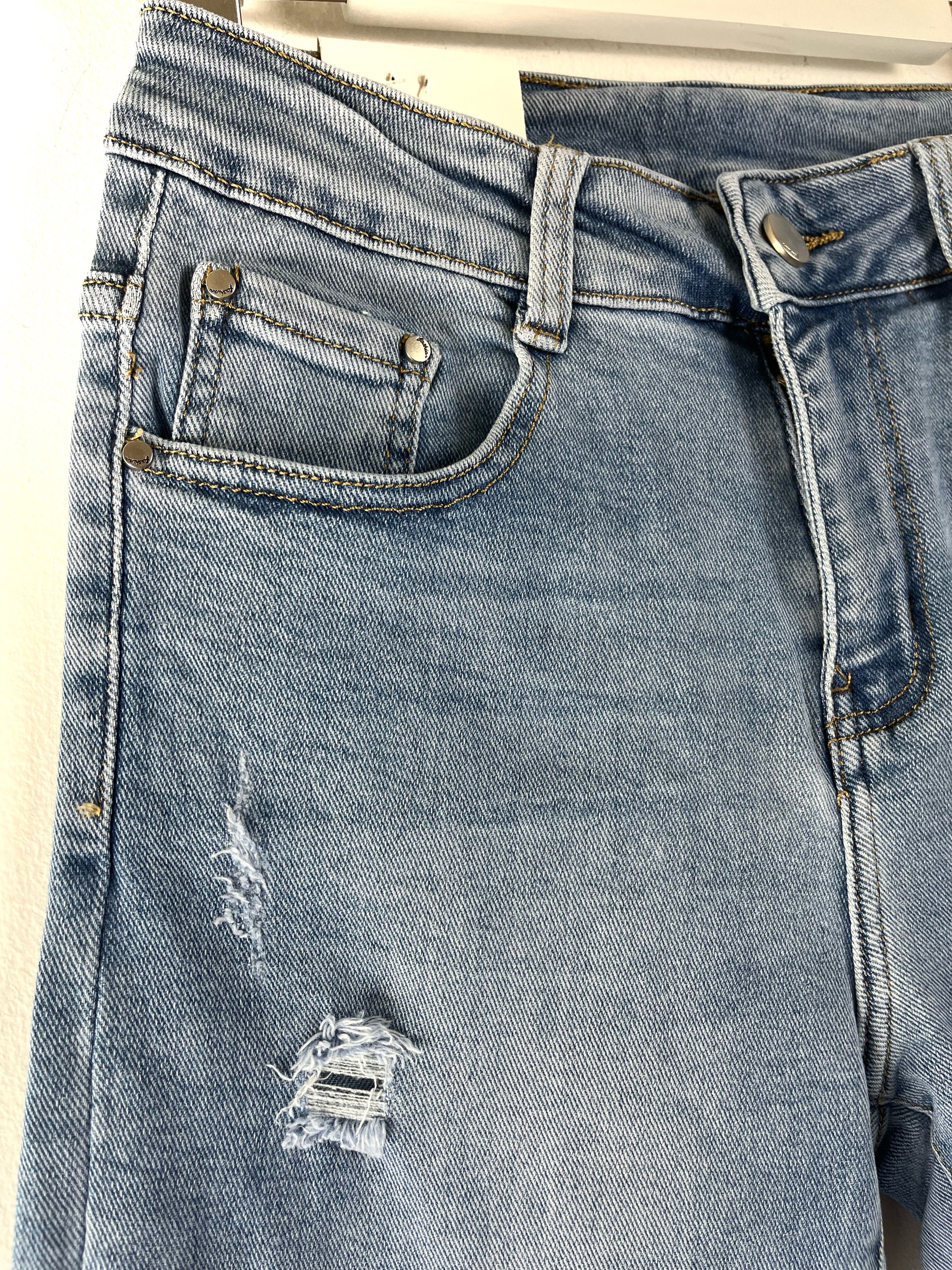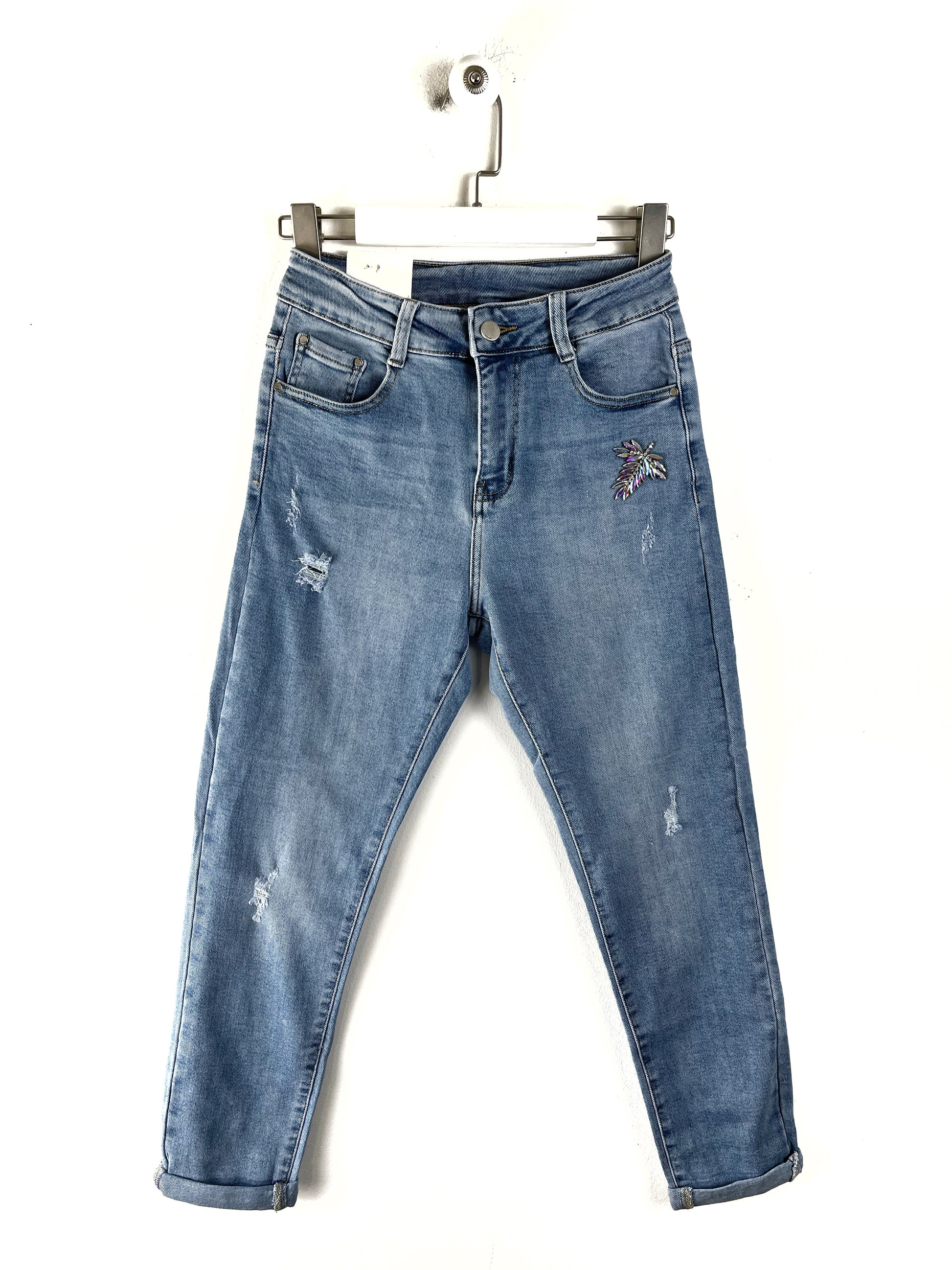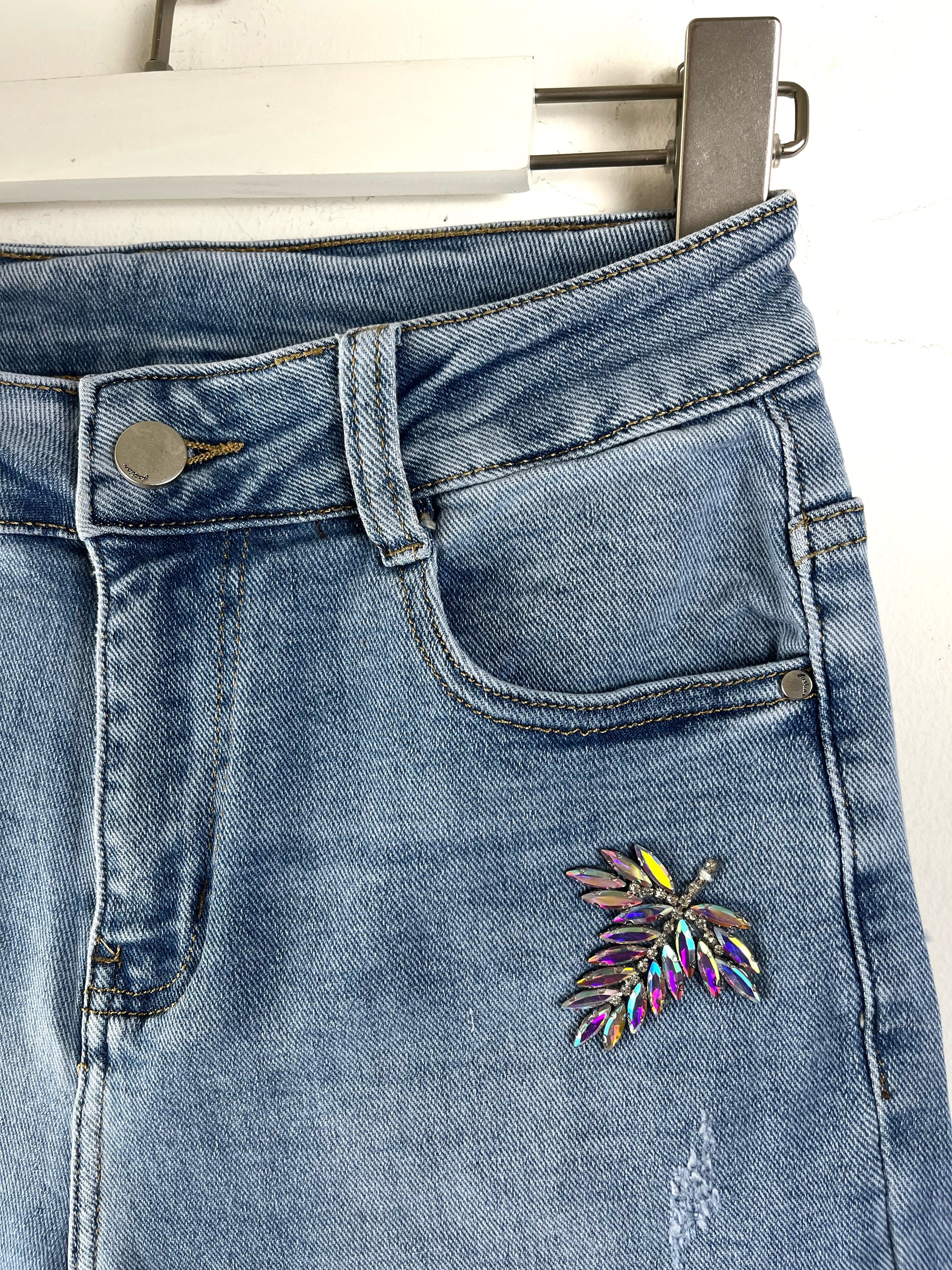 Denim di cotone lavato 5 tasche, vita alta superstretch, gamba leggermente a sigaretta. Patta con bottone e cerniera sul davanti e passanti per la cintura. Strappi sul davanti, figlia di strass applicata.