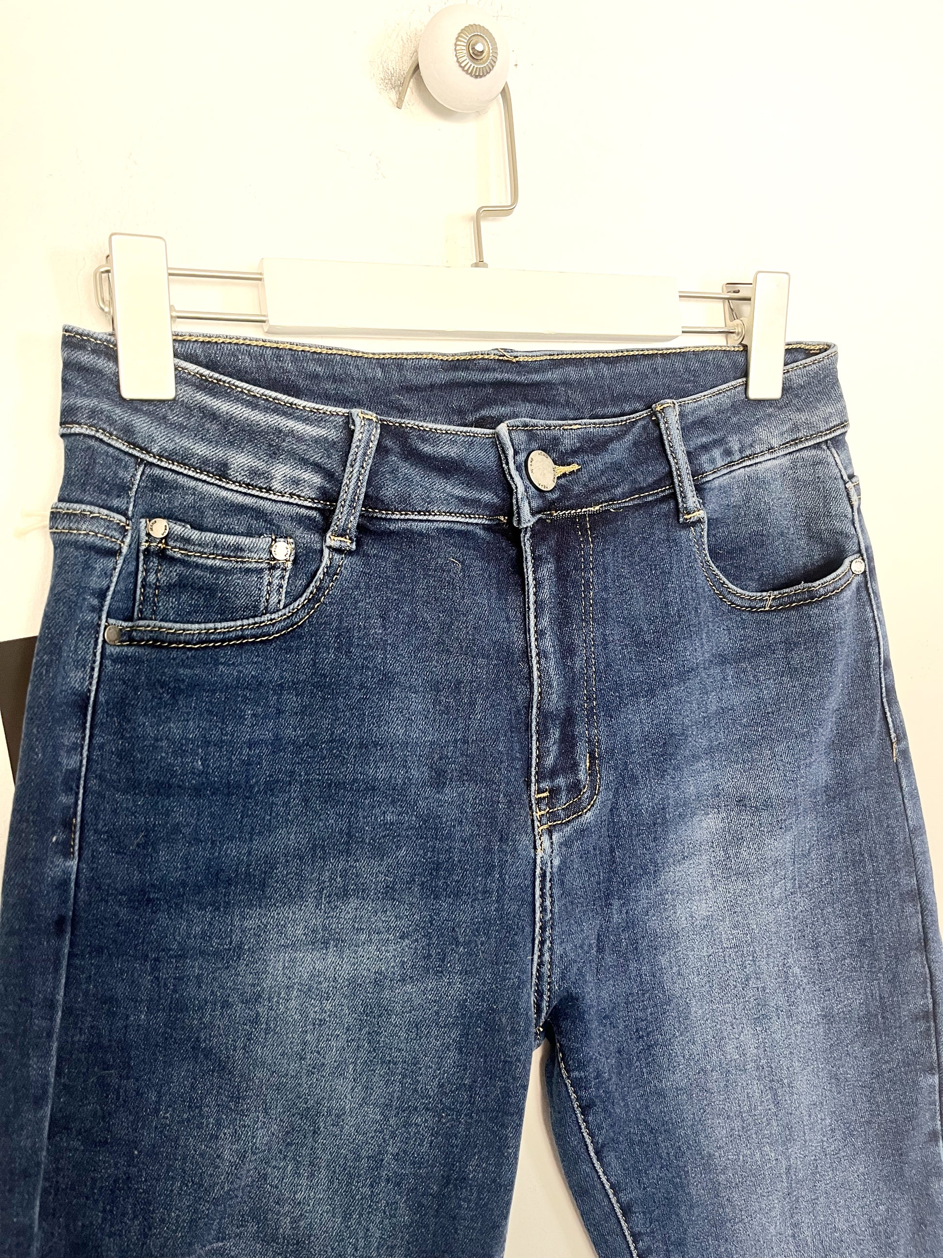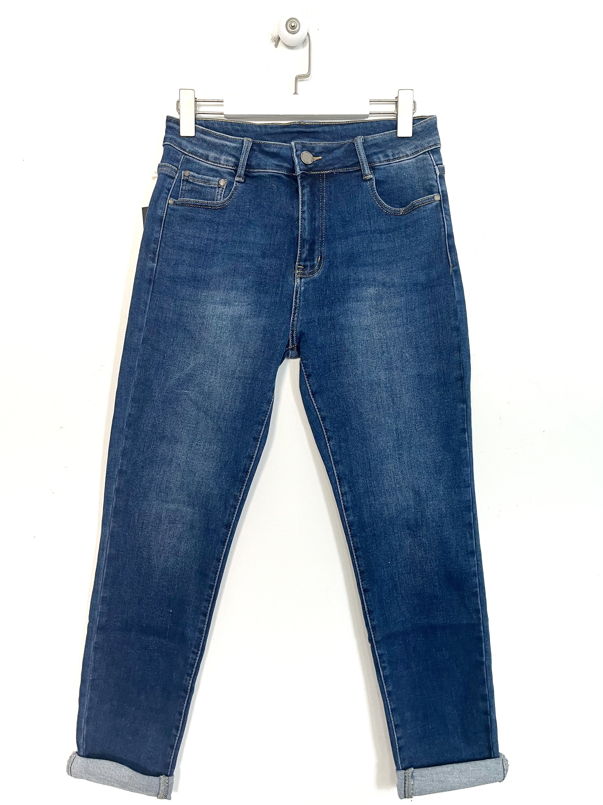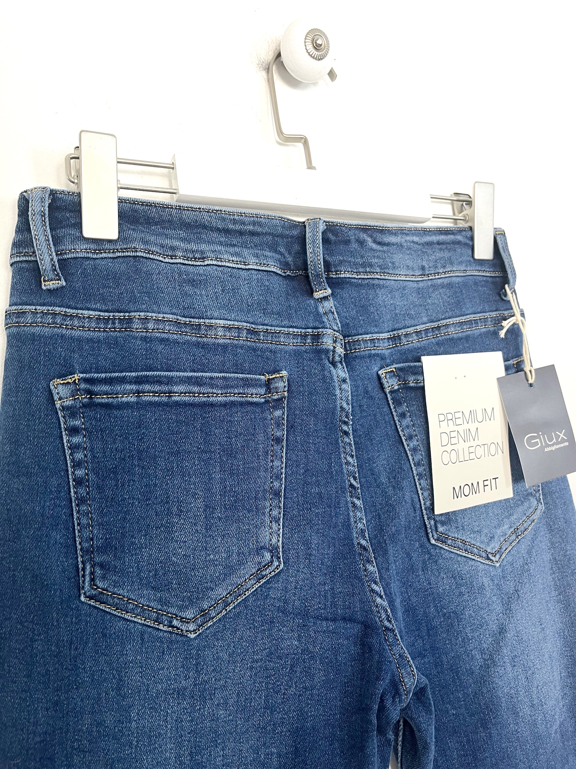 Denim di cotone estacizzato 5 tasche mum fit, vita alta superstretch, taglio comodo su fianchi e coscie, leggermente più stretto alla caviglia. Patta con bottone e cerniera e passanti per la cintura.