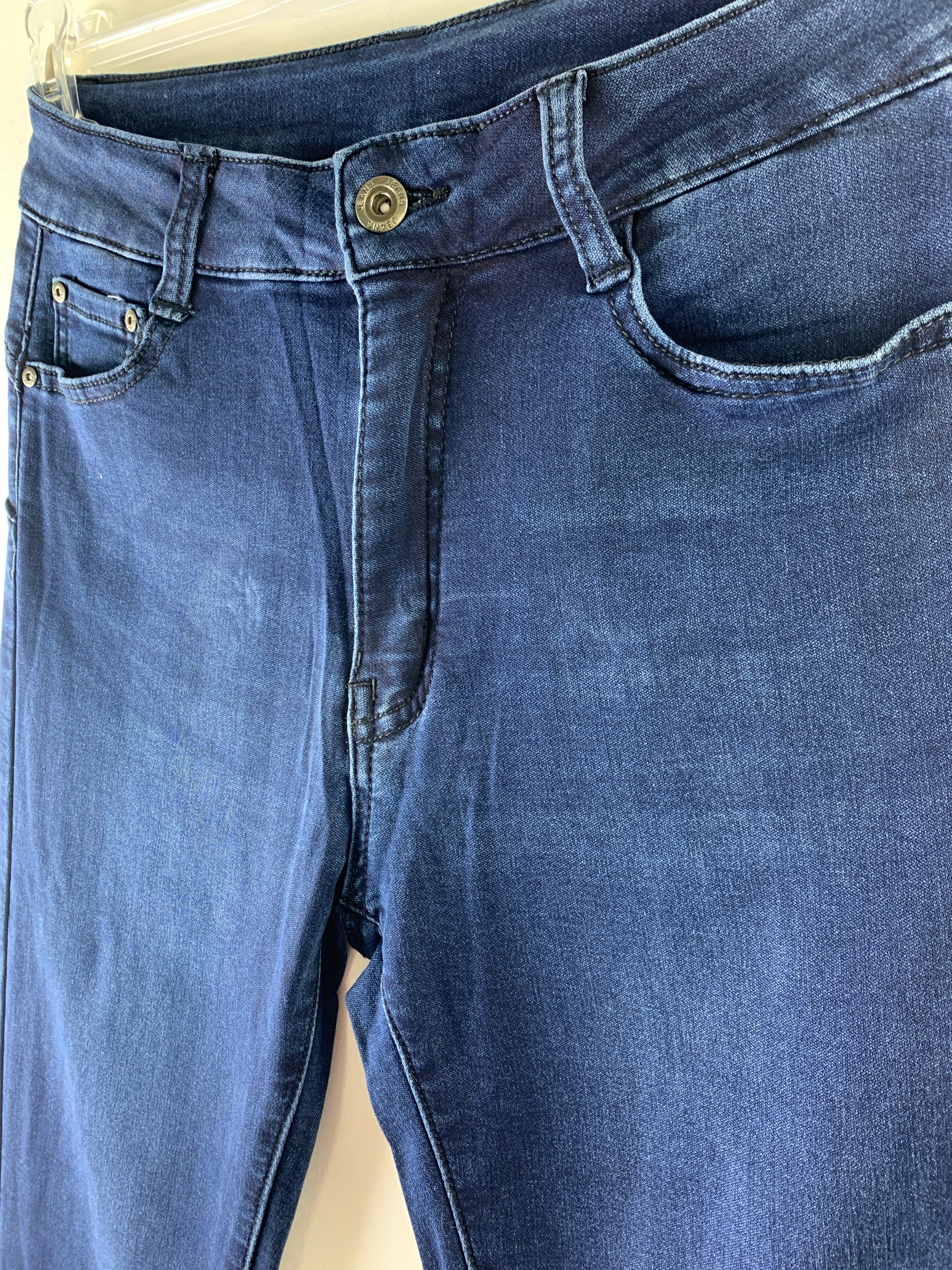 Denim 5 tasche vita alta superstretch. Gambale stretto. Patta con bottone e cerniera sul davanti e passanti per la cintura.