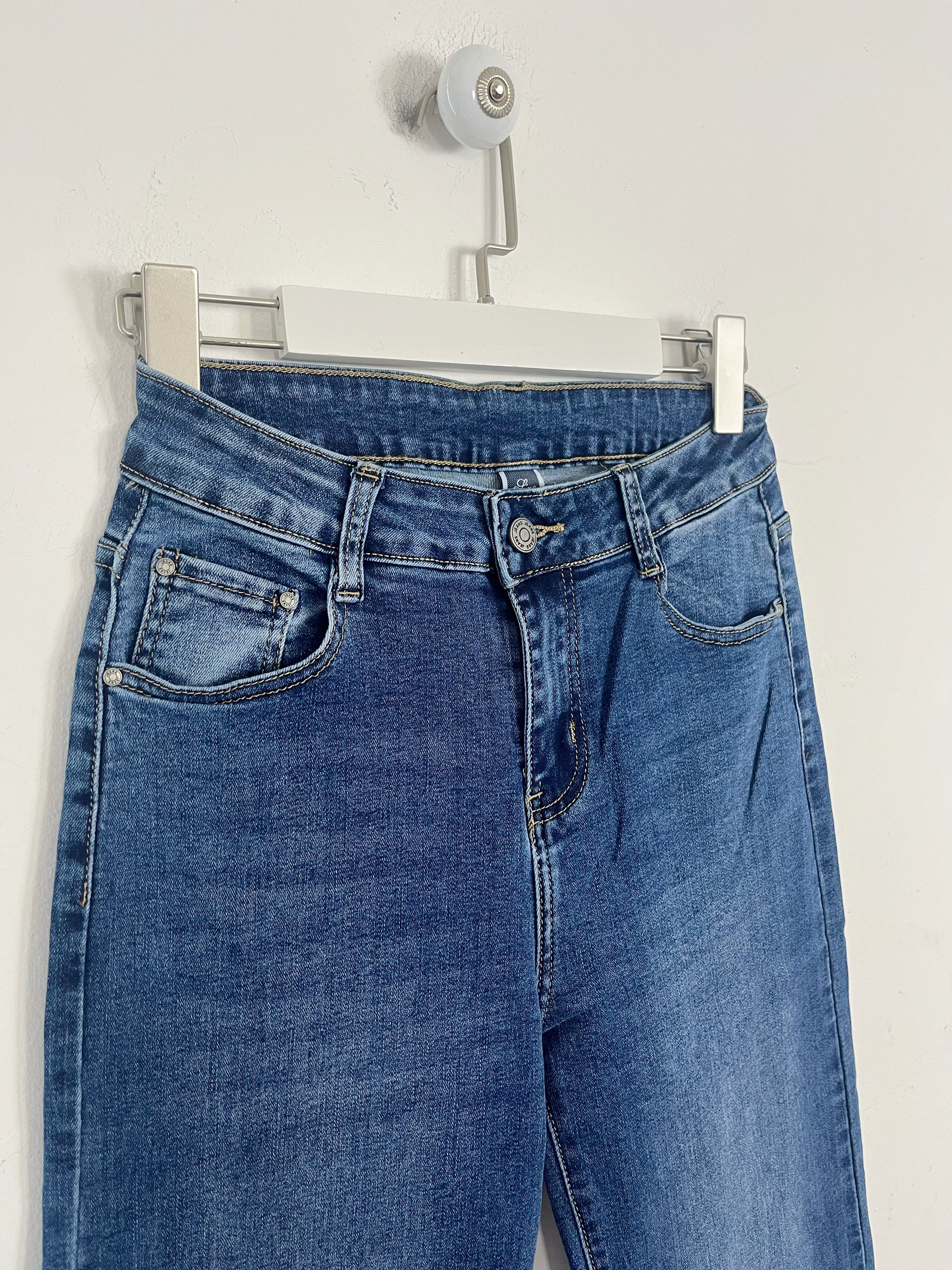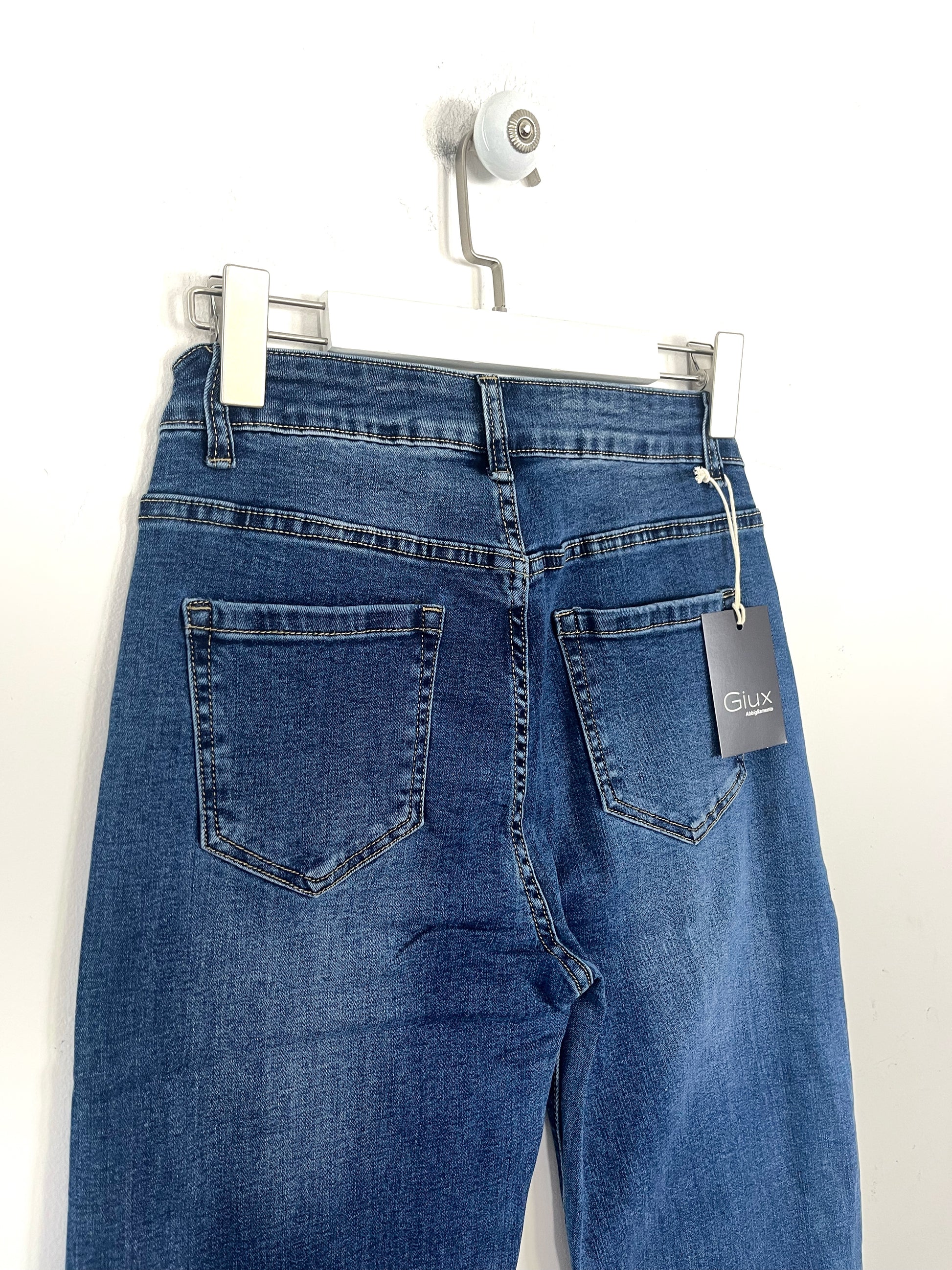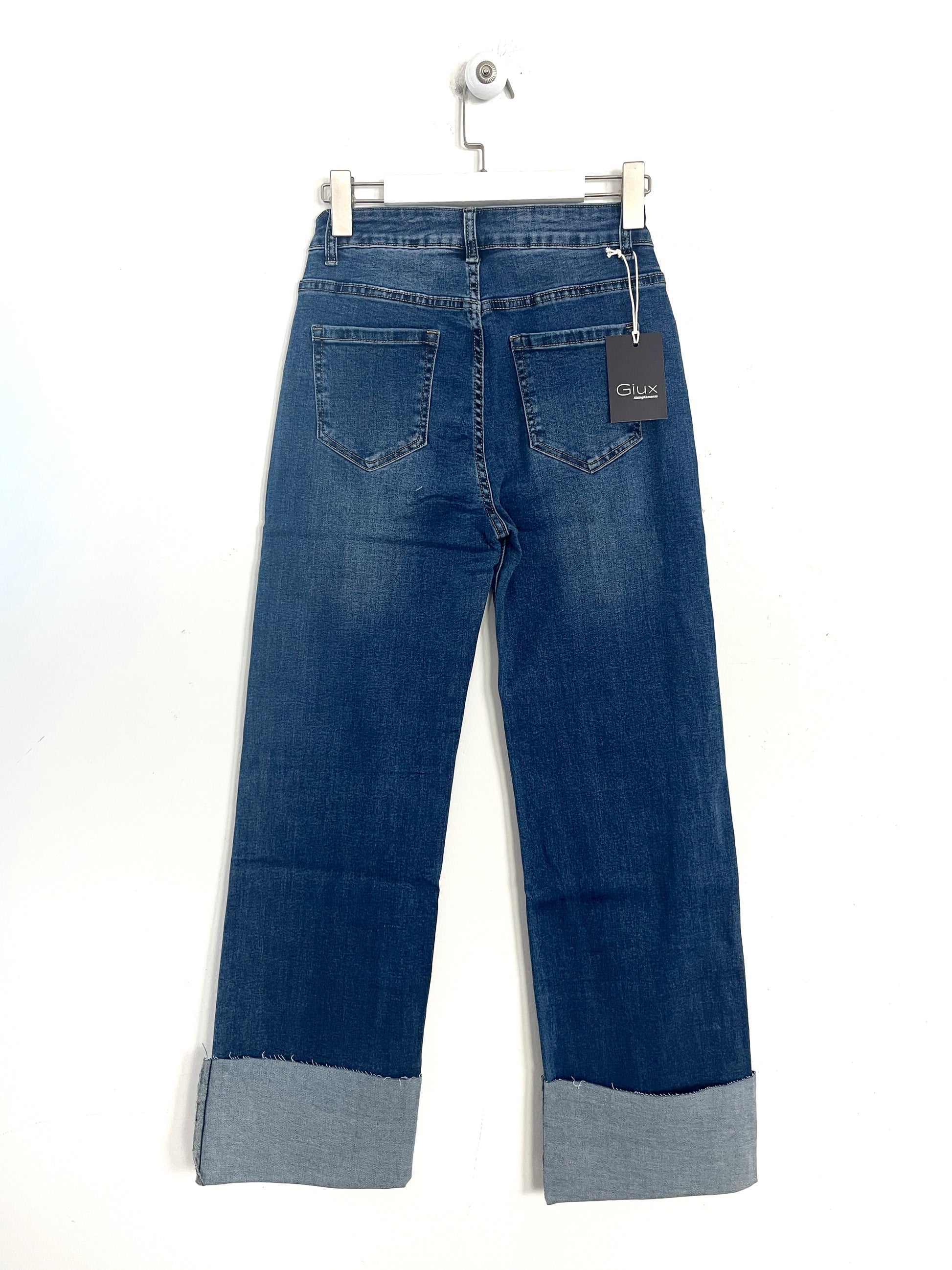 Denim 5 tasche vita alta superstretch, gamba dritta con rivolto. Patta con bottone e cerniera sul davanti e passanti per la cintura.