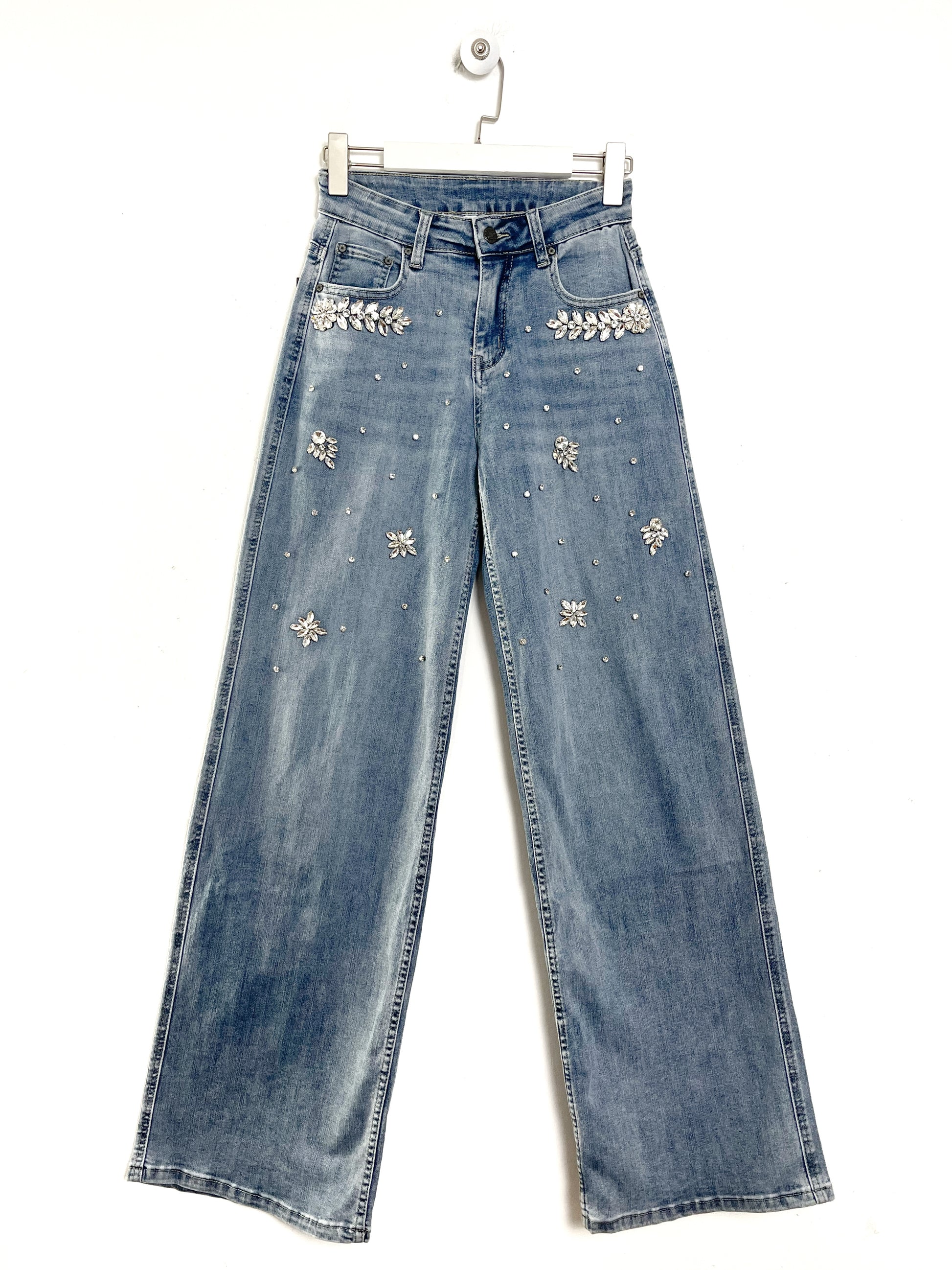 Denim 5 tasche vita alta, gamba larga a palazzo. Patta con bottone e cerniera sul davanti e passanti per la cintura. Pietre applicate
