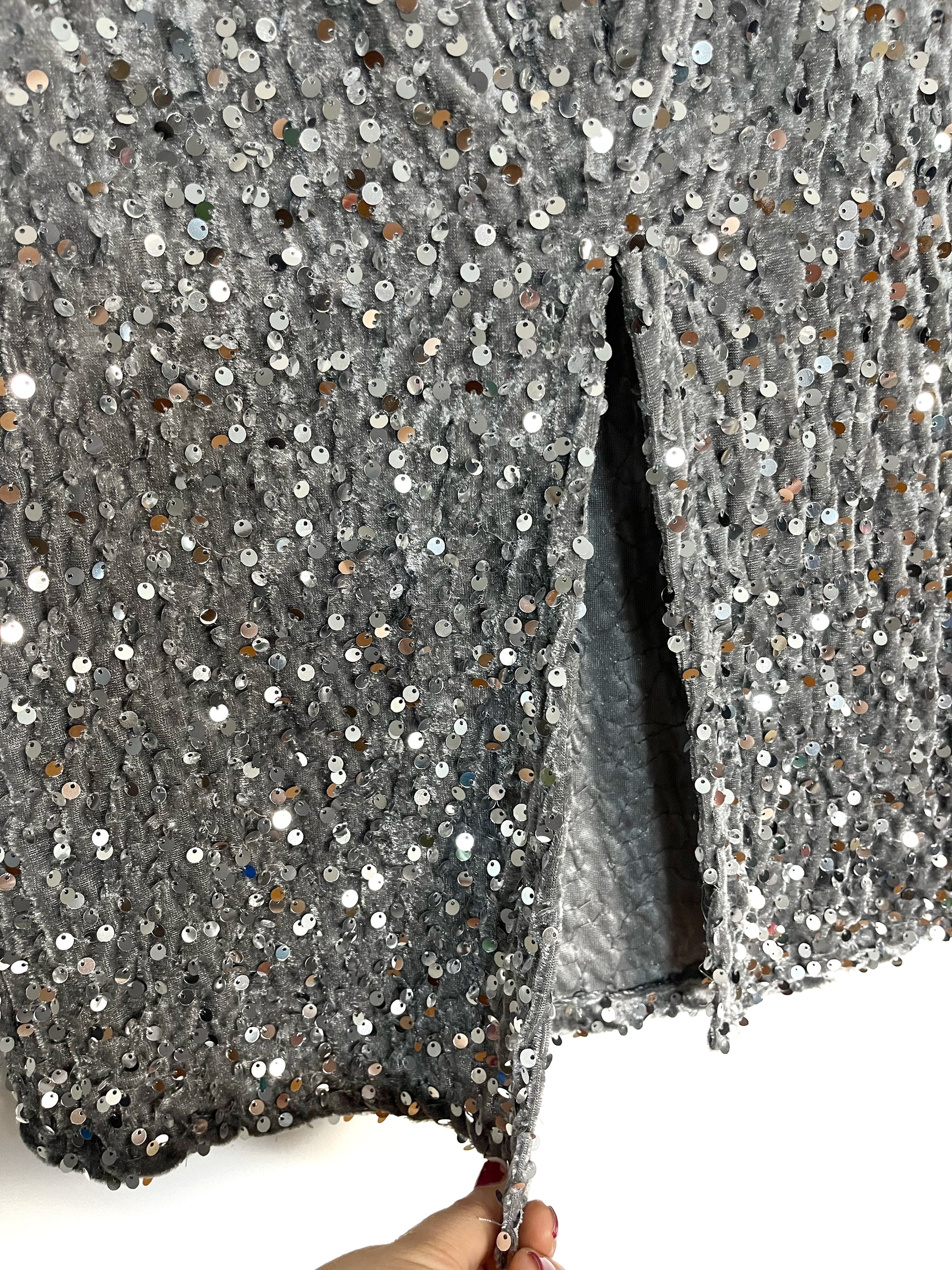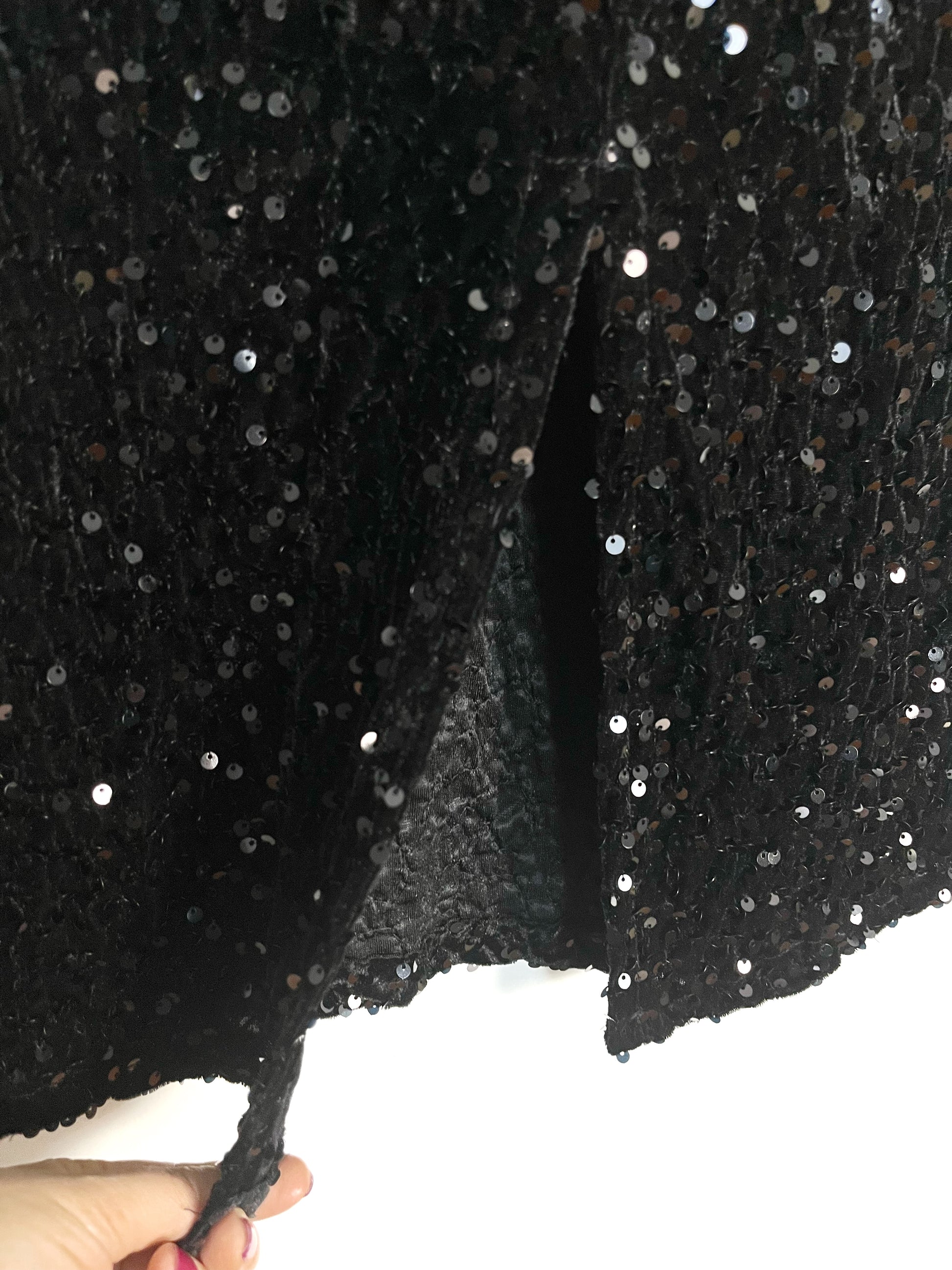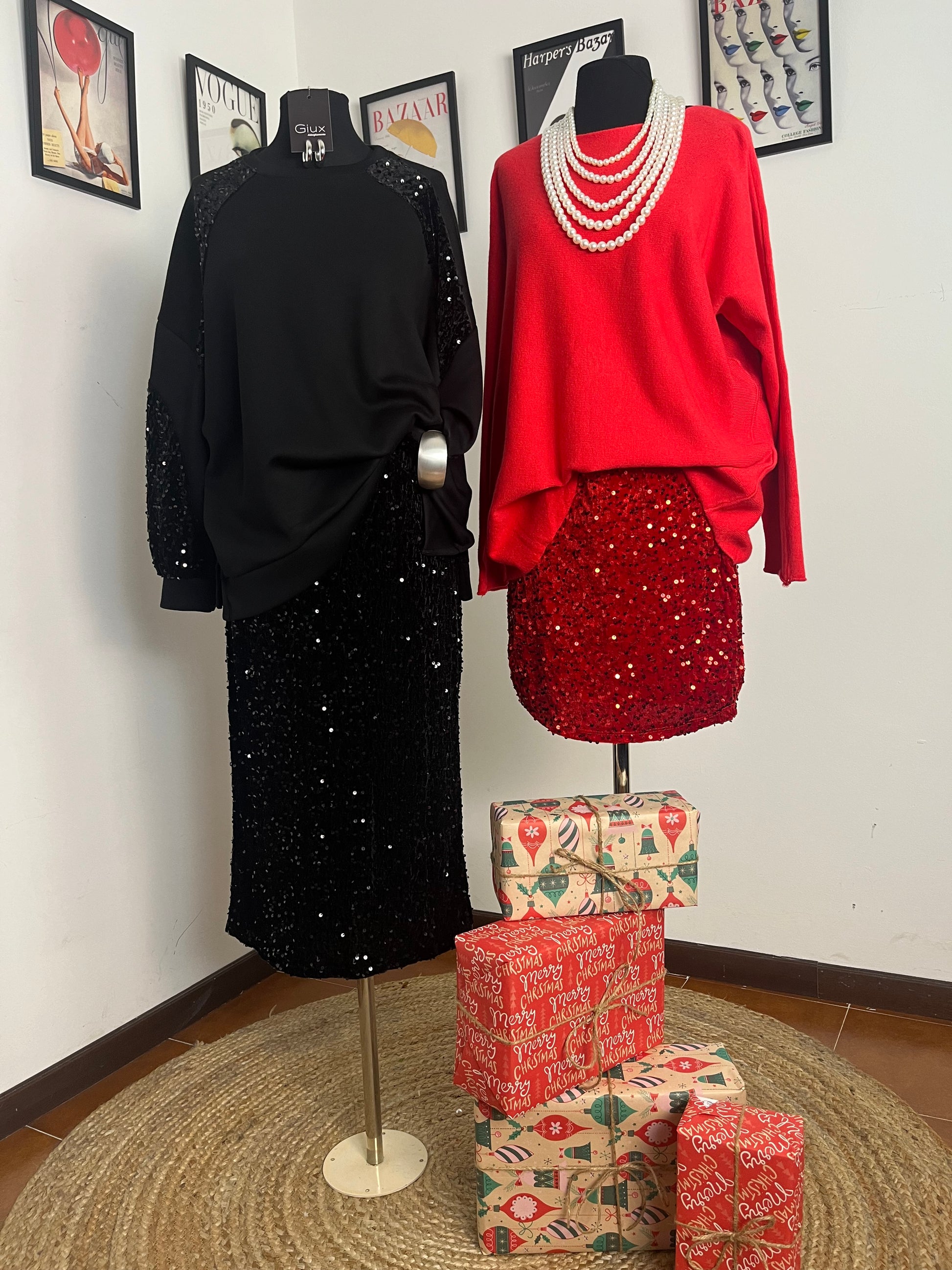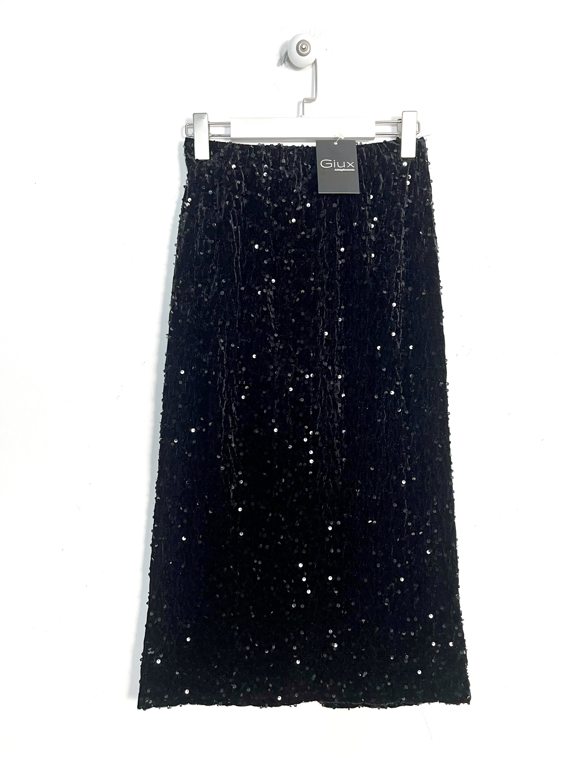 Longuette in ciniglia e paillettes con spacco dietro alto 30 cm, fasciante ed elasticizzata. Foderata.