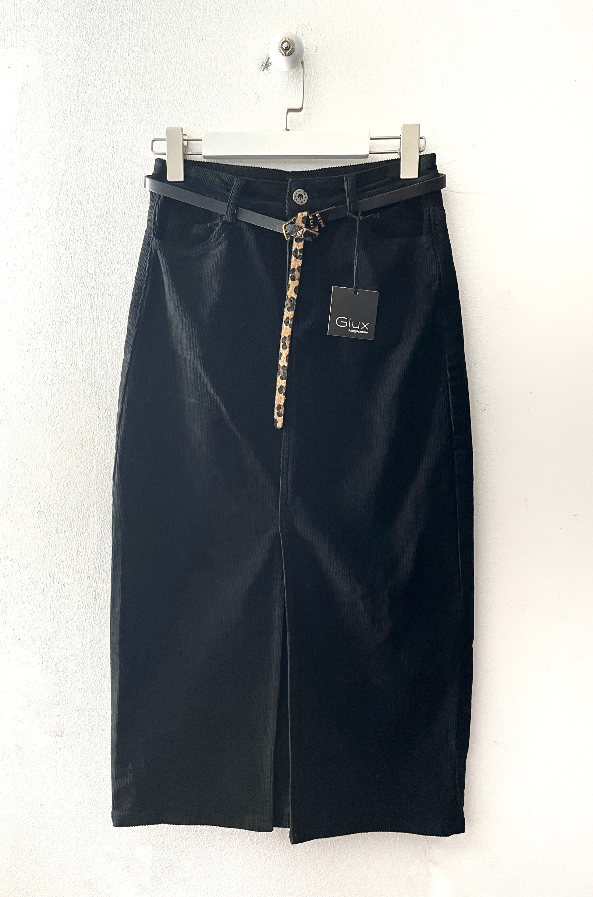 Longuette in velluto mille righe con vita alta, chiusura con bottone e cerniera. 5 Tasche con spacco davanti lungo 35 cm. Lunghezza midi