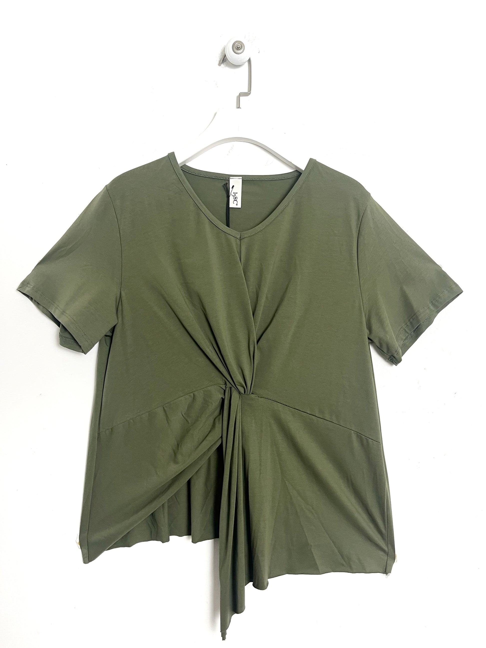 Maglia con leggera scollatura a V in cotone. Mezza manica, Asimmetrica con nodo intrecciato sul davanti.