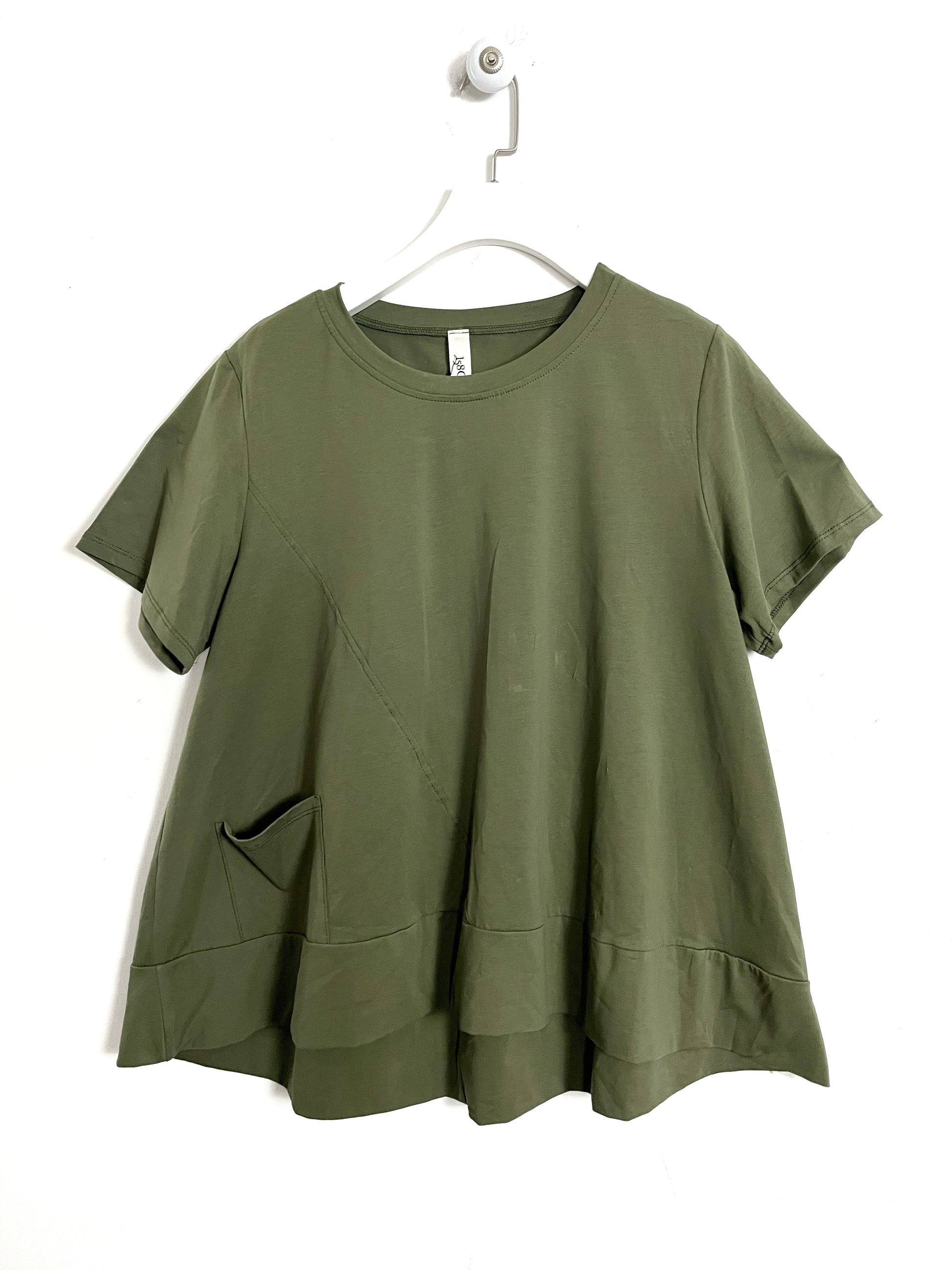 Maglia in cotone girocollo. Mezza manica, Asimmetrica svasata sul fondo con fascia in tela di cotone. Più lunga dietro. Taschina laterale applicata.