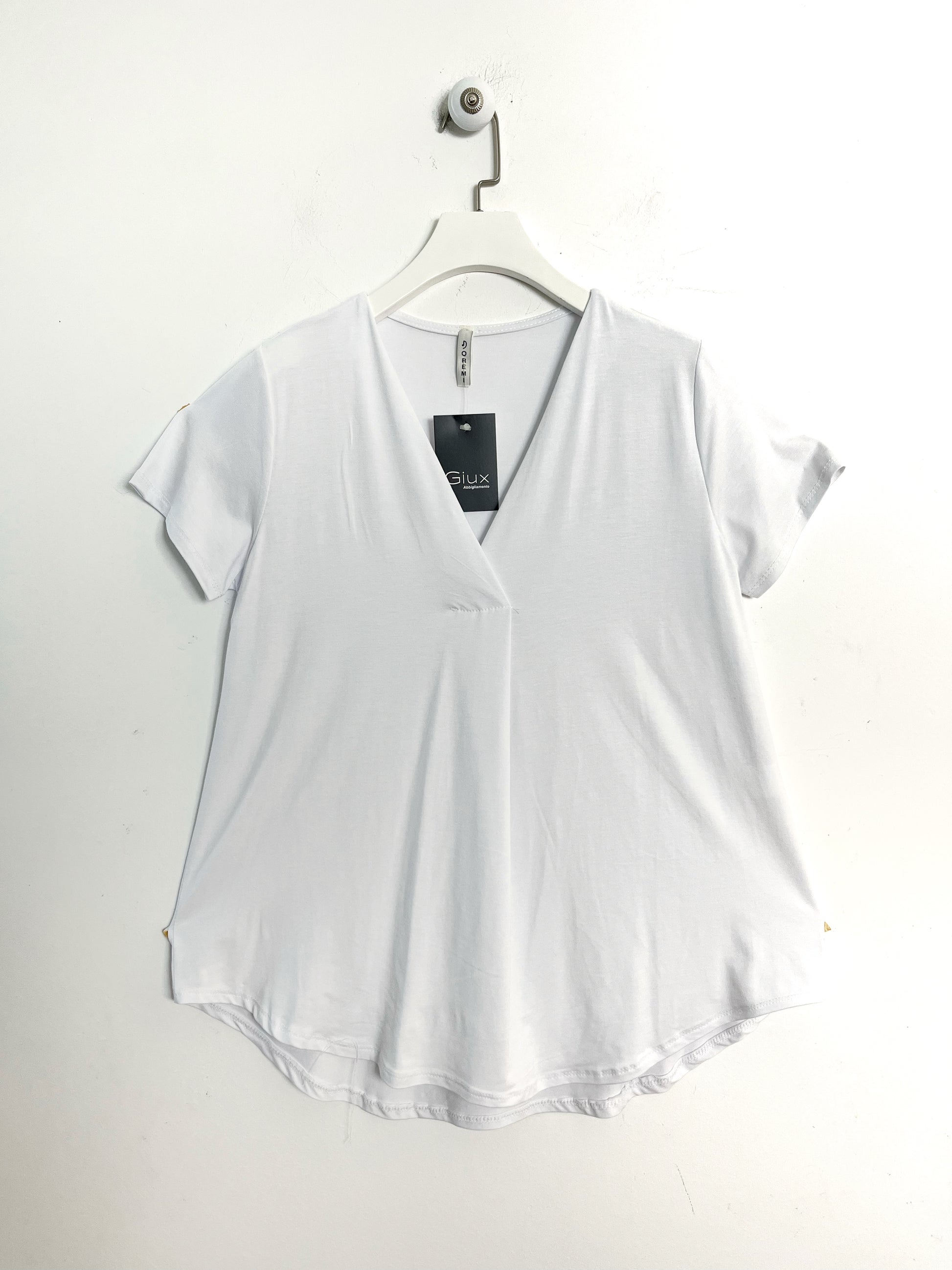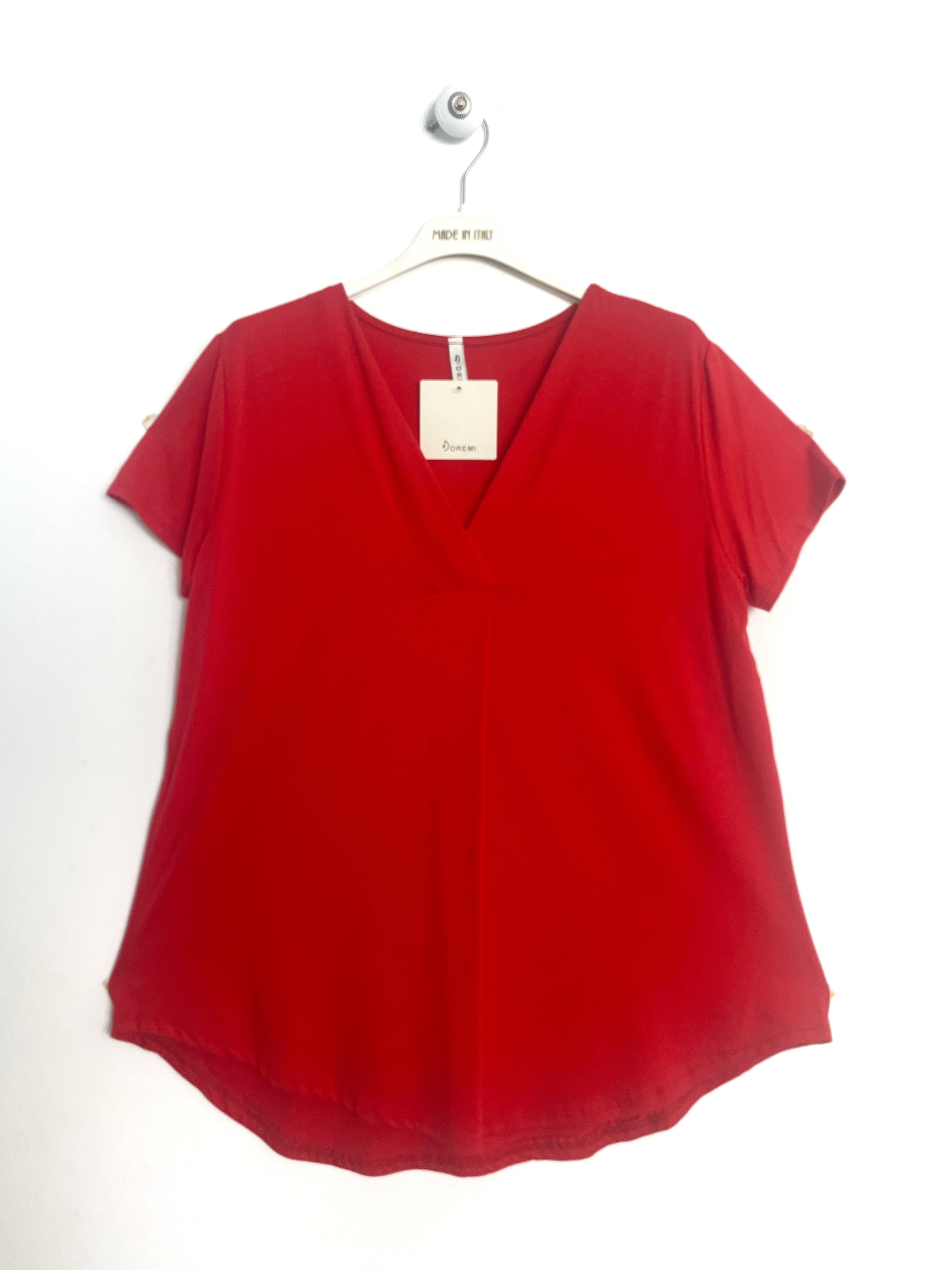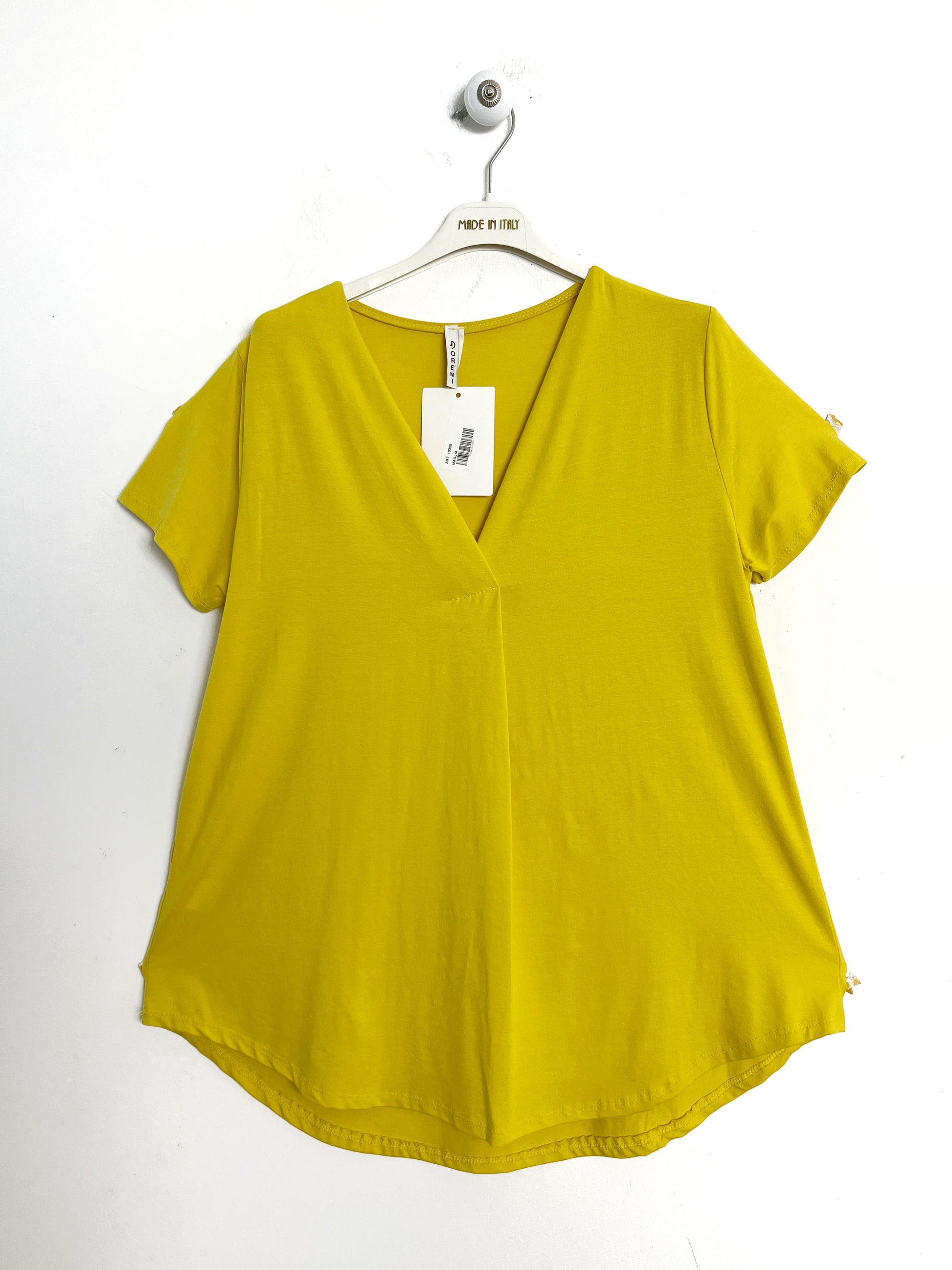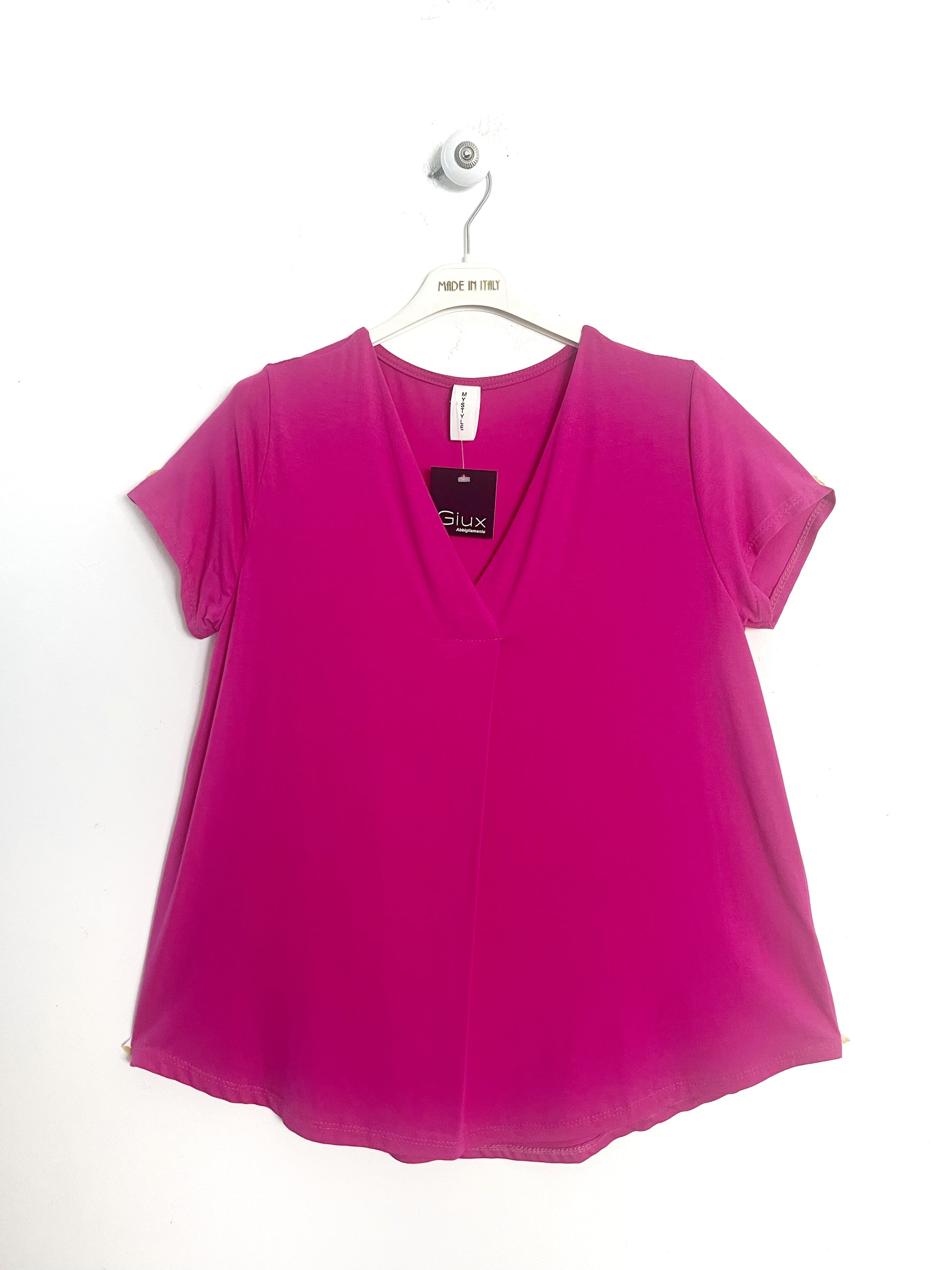 Maglia in viscosa rigata, scollatura a V, manica lunga. Stondata sul fondo, piega sul seno.