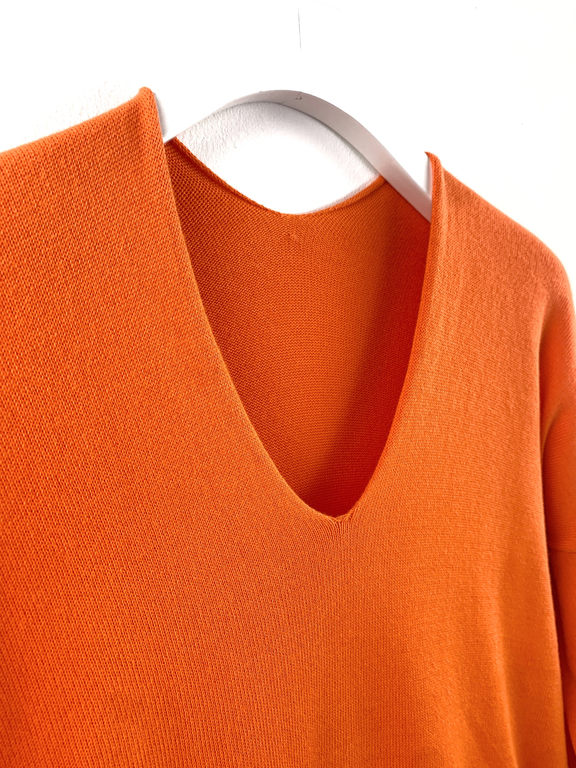 Pullover in morbido cotone con scollo a V. Spalle basse e maniche lunghe. Spacchi laterali sul fondo, leggermente più lunga dietro.