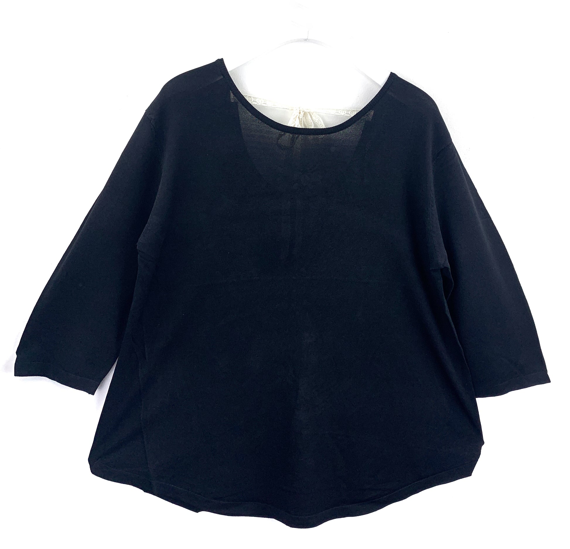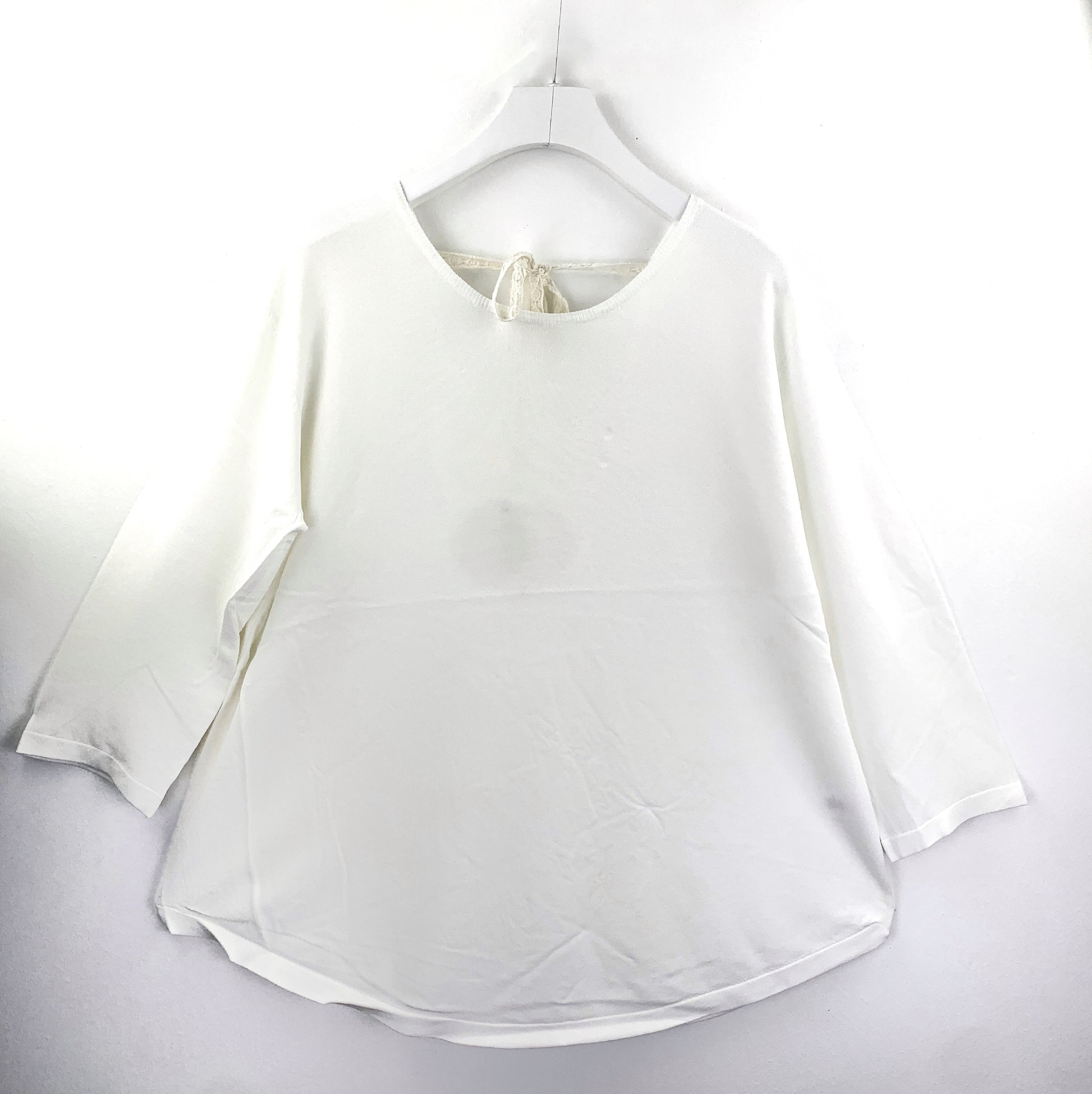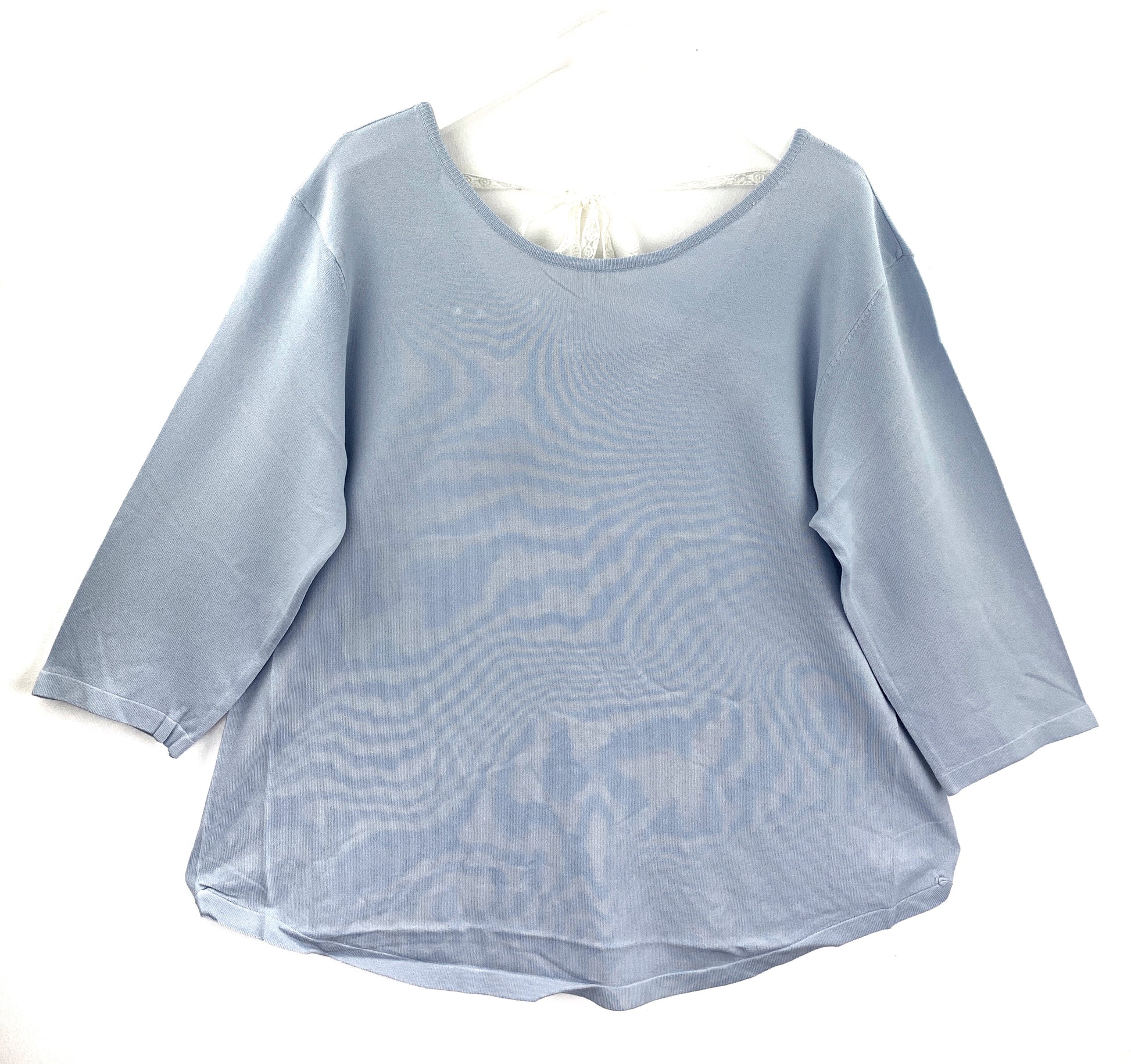 Maglia con scollatura a barchetta. Manica tre quarti, svasata sul fondo. Scollatura a goccia dietro, legata da un laccio in pizzo.