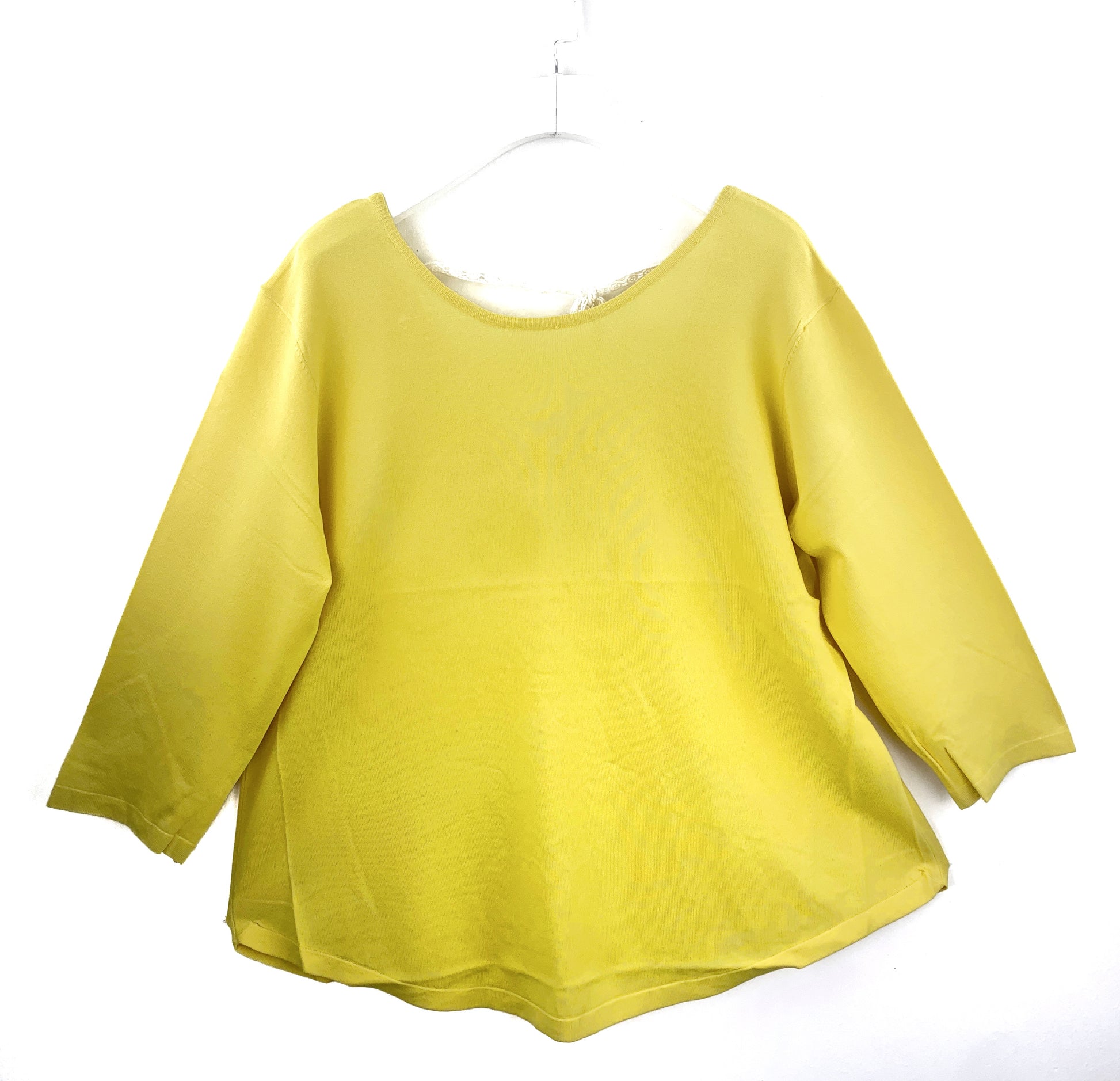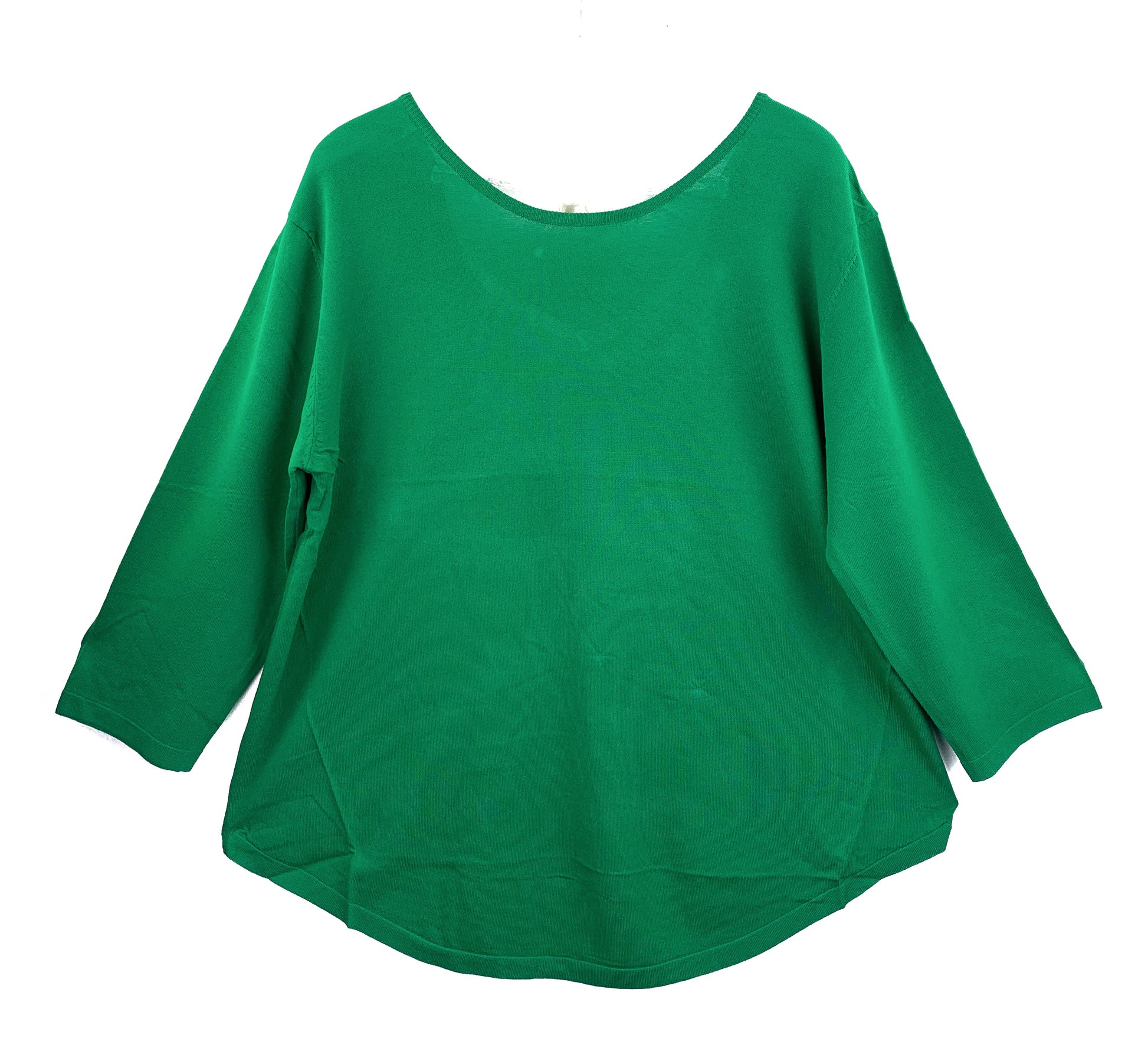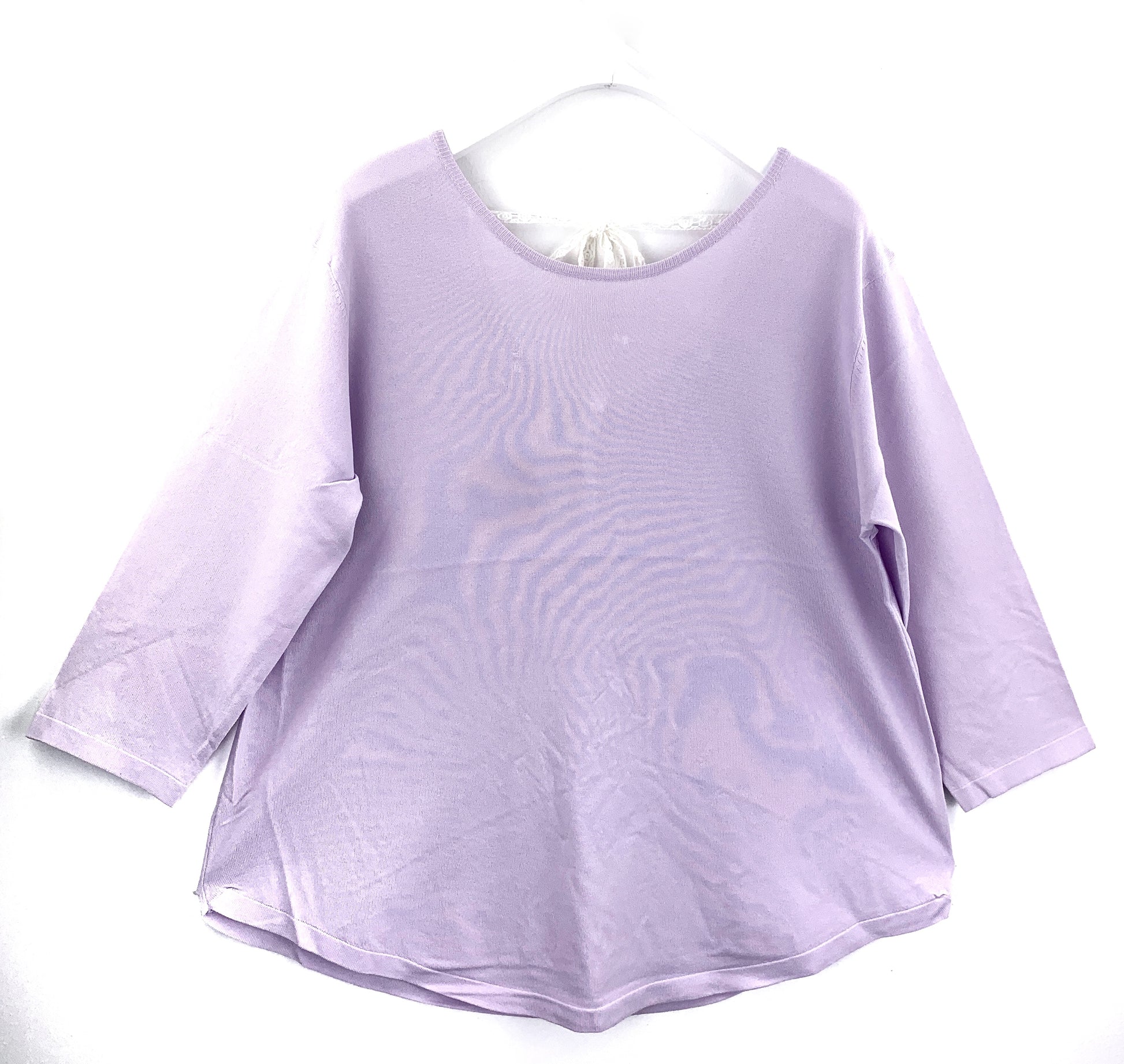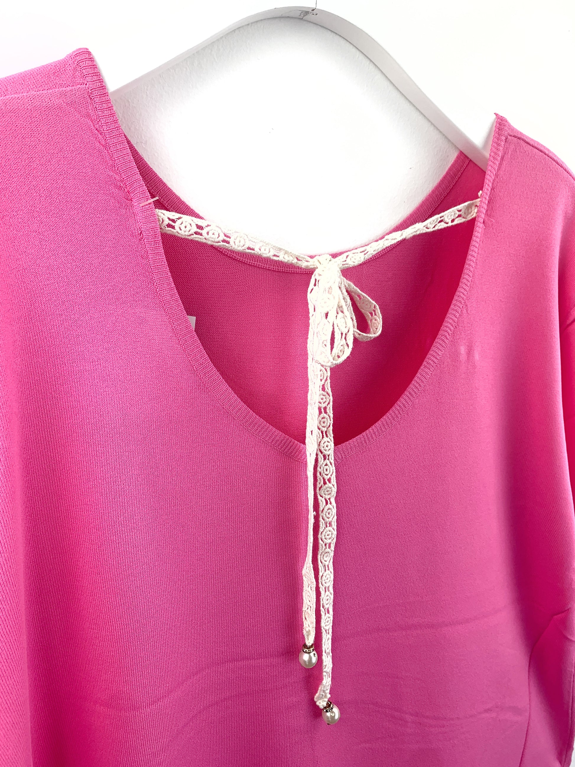 Maglia con scollatura a barchetta. Manica tre quarti, svasata sul fondo. Scollatura a goccia dietro, legata da un laccio in pizzo.