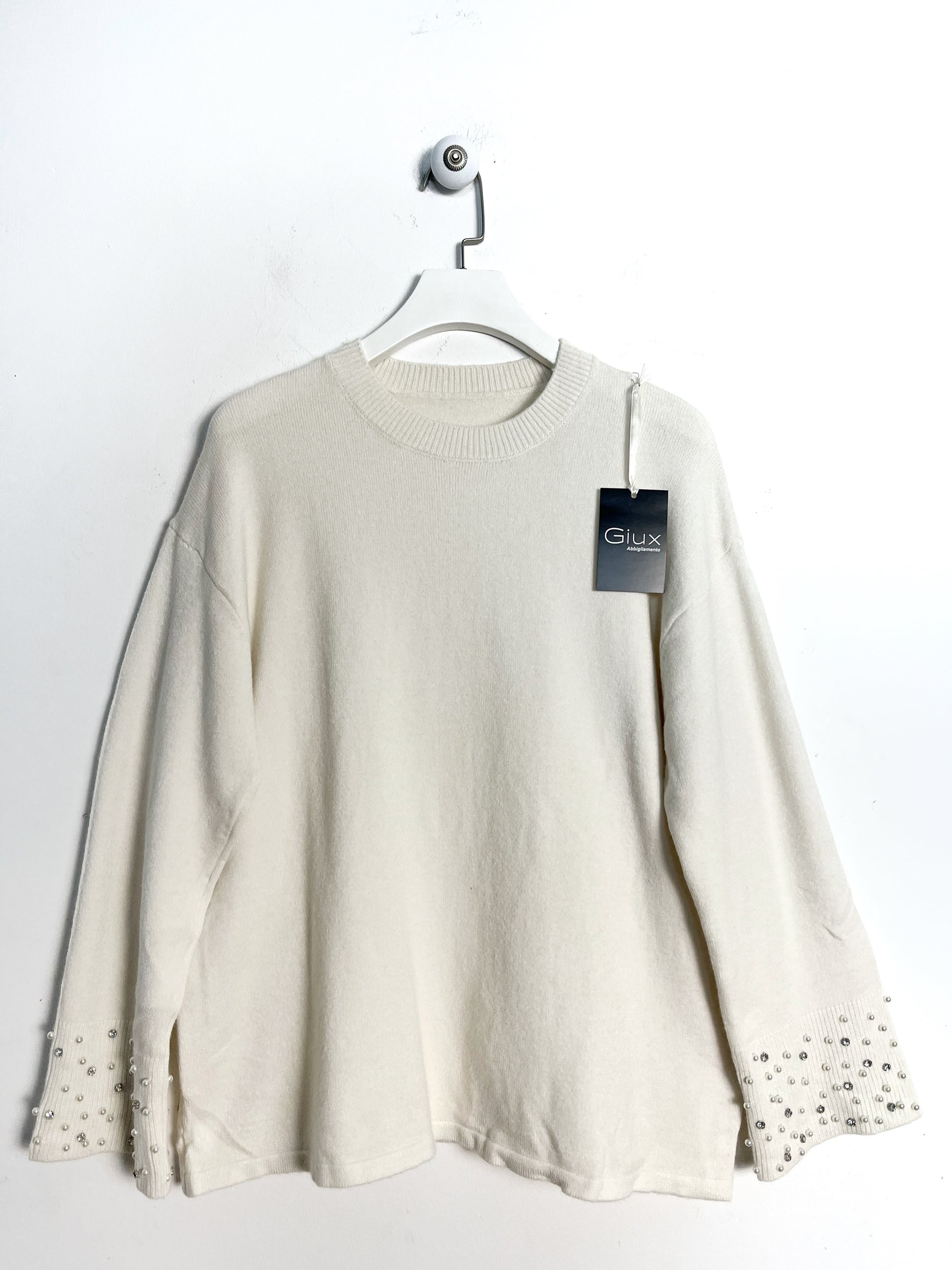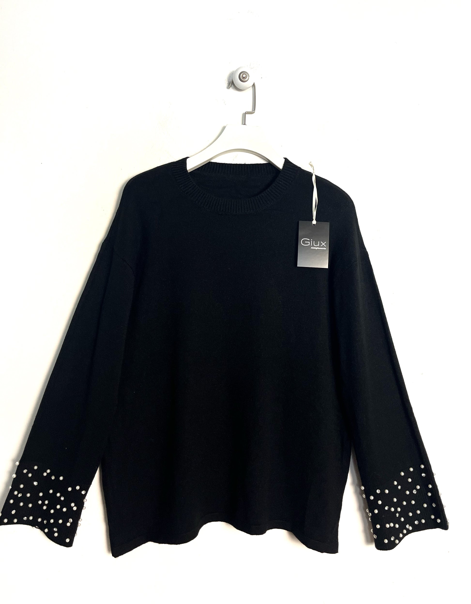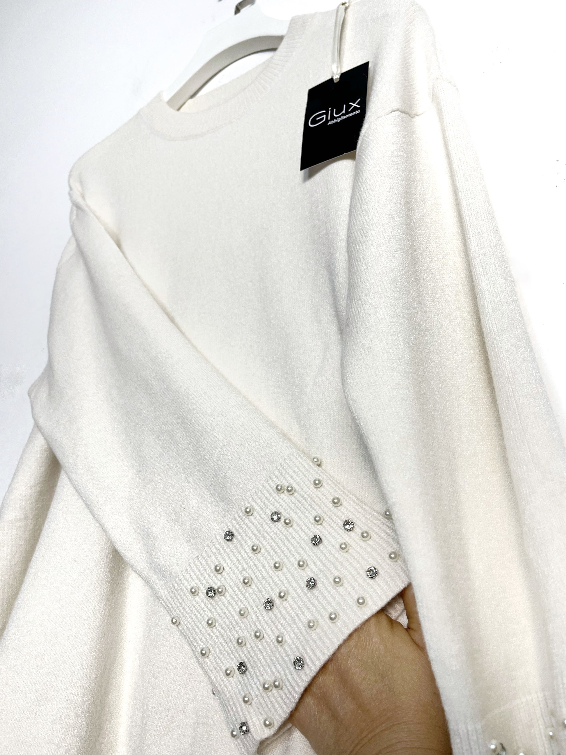 Maglia girocollo in calda viscosa, perle e strass applicate sul polsino. Vestibilita morbida