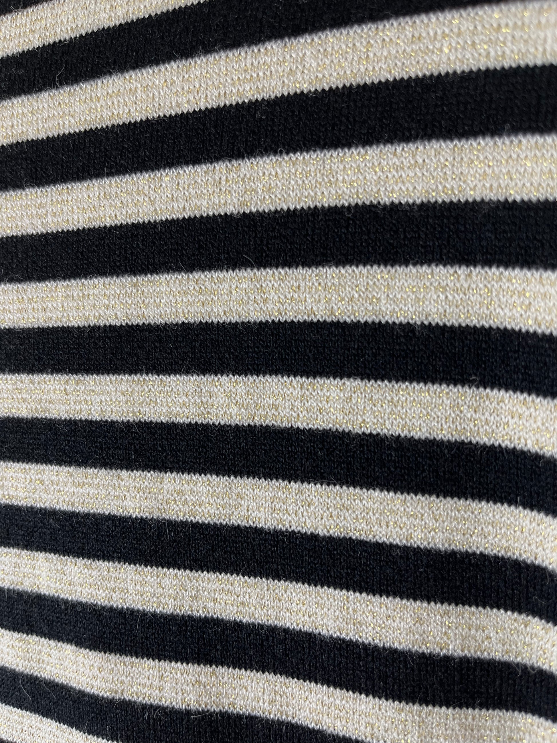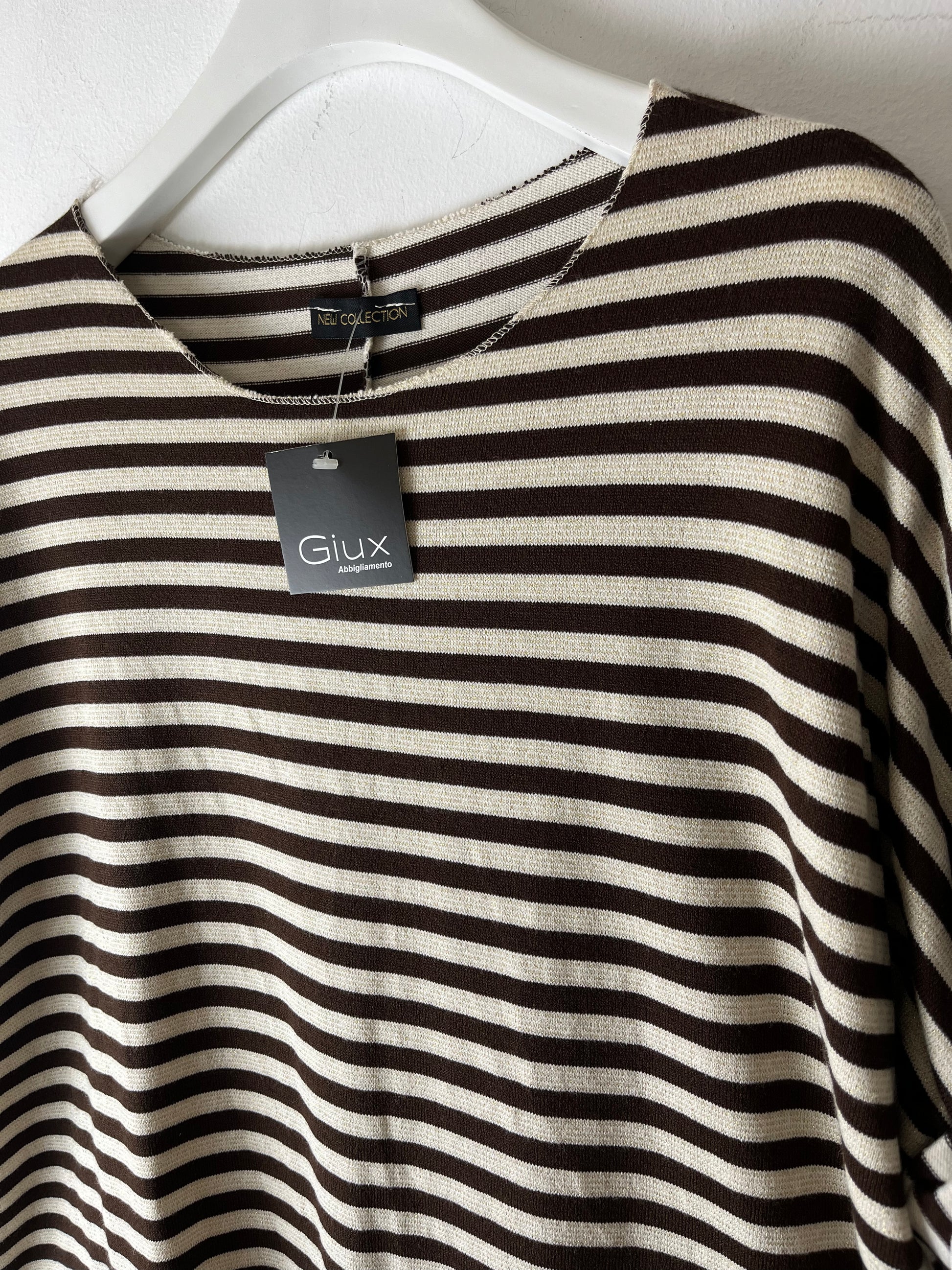 Maglia in viscosa rigata manica tre lunga, girocollo. Righe in lurex. Vestibilità morbida, spalla ribassata