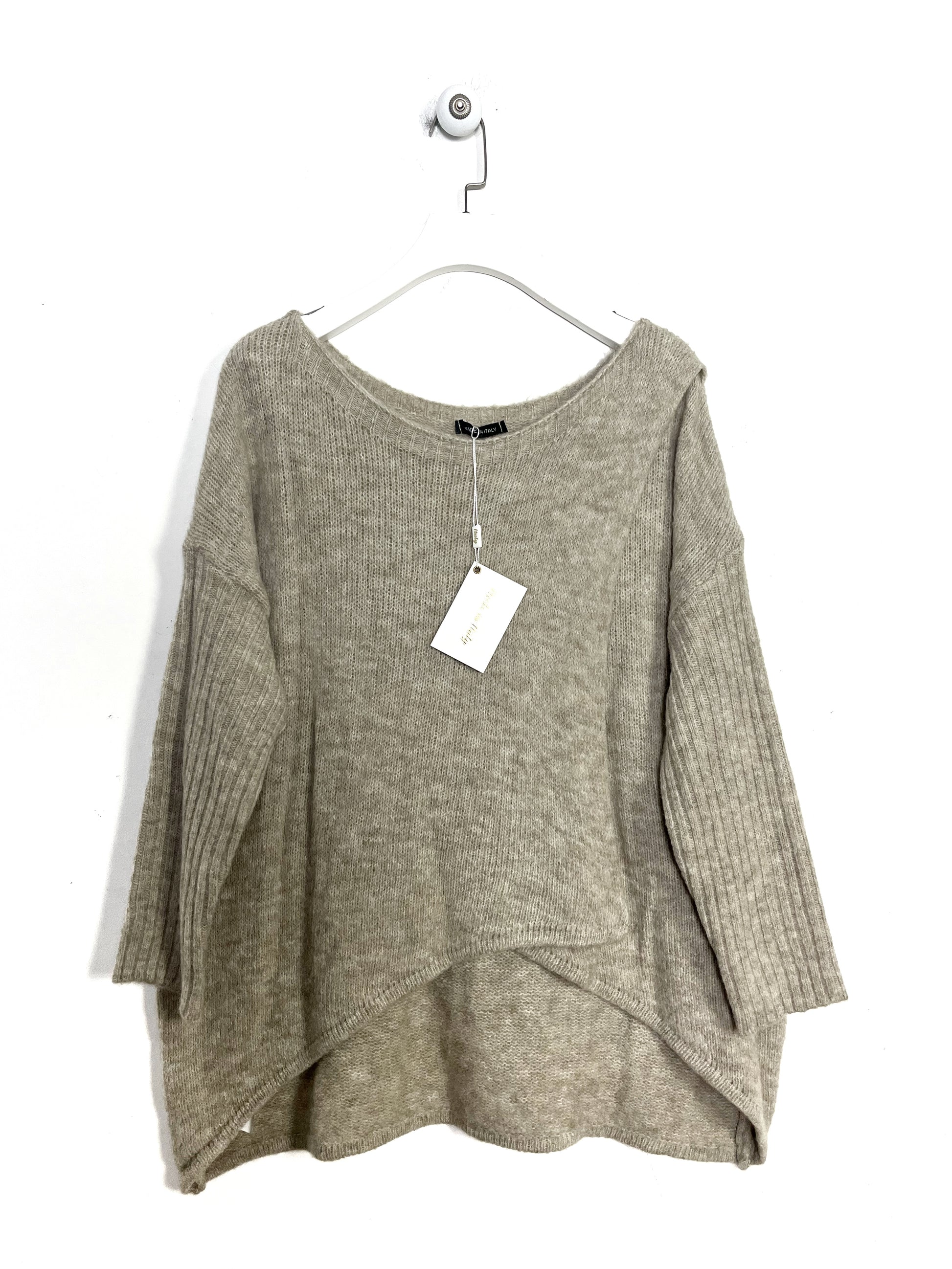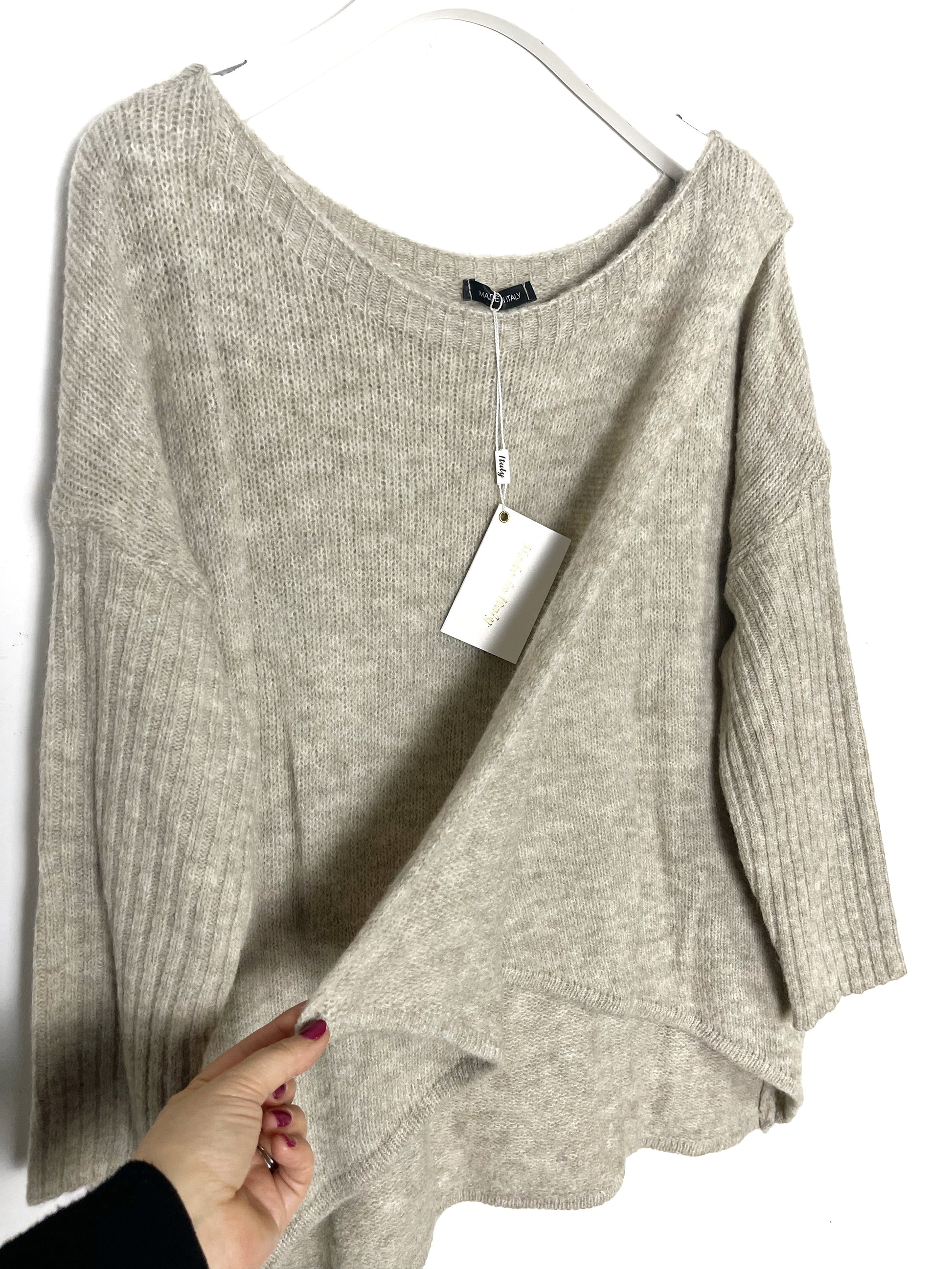 Maglioncino con scollatura a barchetta girocollo a portafoglio. Incrocio sul davanti, più lunga dietro. Spalla ribassata. Maniche lunghe a coste