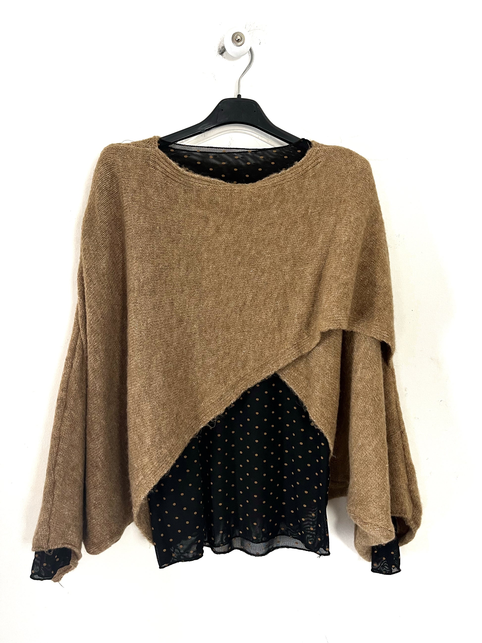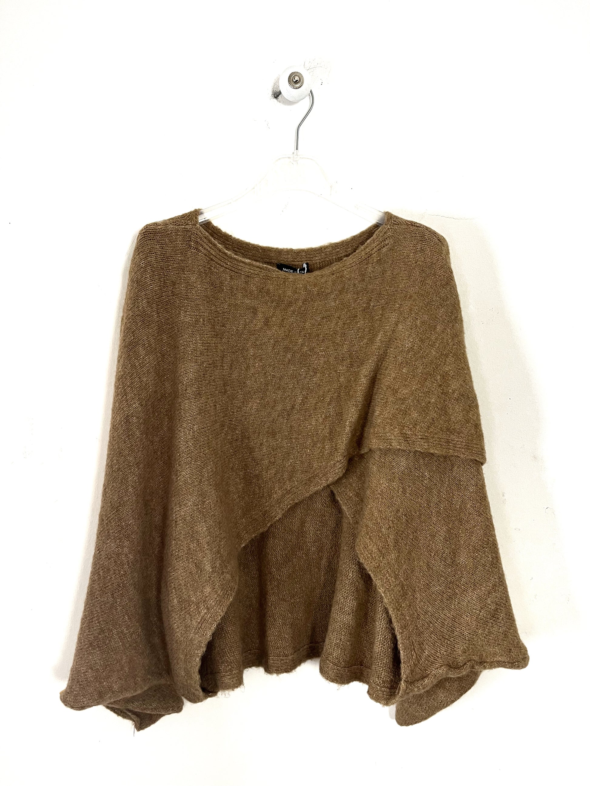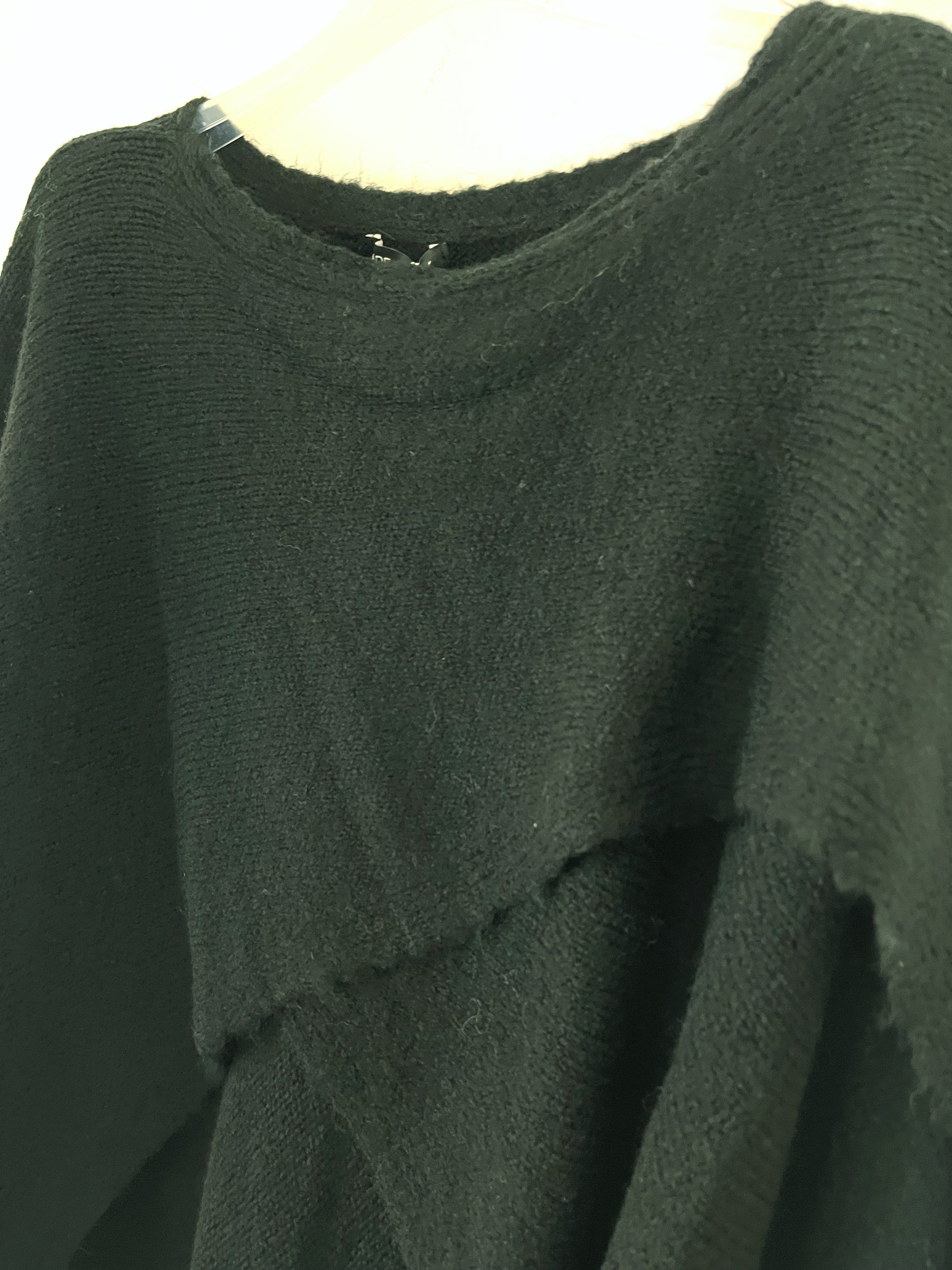 Maglioncino girocollo a portafoglio cropped. Incrocio sul davanti, più lunga dietro. Spalla ribassata.