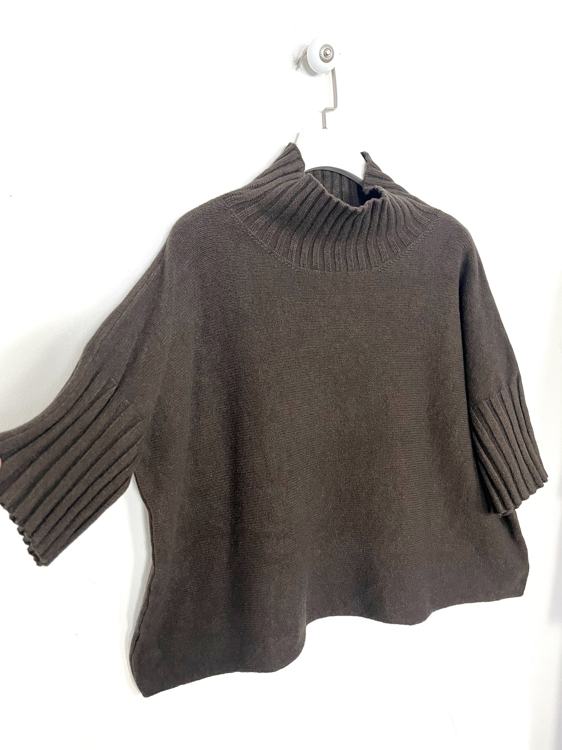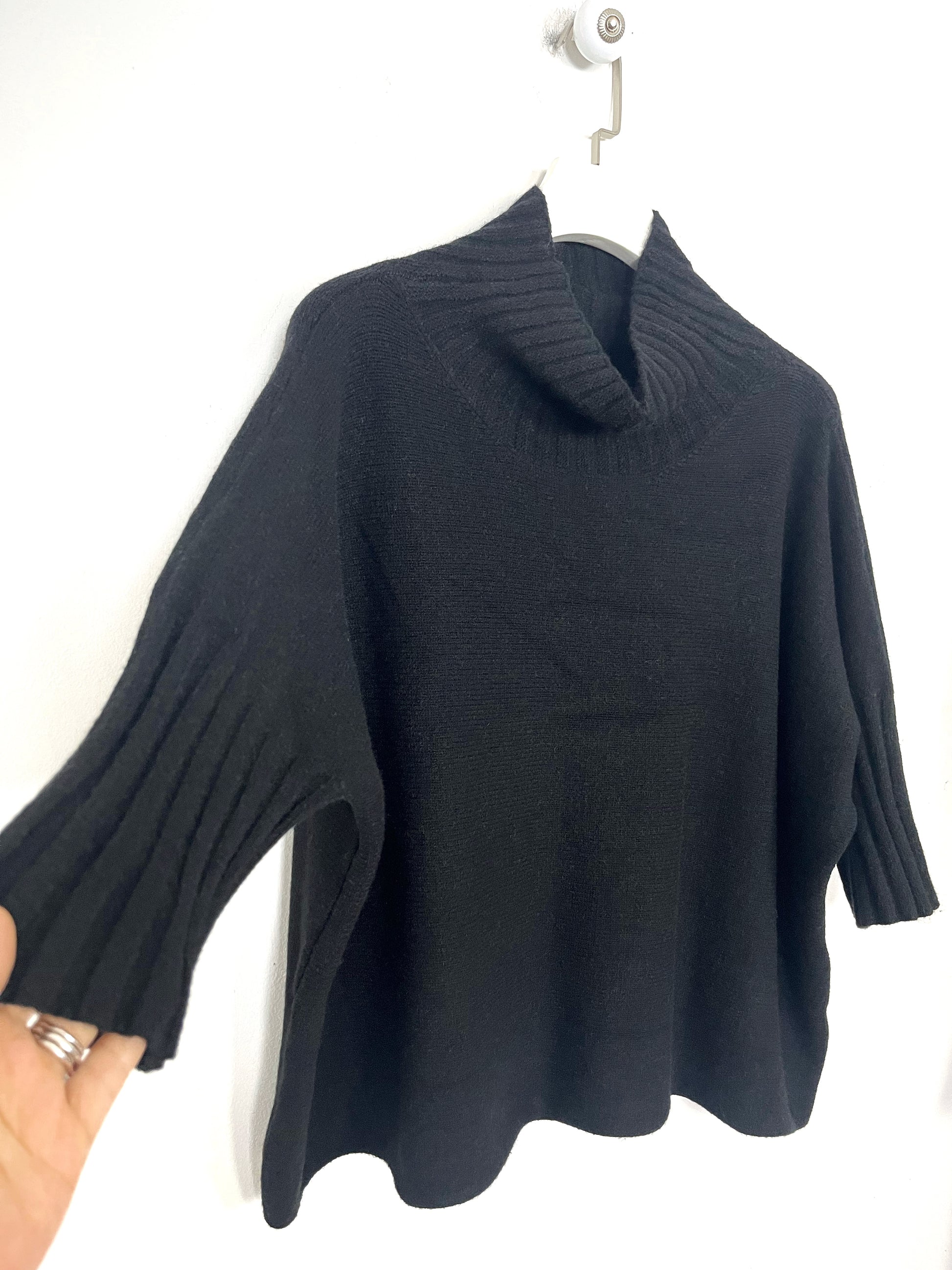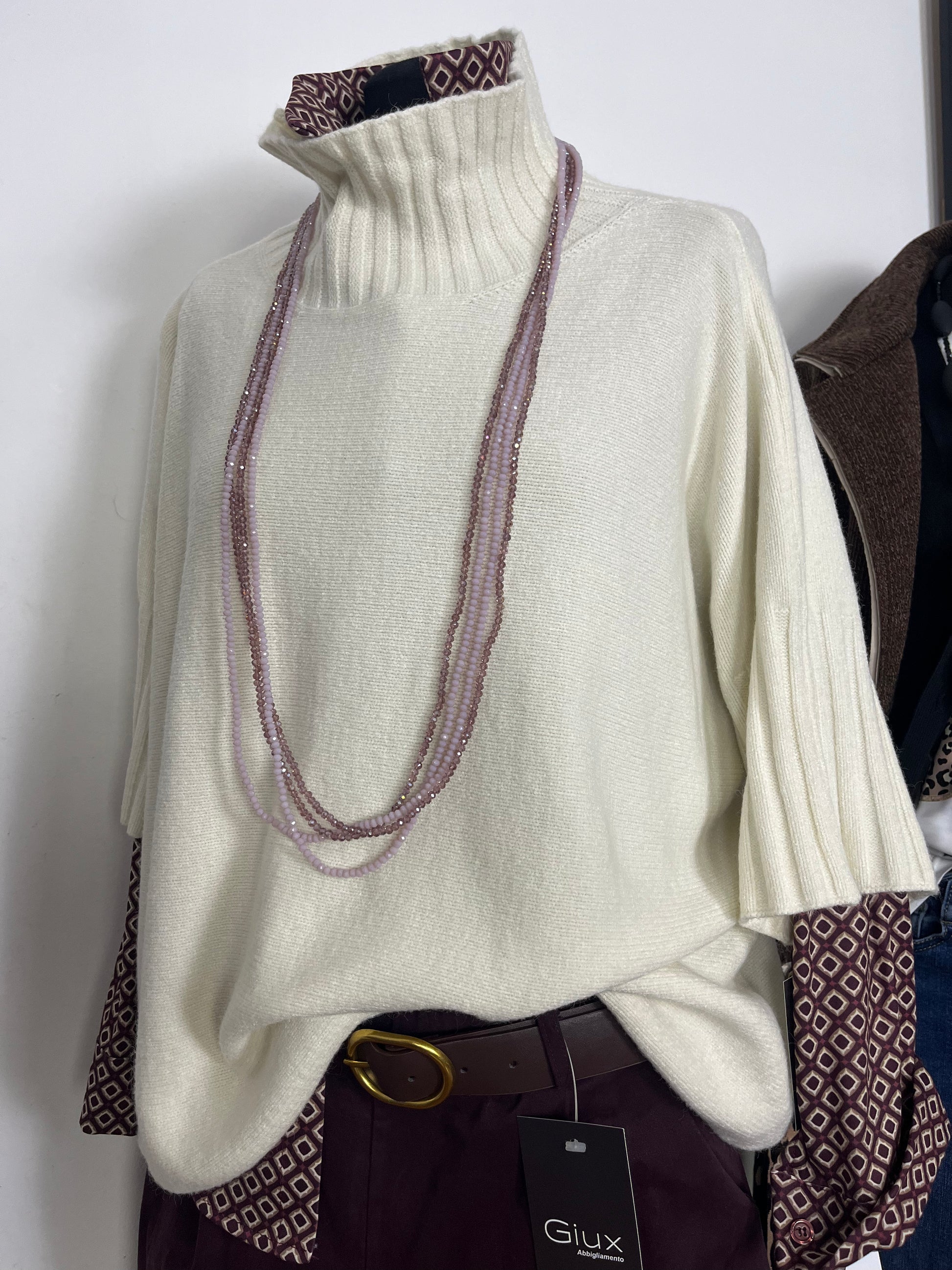 Maglioncino in calda viscosa, collo morbido a lupetto. Manica tre quarti, vestibilità over. Taglio a scatoletta Spalla ribassata
