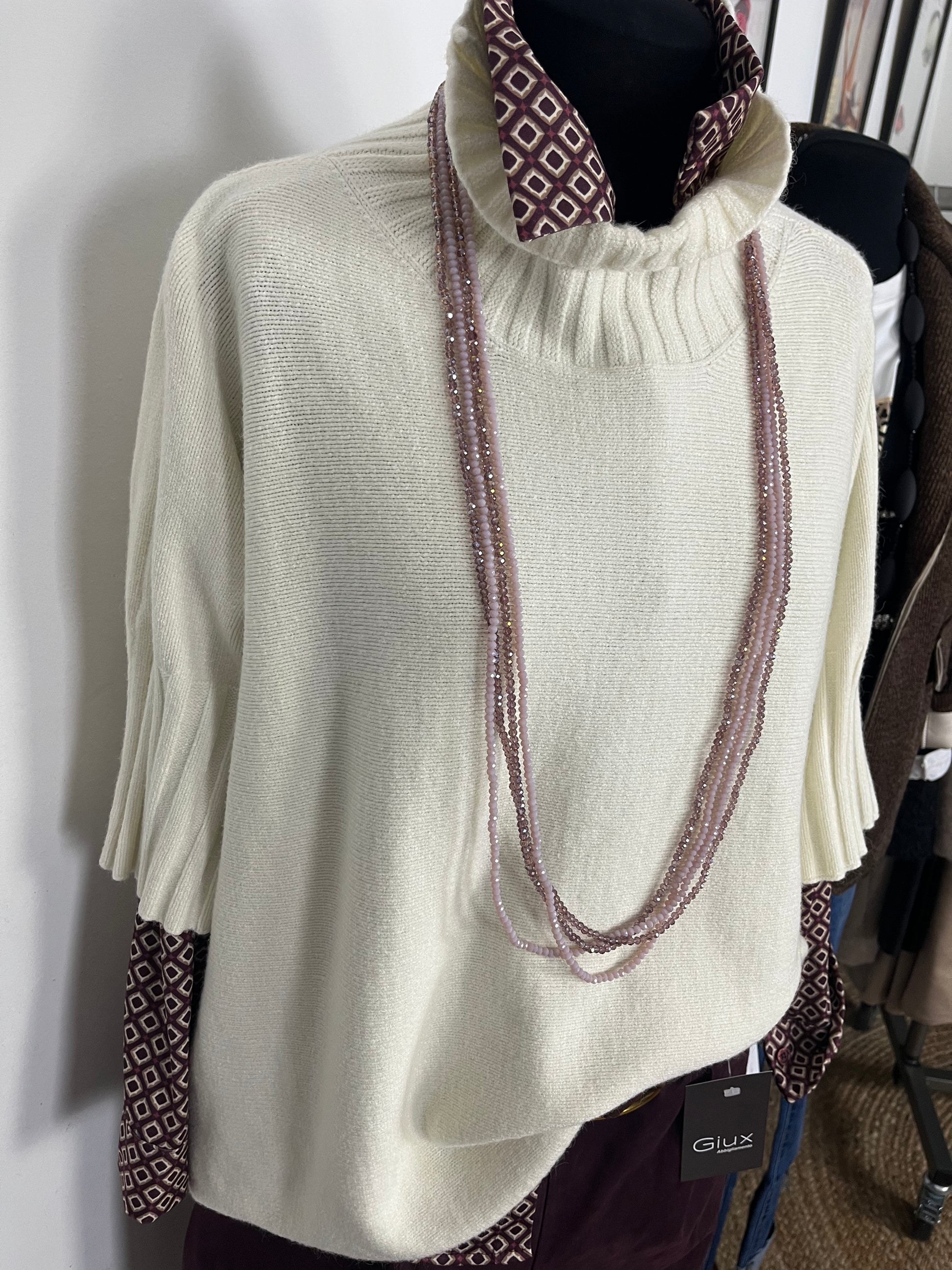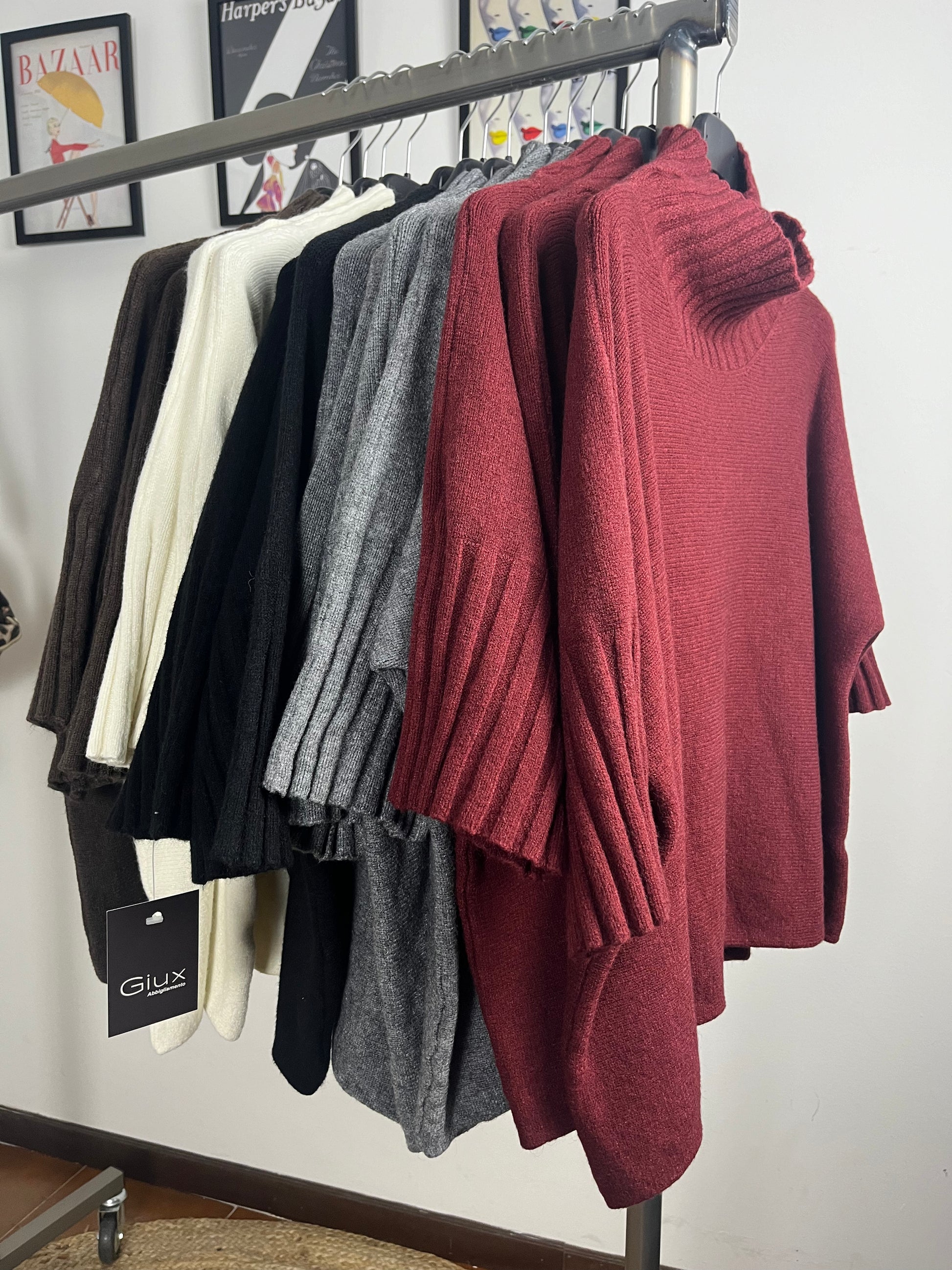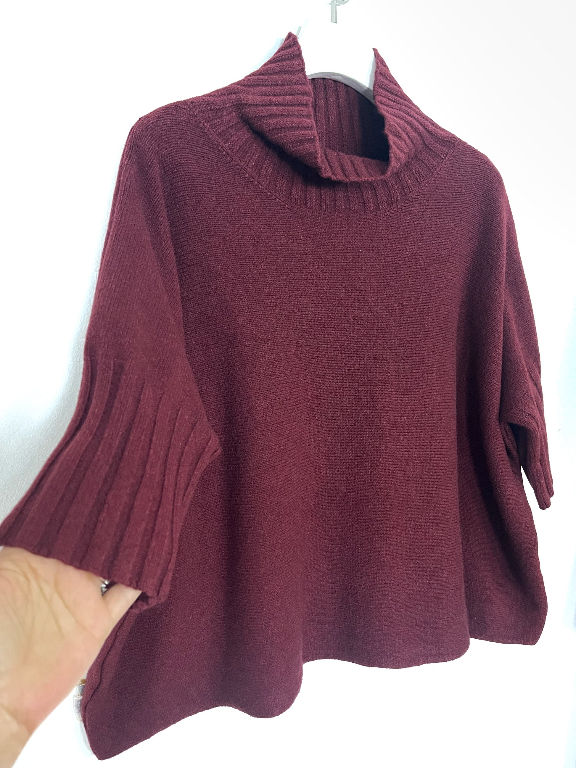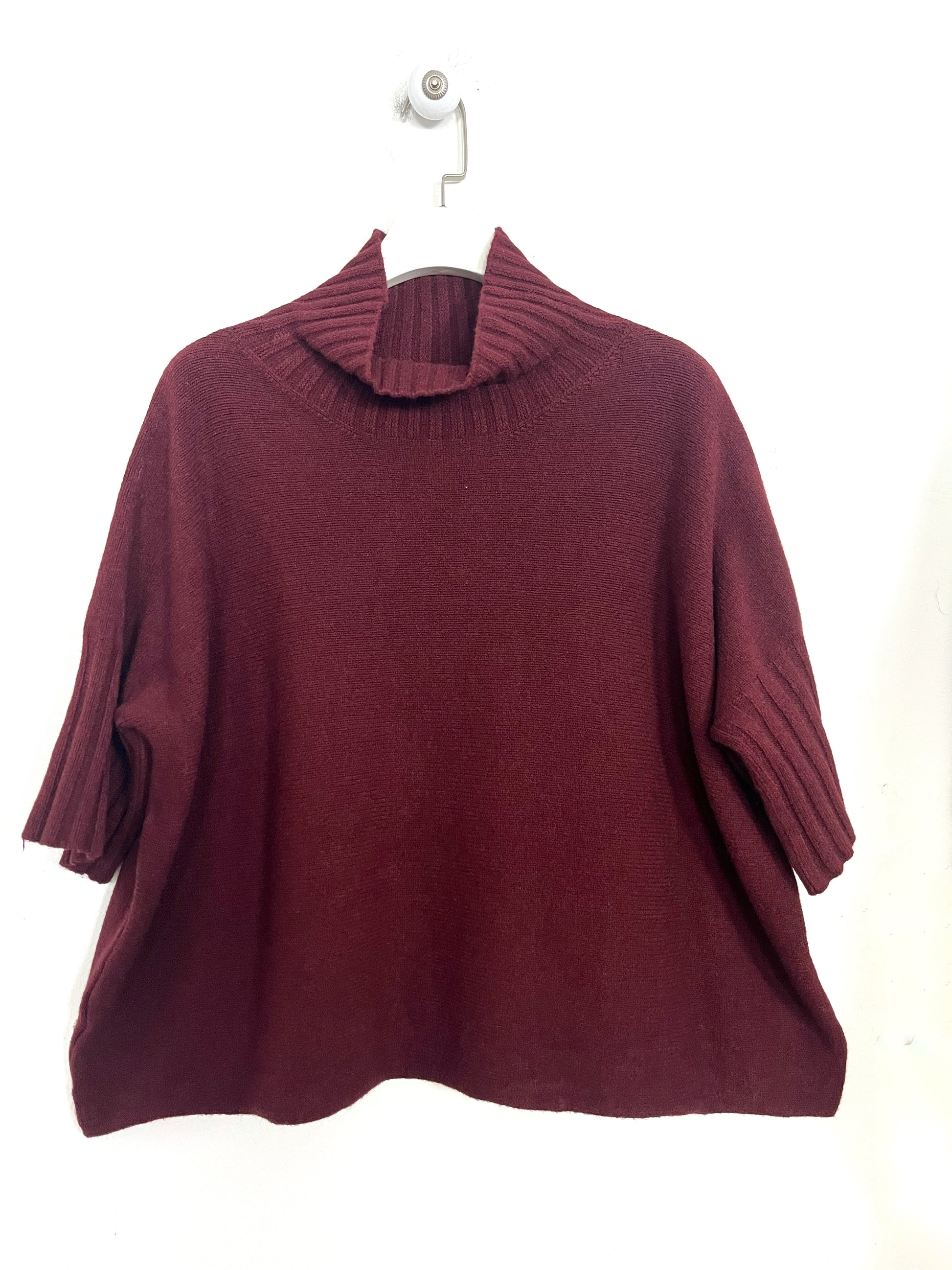 Maglioncino in calda viscosa, collo morbido a lupetto. Manica tre quarti, vestibilità over. Taglio a scatoletta Spalla ribassata