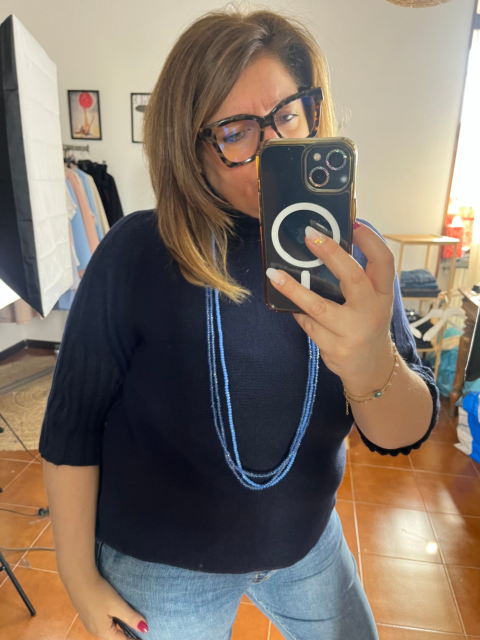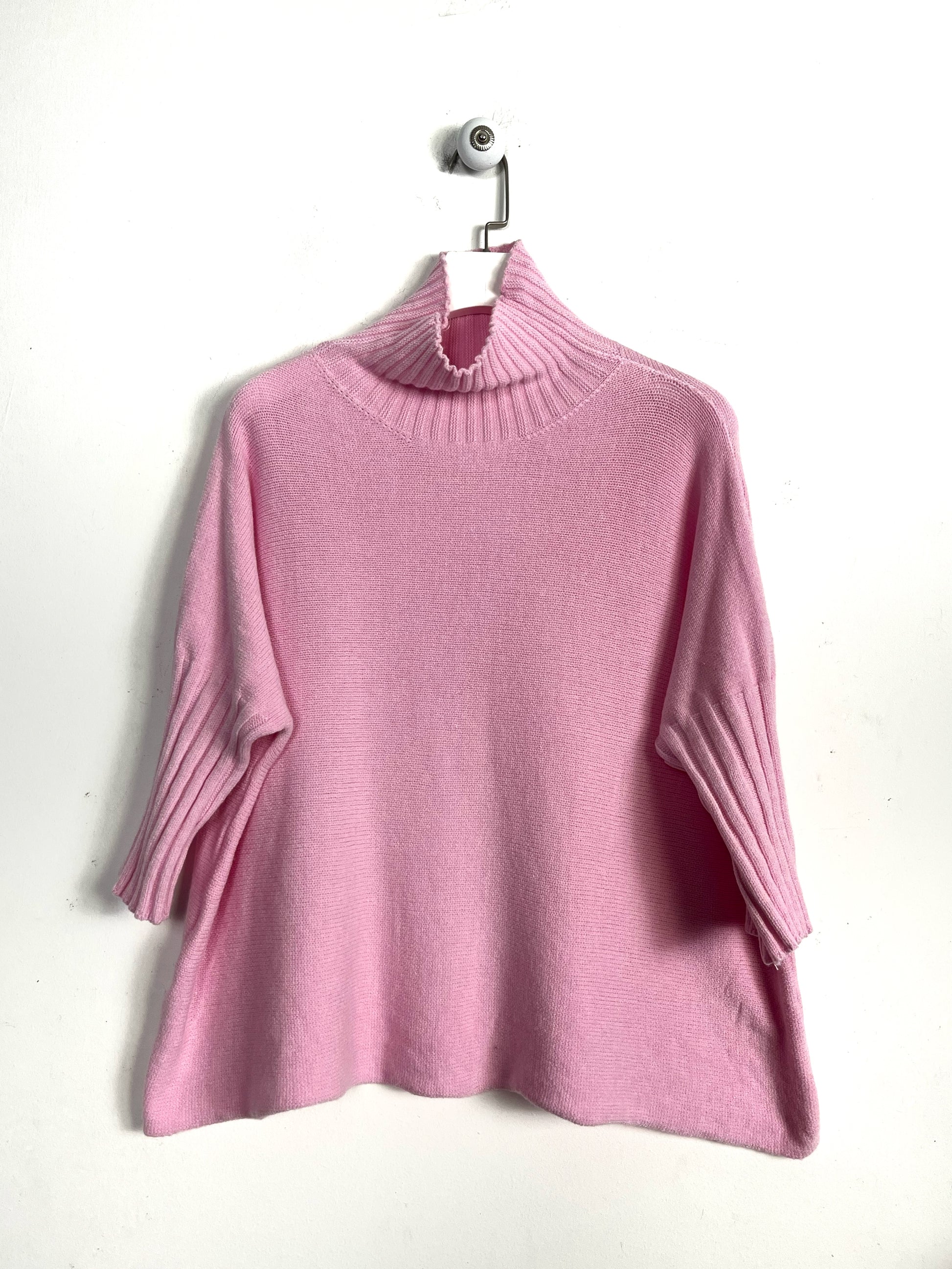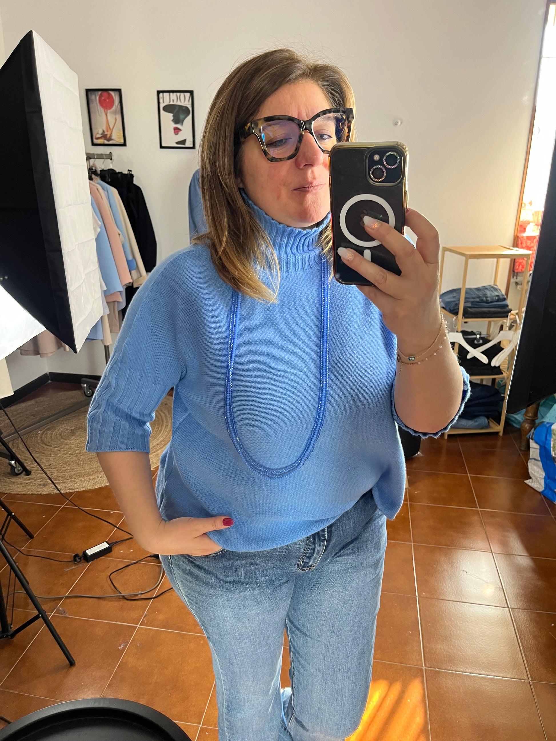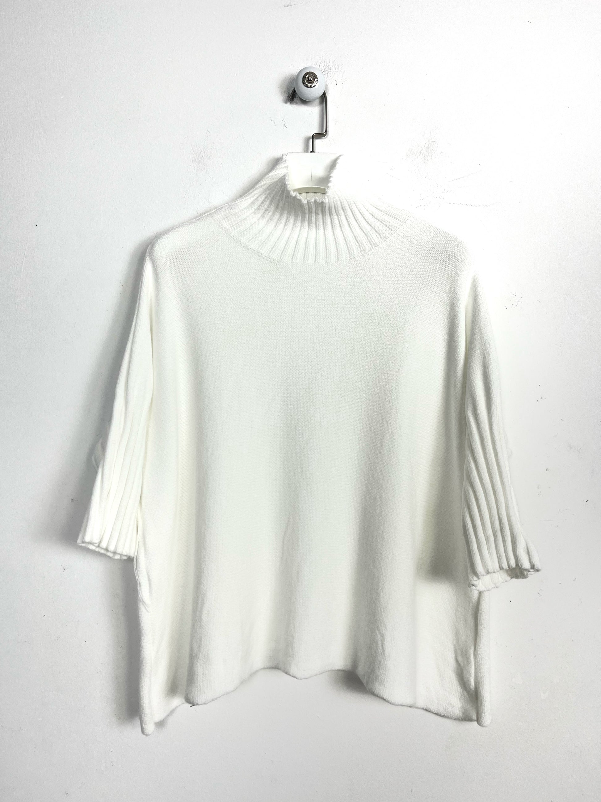 Maglioncino in viscosa, collo morbido a lupetto. Manica tre quarti, vestibilità over. Taglio a scatoletta Spalla ribassata