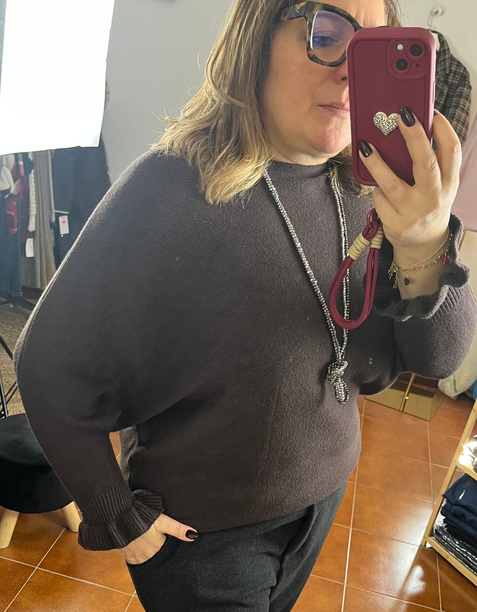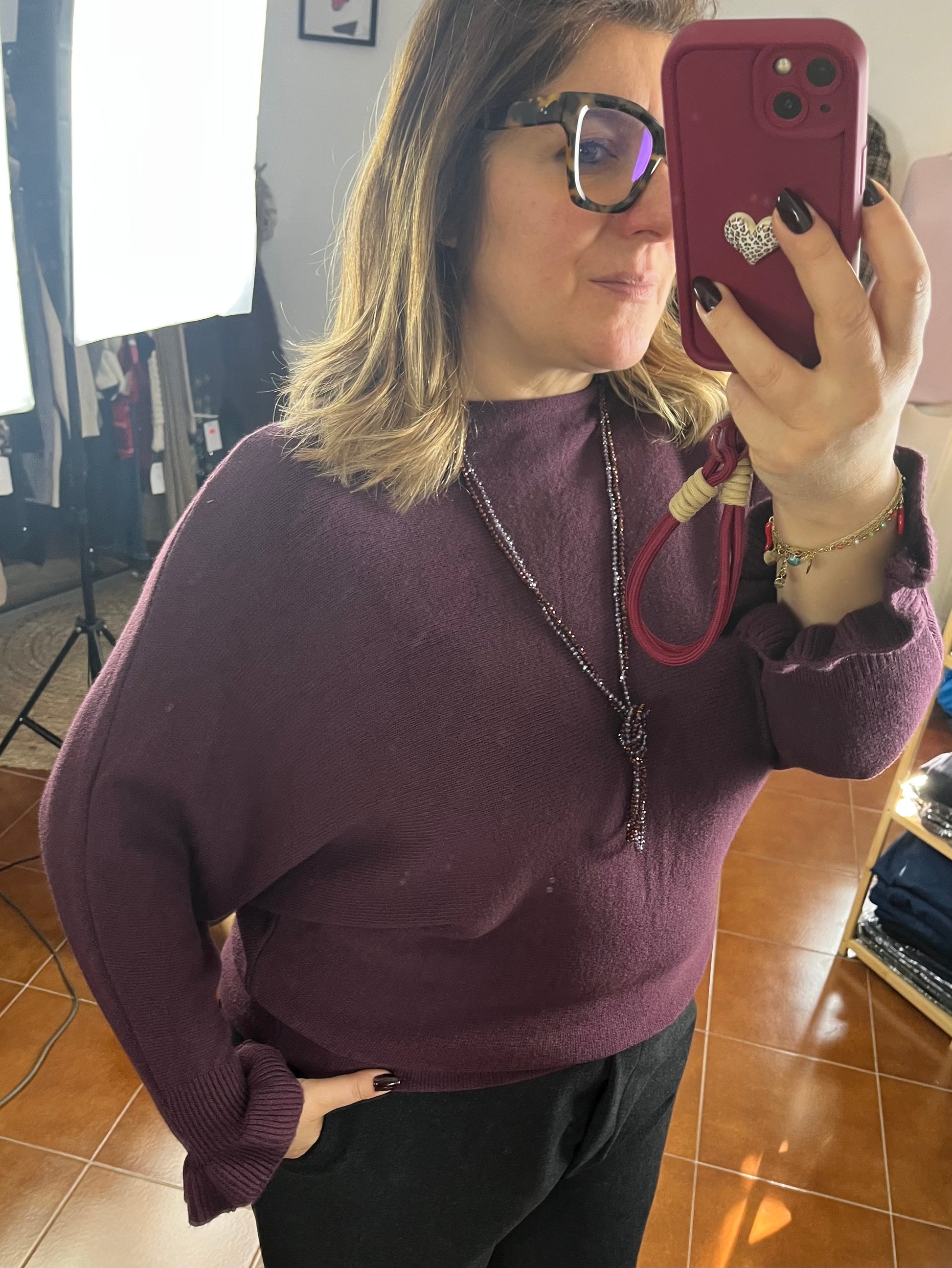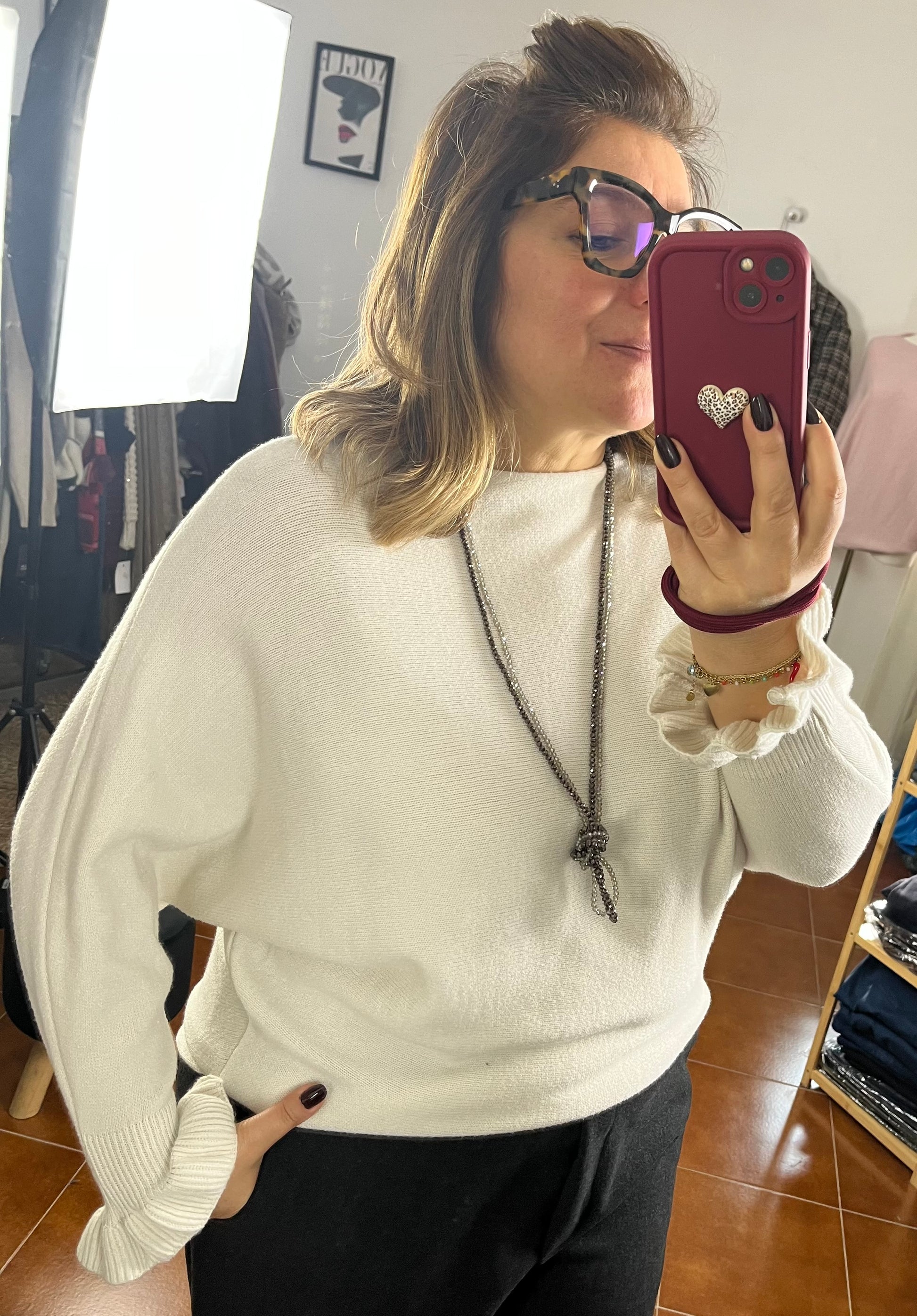 Maglioncino in calda viscosa girocollo. Manica tre quarti con Rouge.