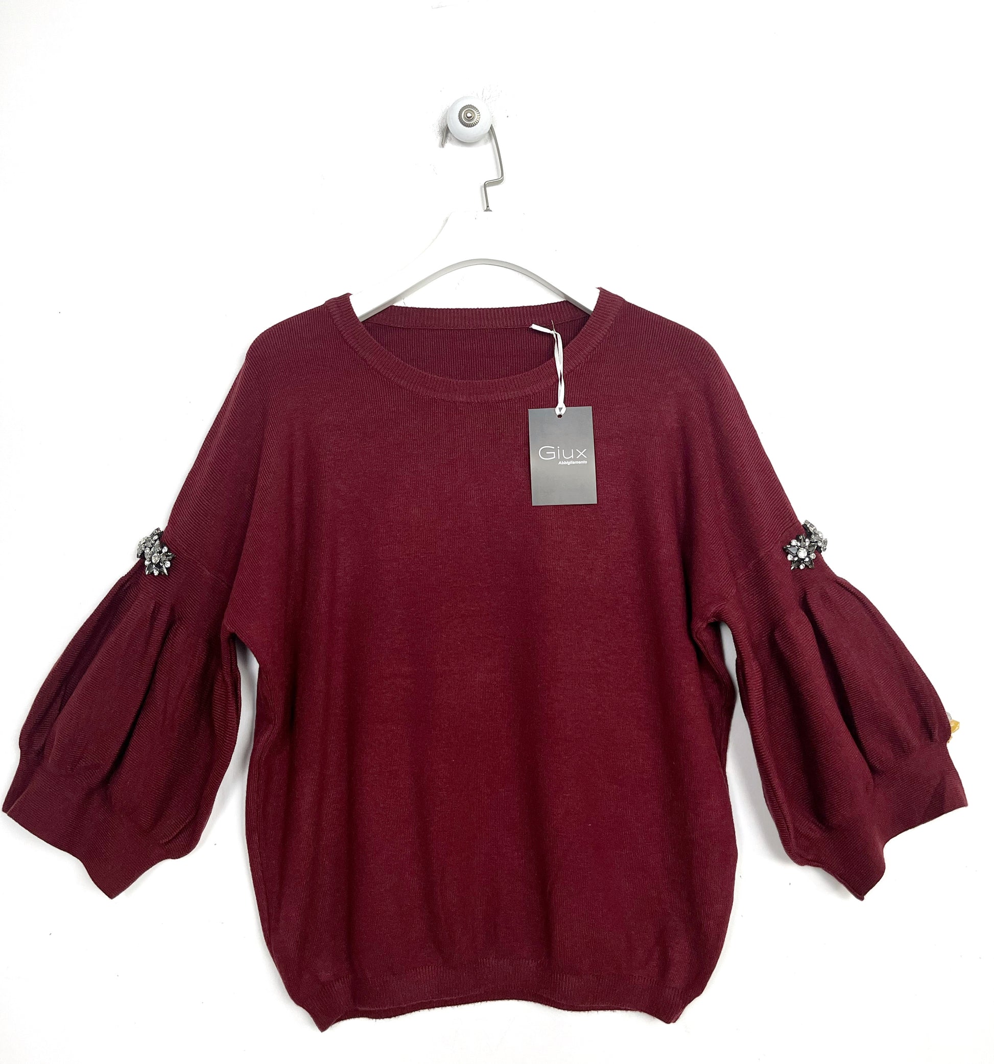 Maglioncino in calda viscosa girocollo. Manica a sbuffo tre quarti. Strass applicato sulla manica. Cropped