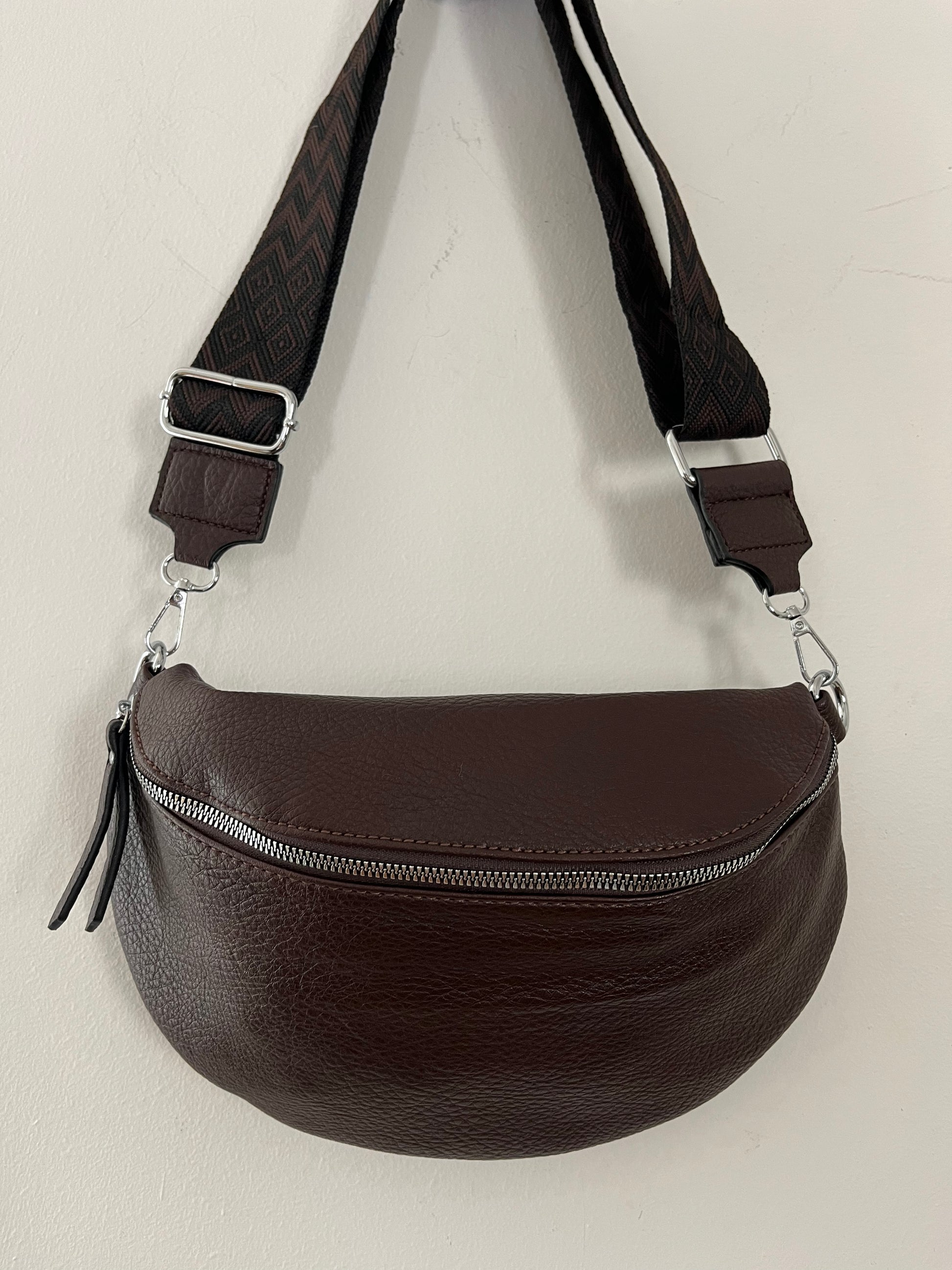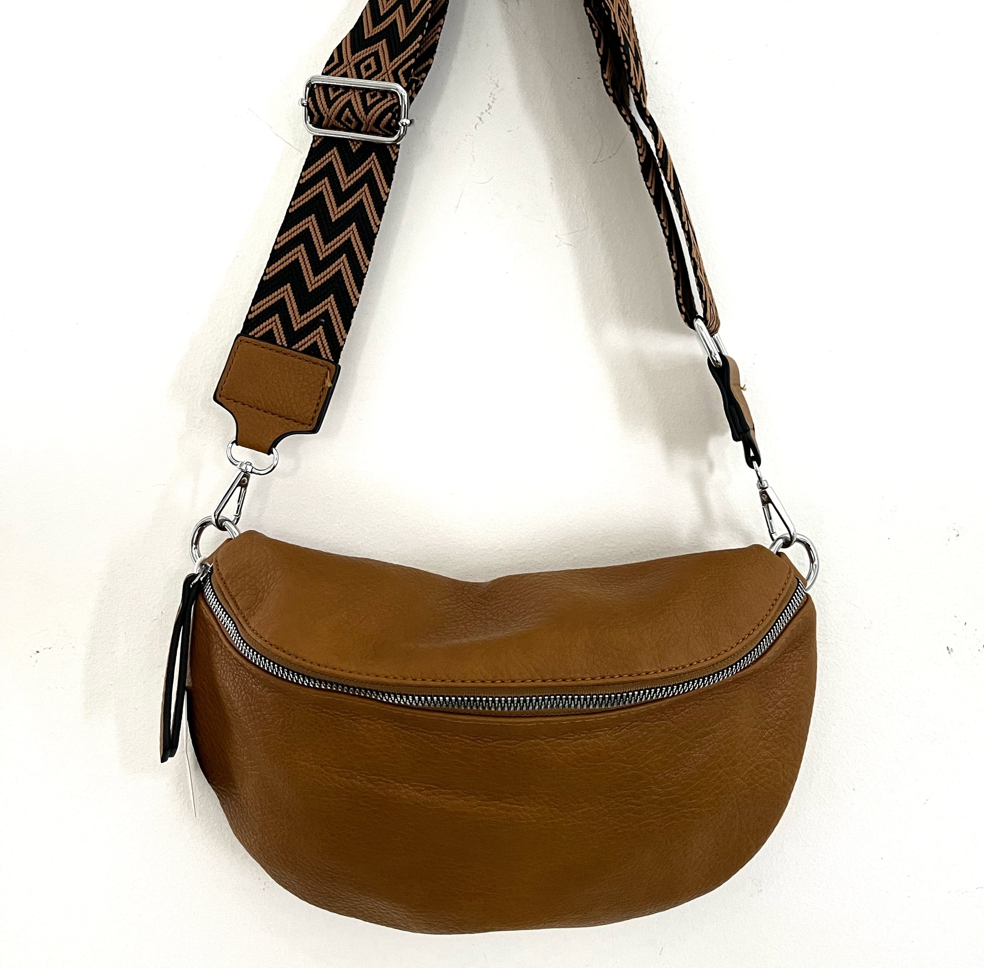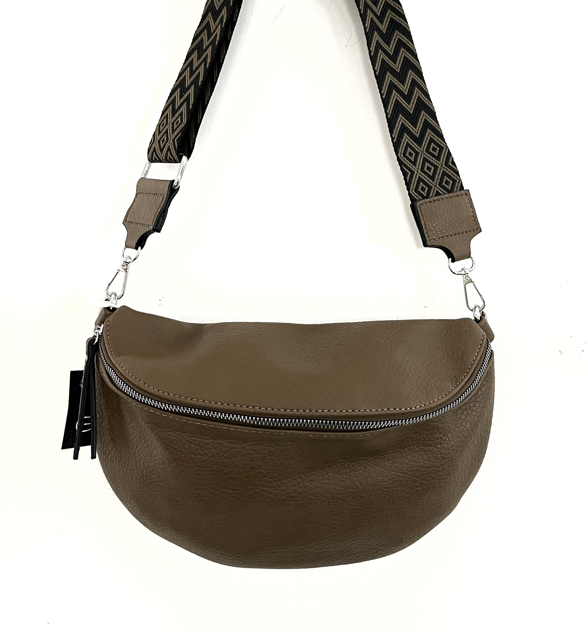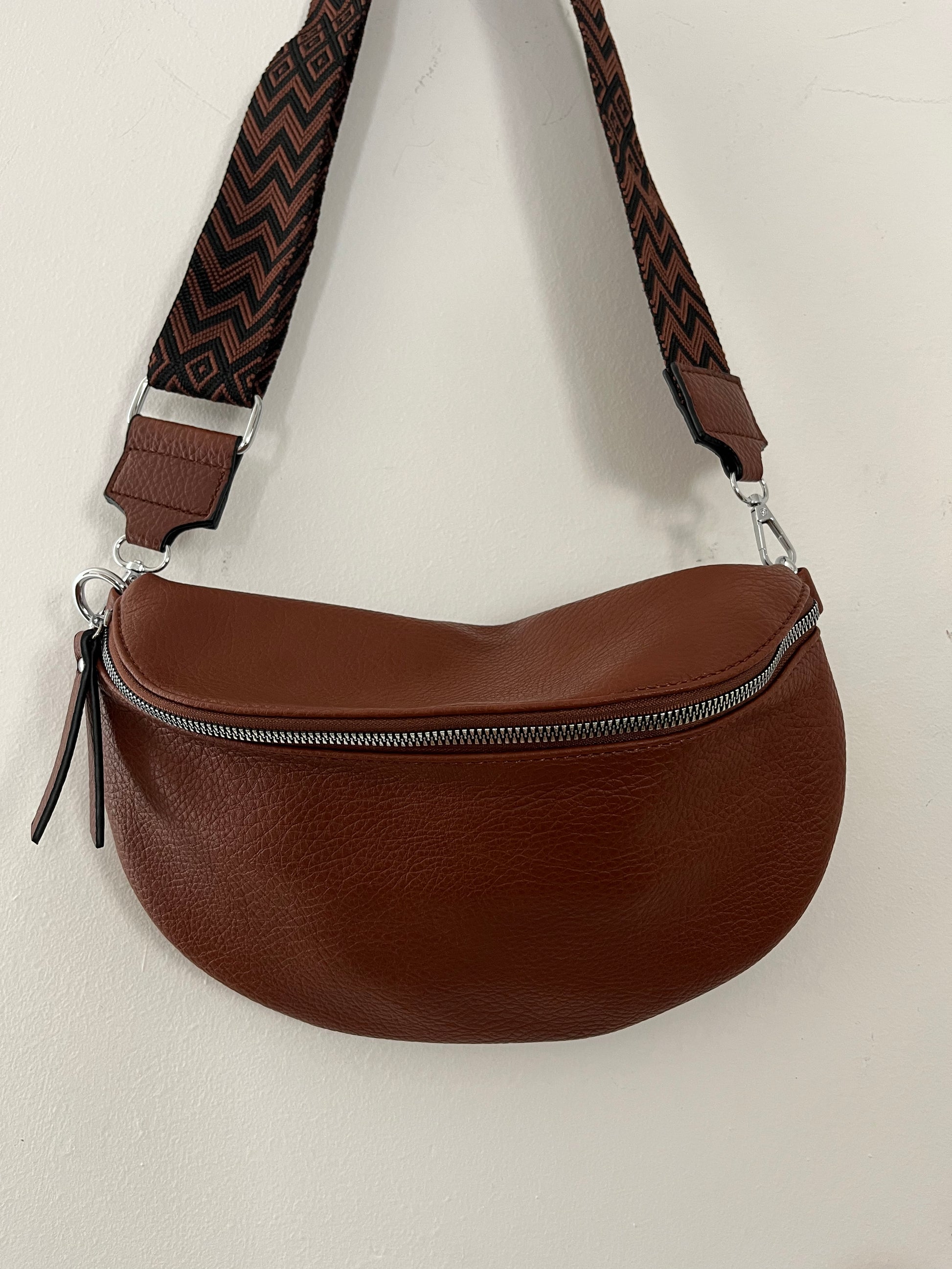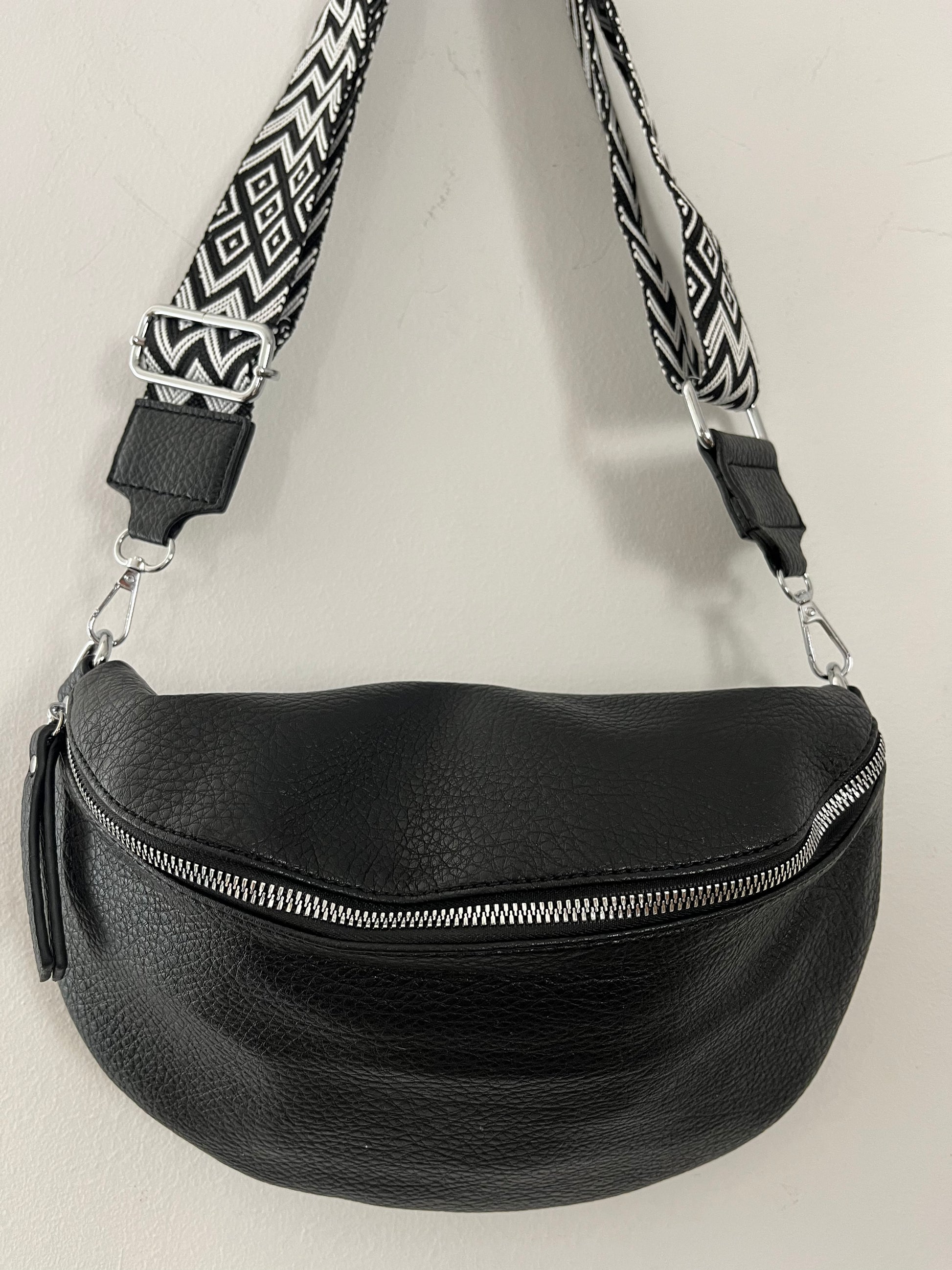 Marsupio in ecopelle con tracolla in tessuto fantasia. Taschina dietro e taschina allinterno. Chiusura con cerniera.