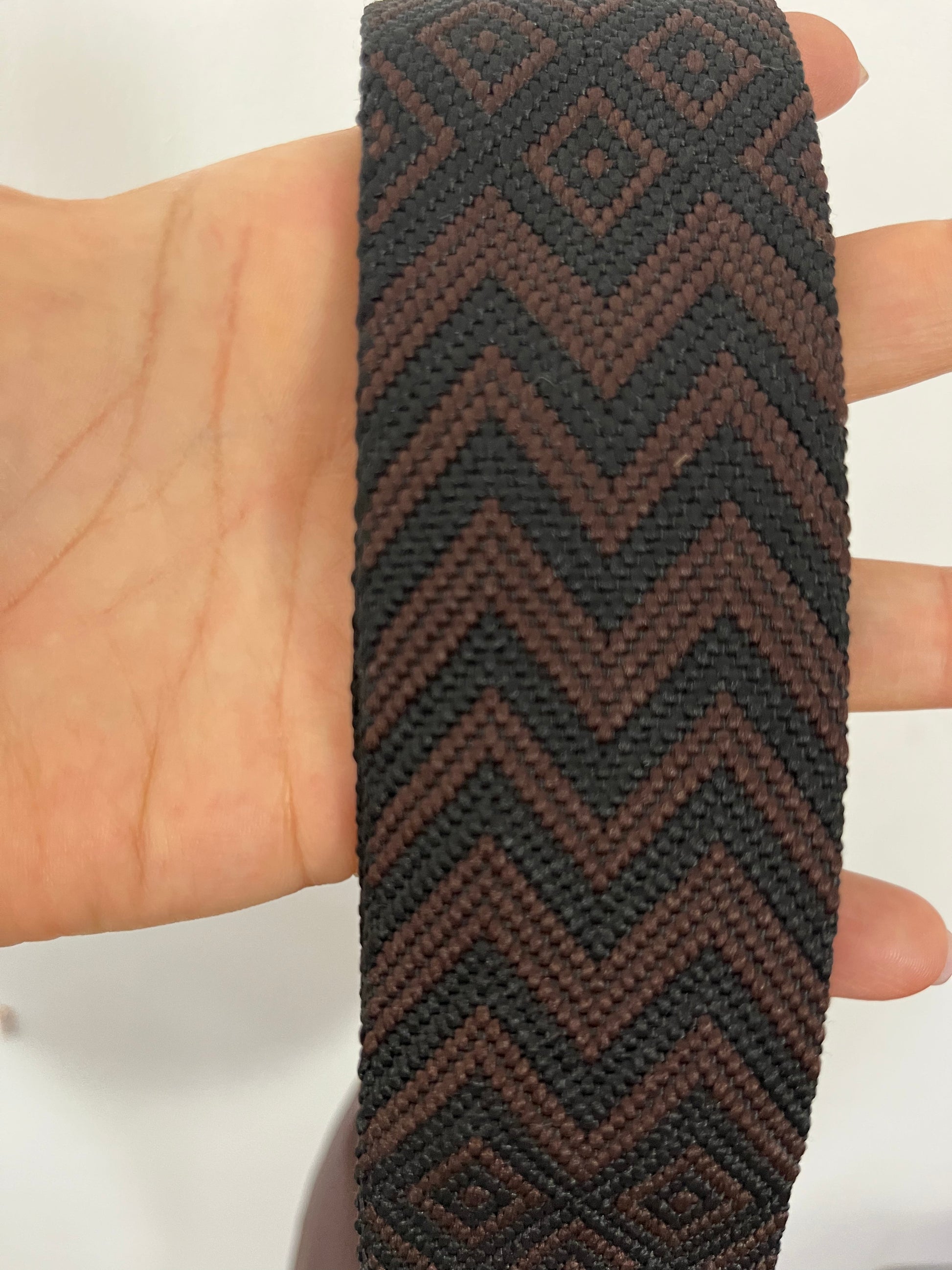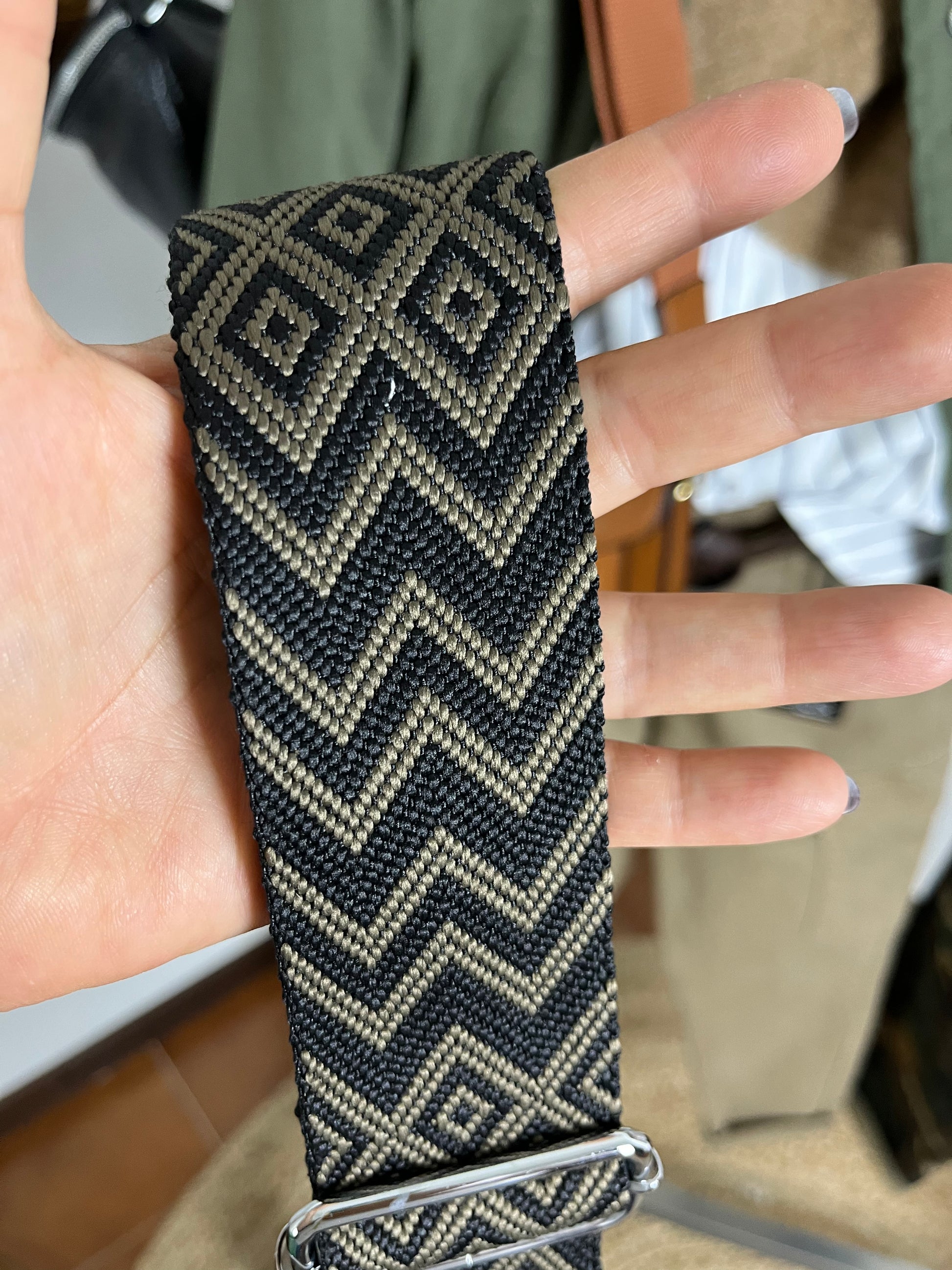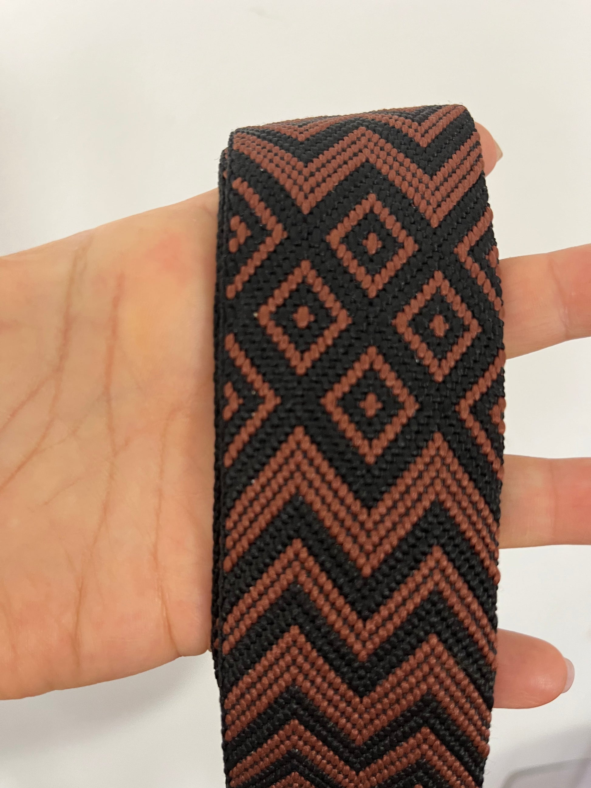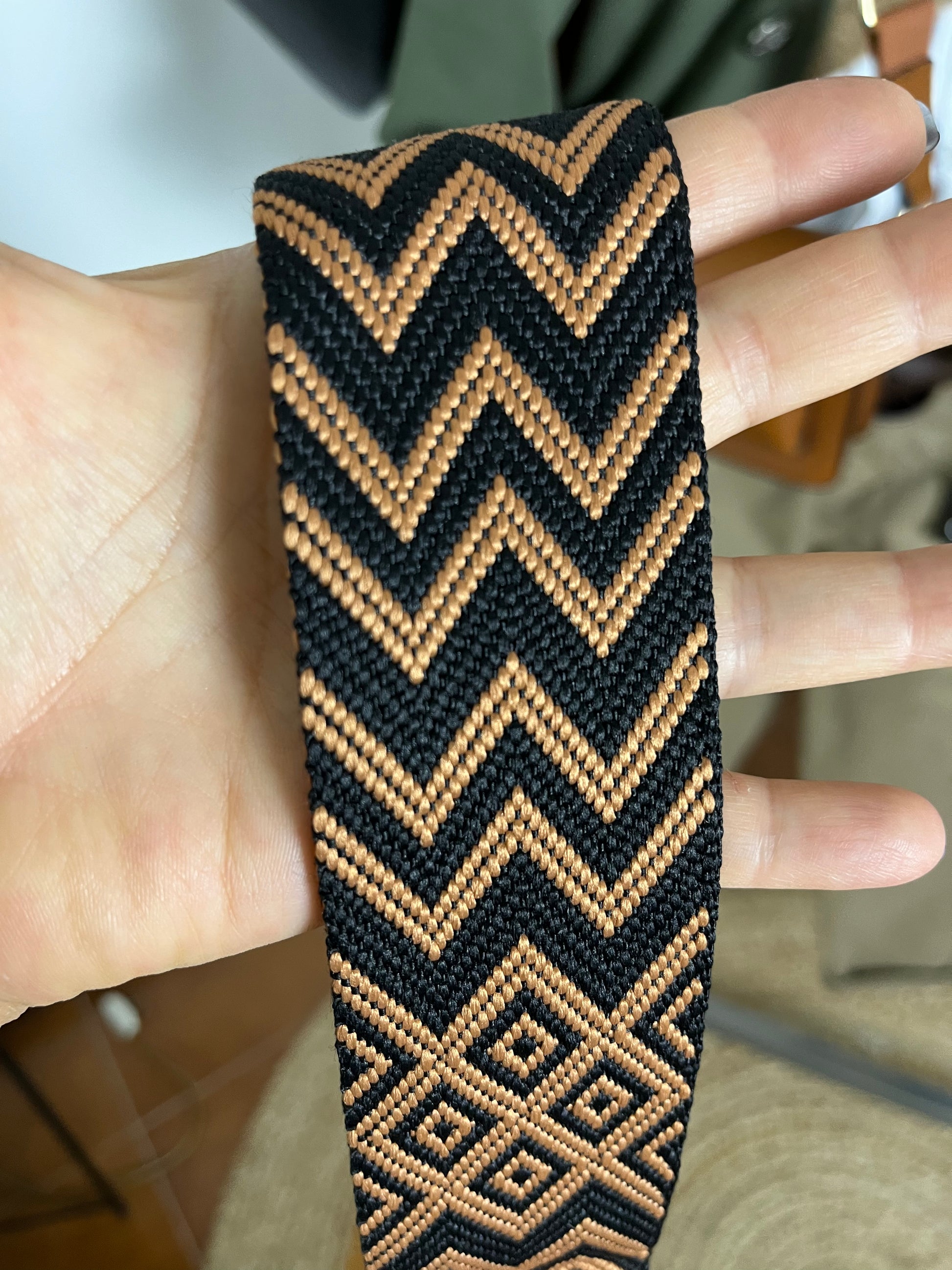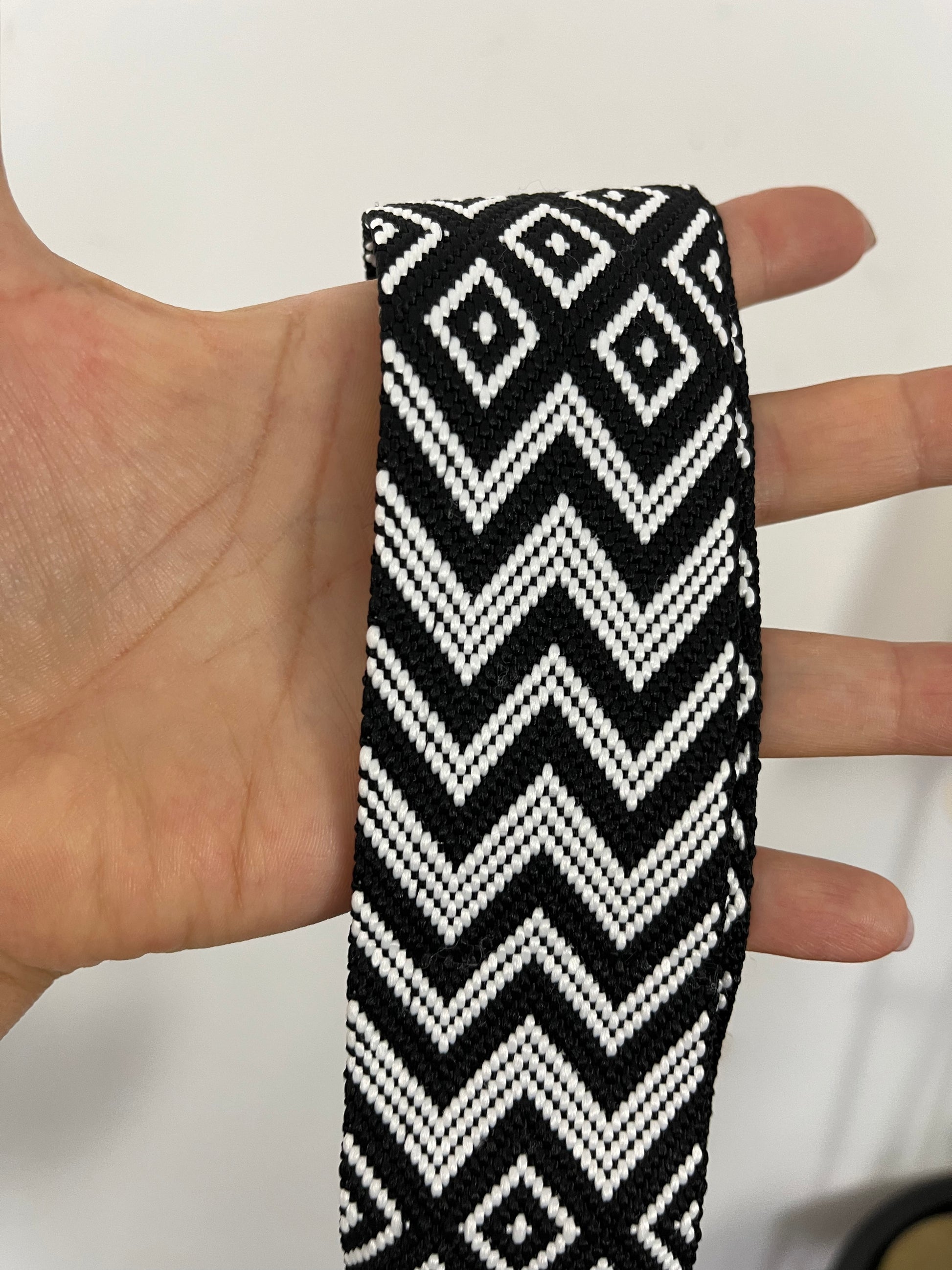 Marsupio in ecopelle con tracolla in tessuto fantasia. Taschina dietro e taschina allinterno. Chiusura con cerniera.