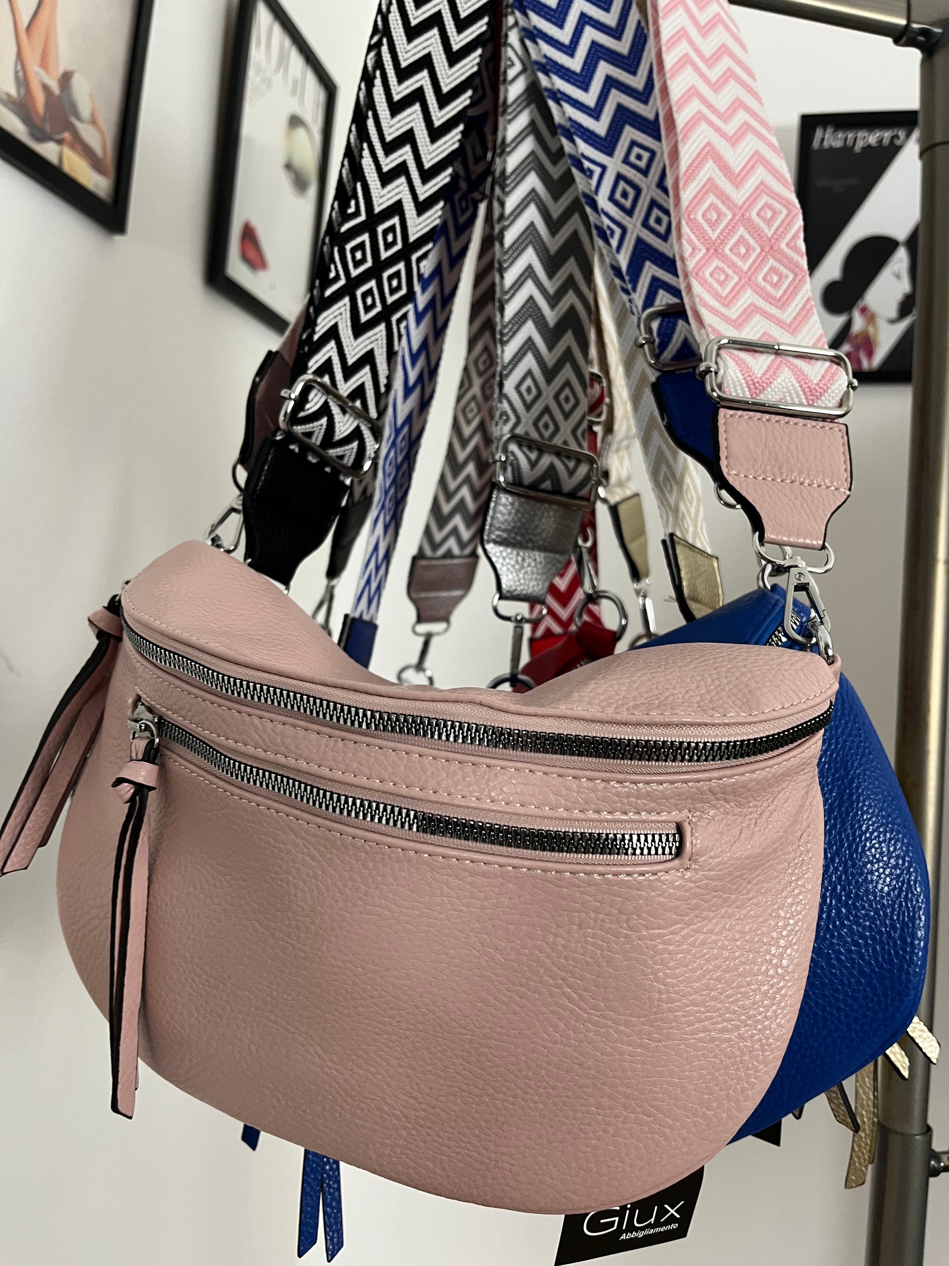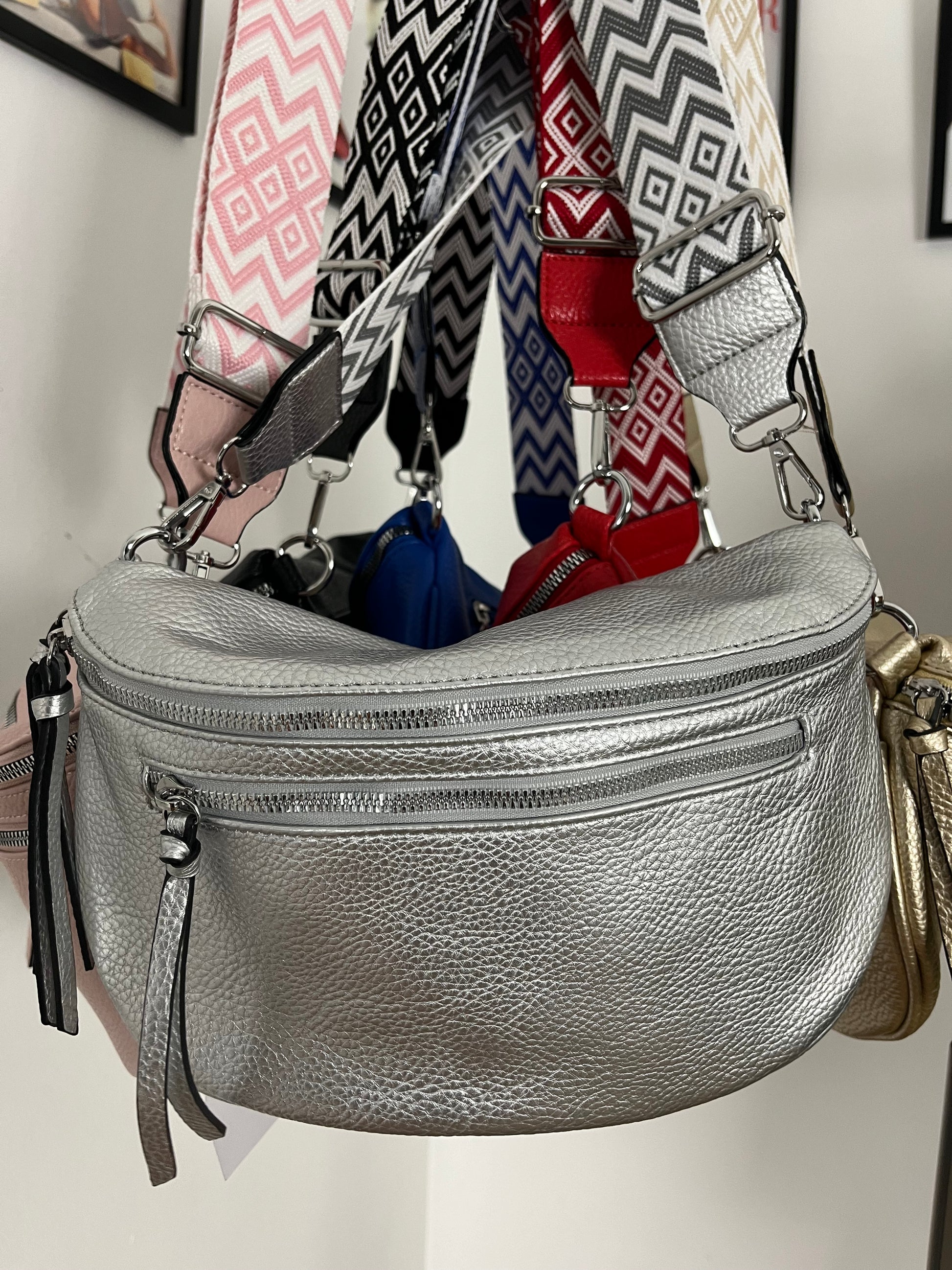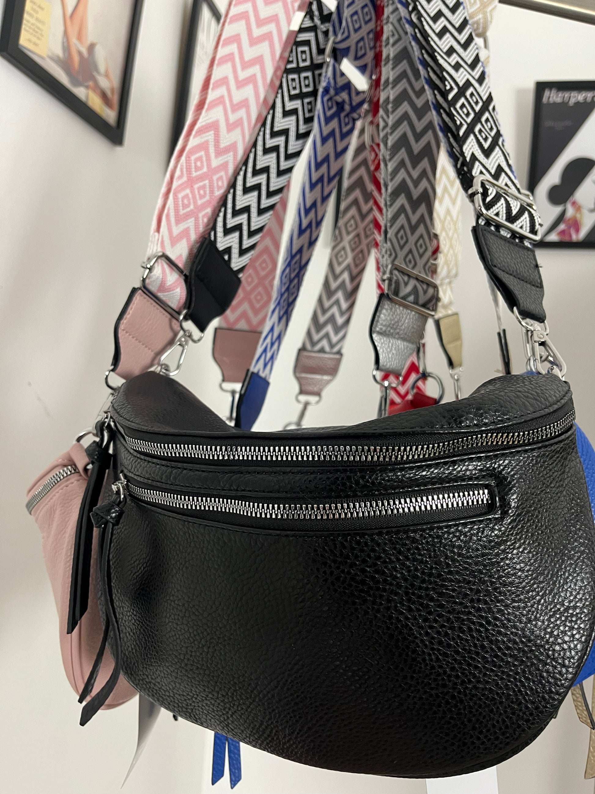 Marsupio in ecopelle con tracolla in tessuto fantasia. Taschina dietro e taschina allinterno. Chiusura con cerniera. Tasca con cerniera sul davanti.