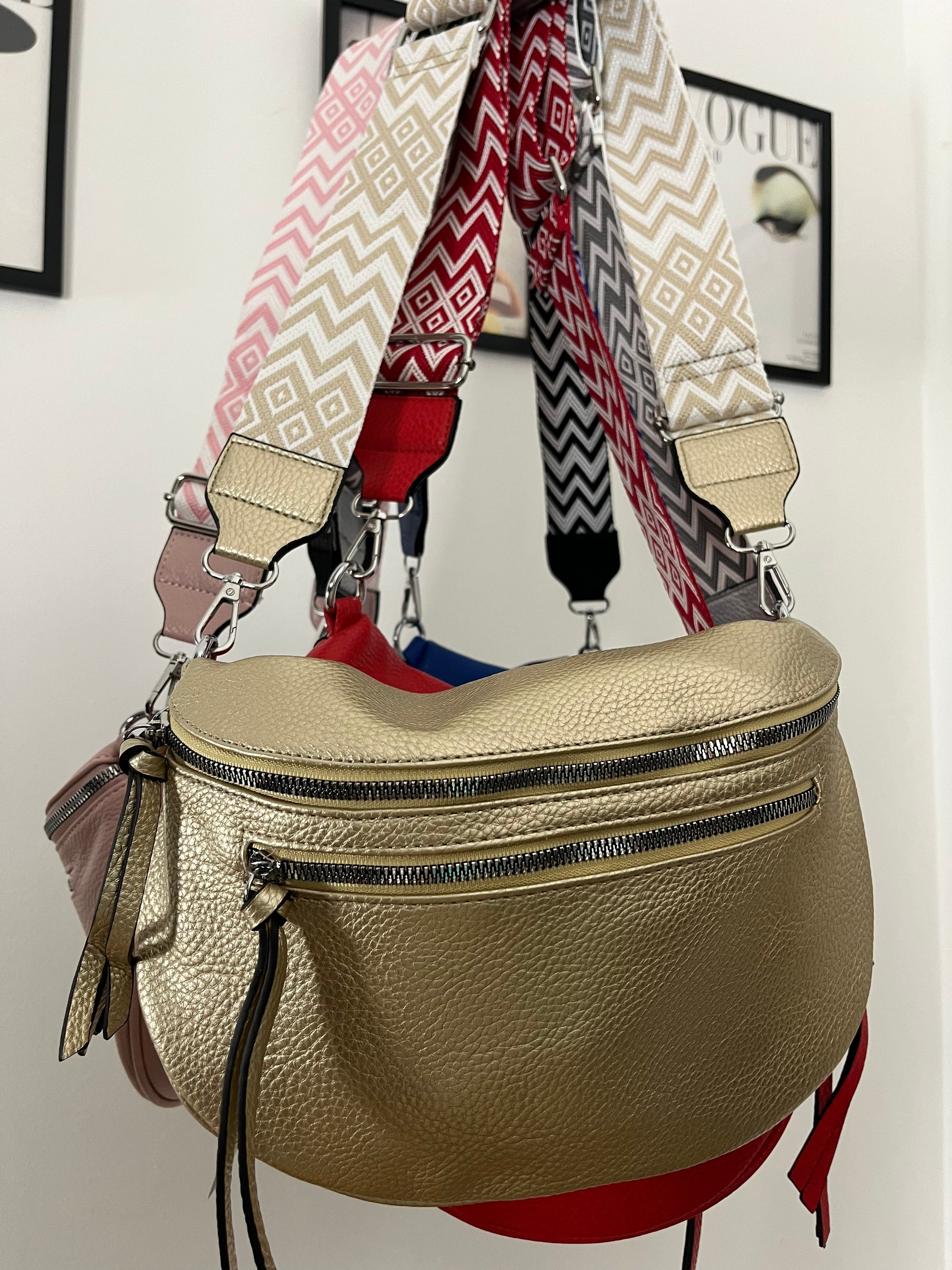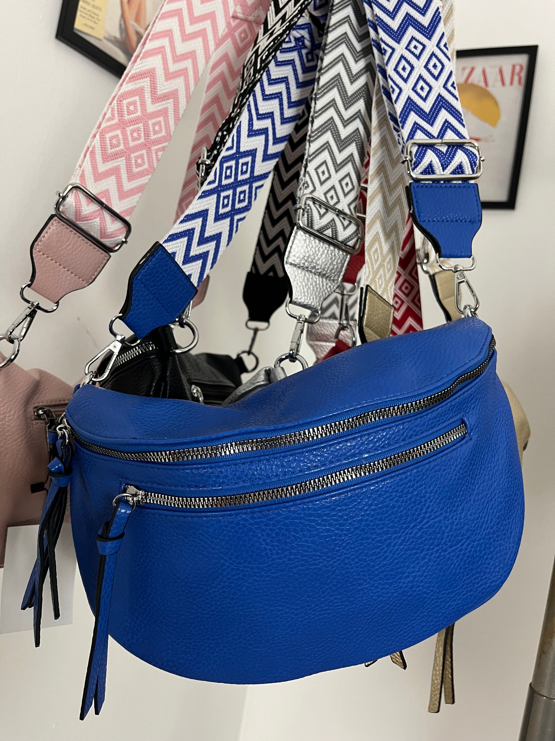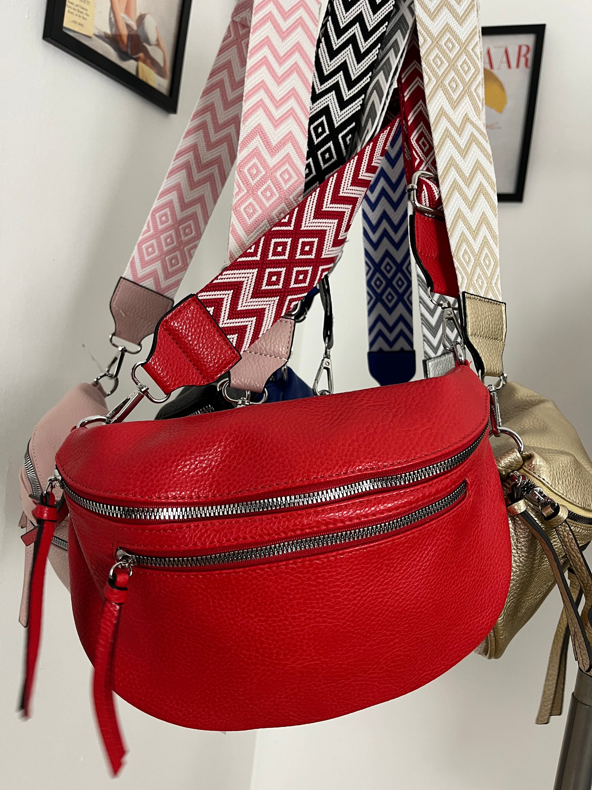 Marsupio in ecopelle con tracolla in tessuto fantasia. Taschina dietro e taschina allinterno. Chiusura con cerniera. Tasca con cerniera sul davanti.