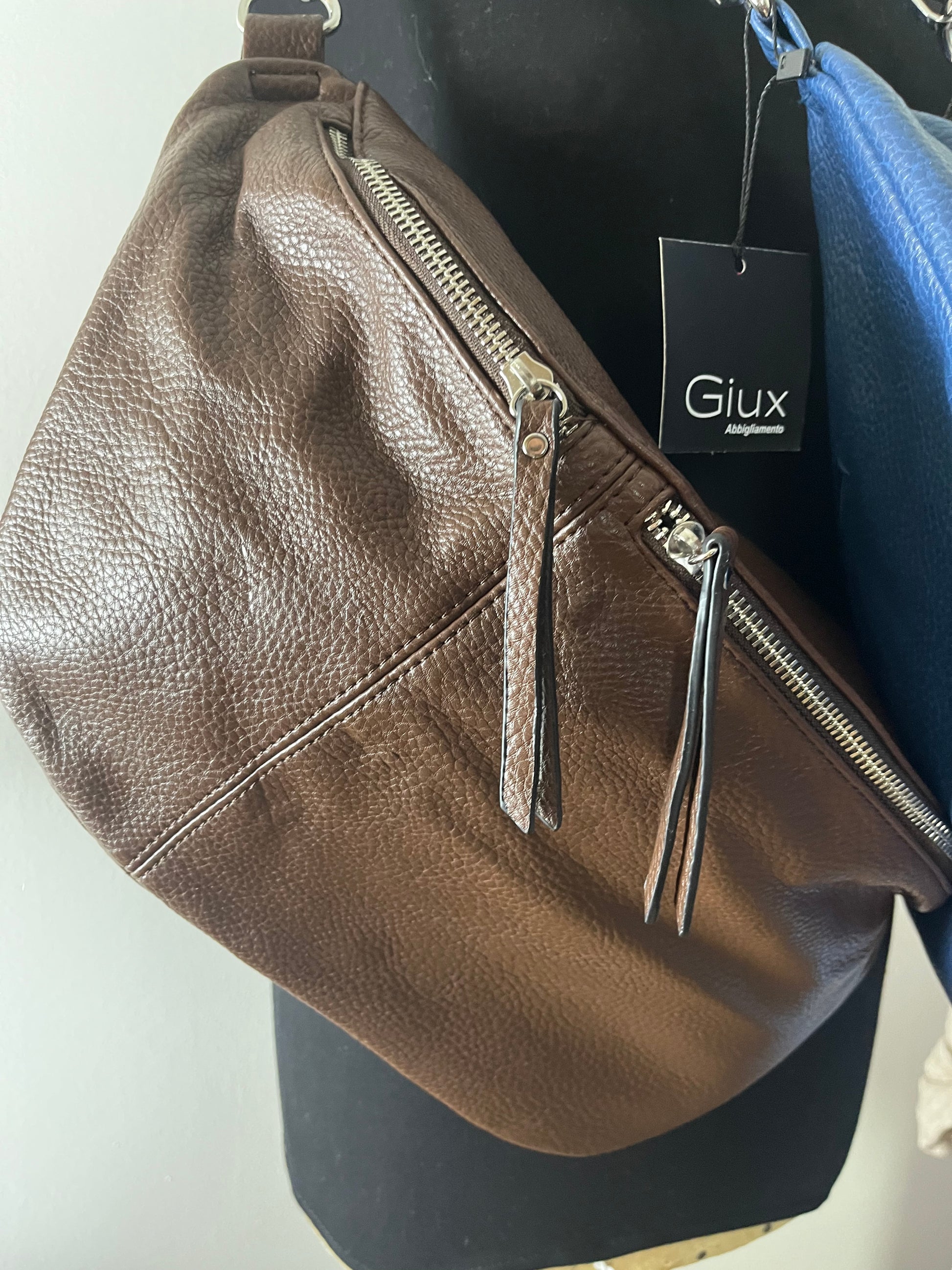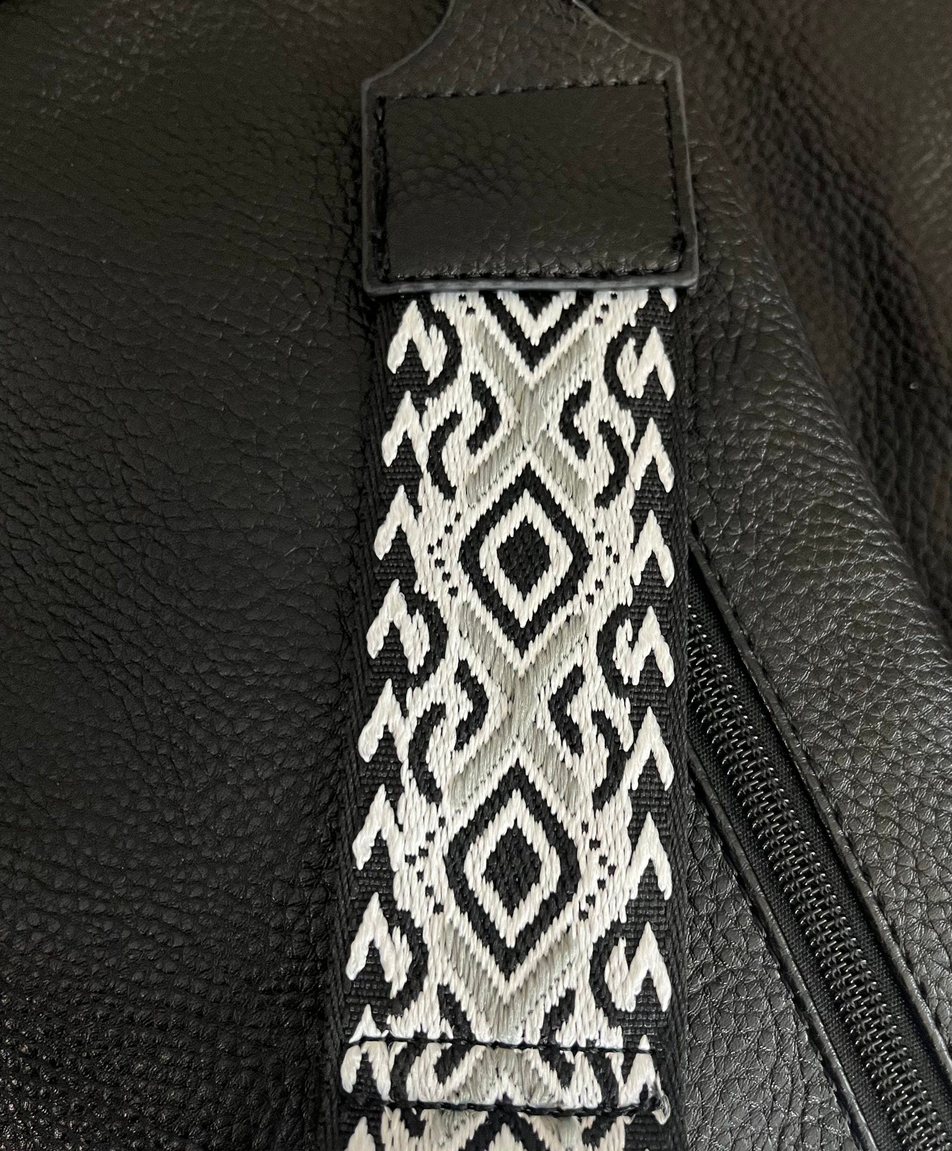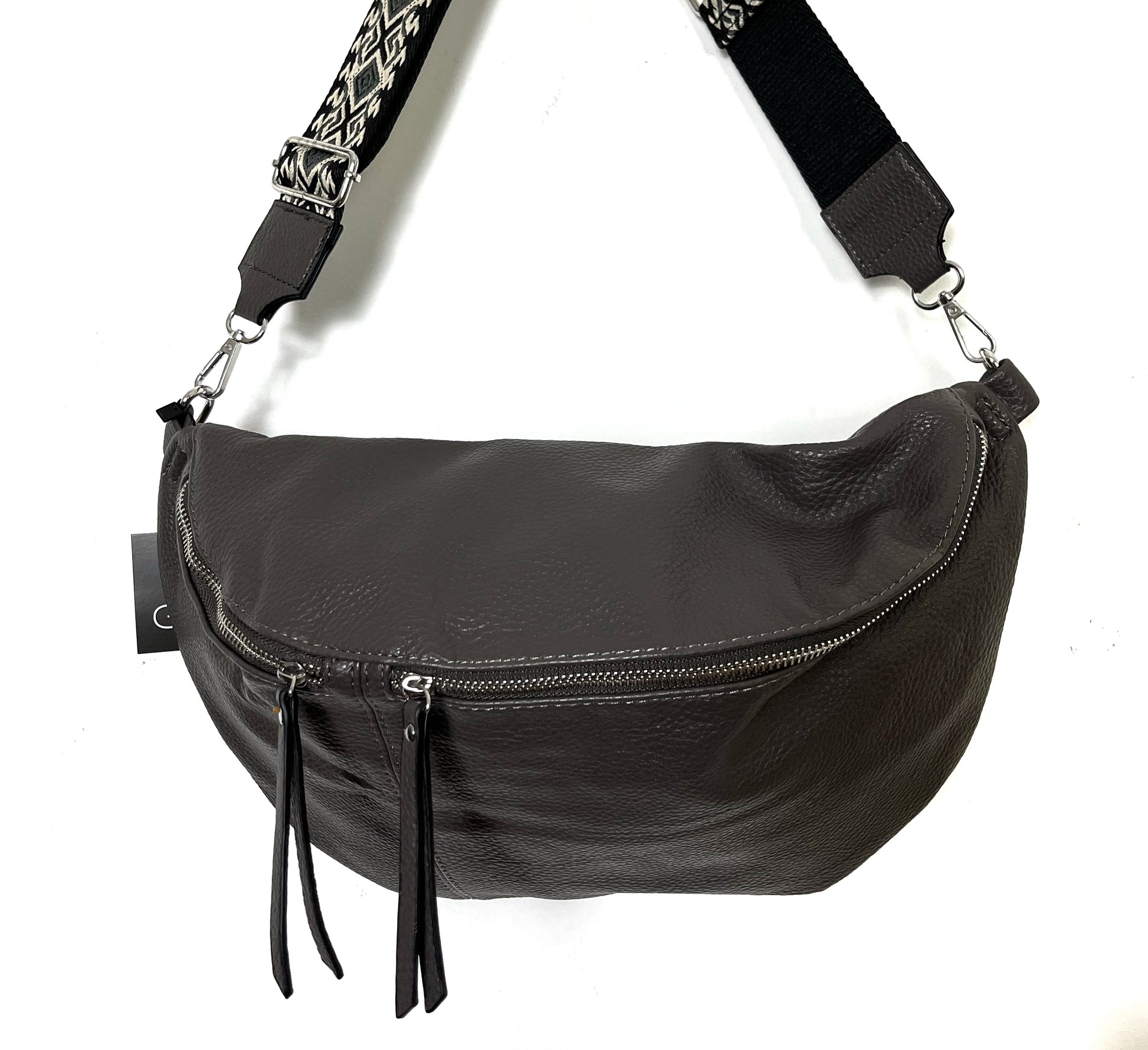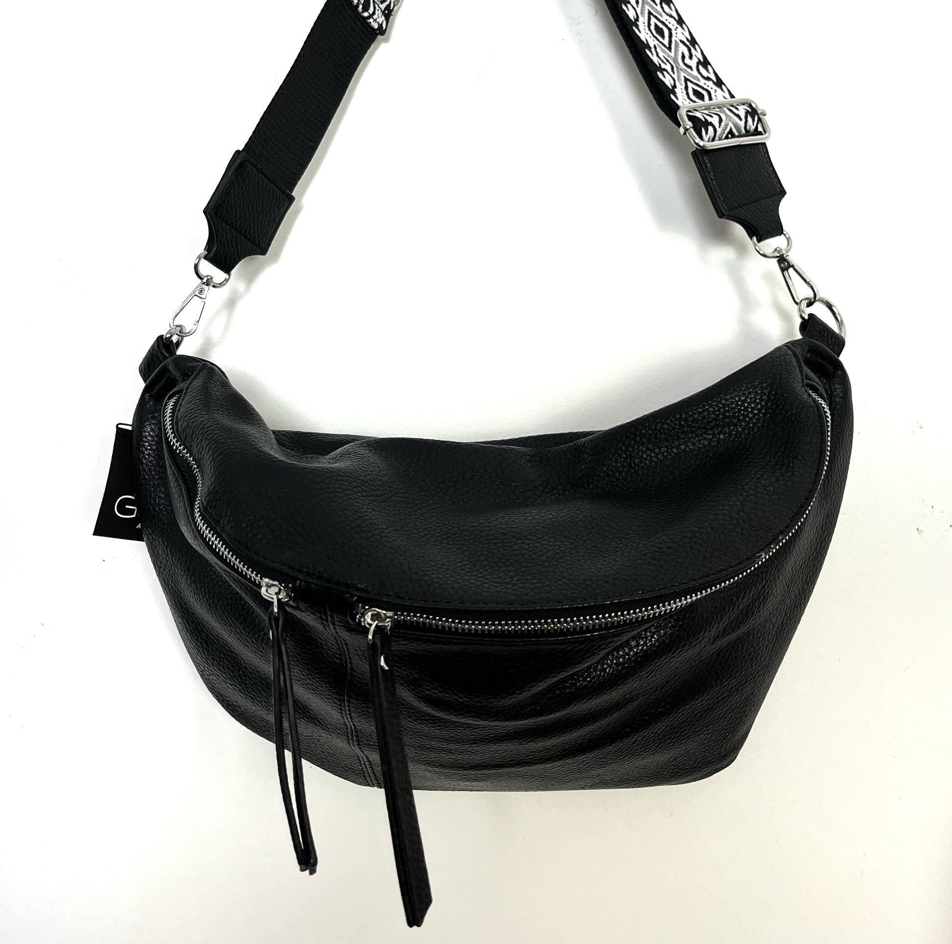 Marsupio in ecopelle con tracolla in tessuto fantasia. Taschina dietro e taschine allinterno. Chiusura con doppie cerniere.