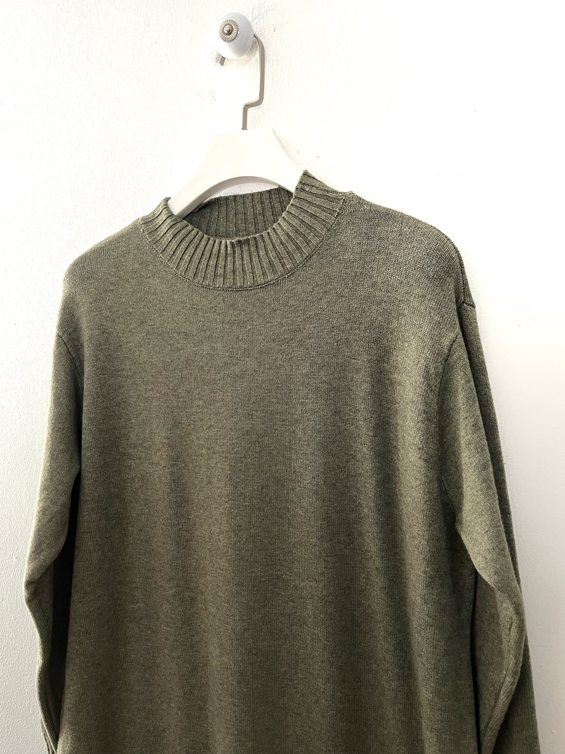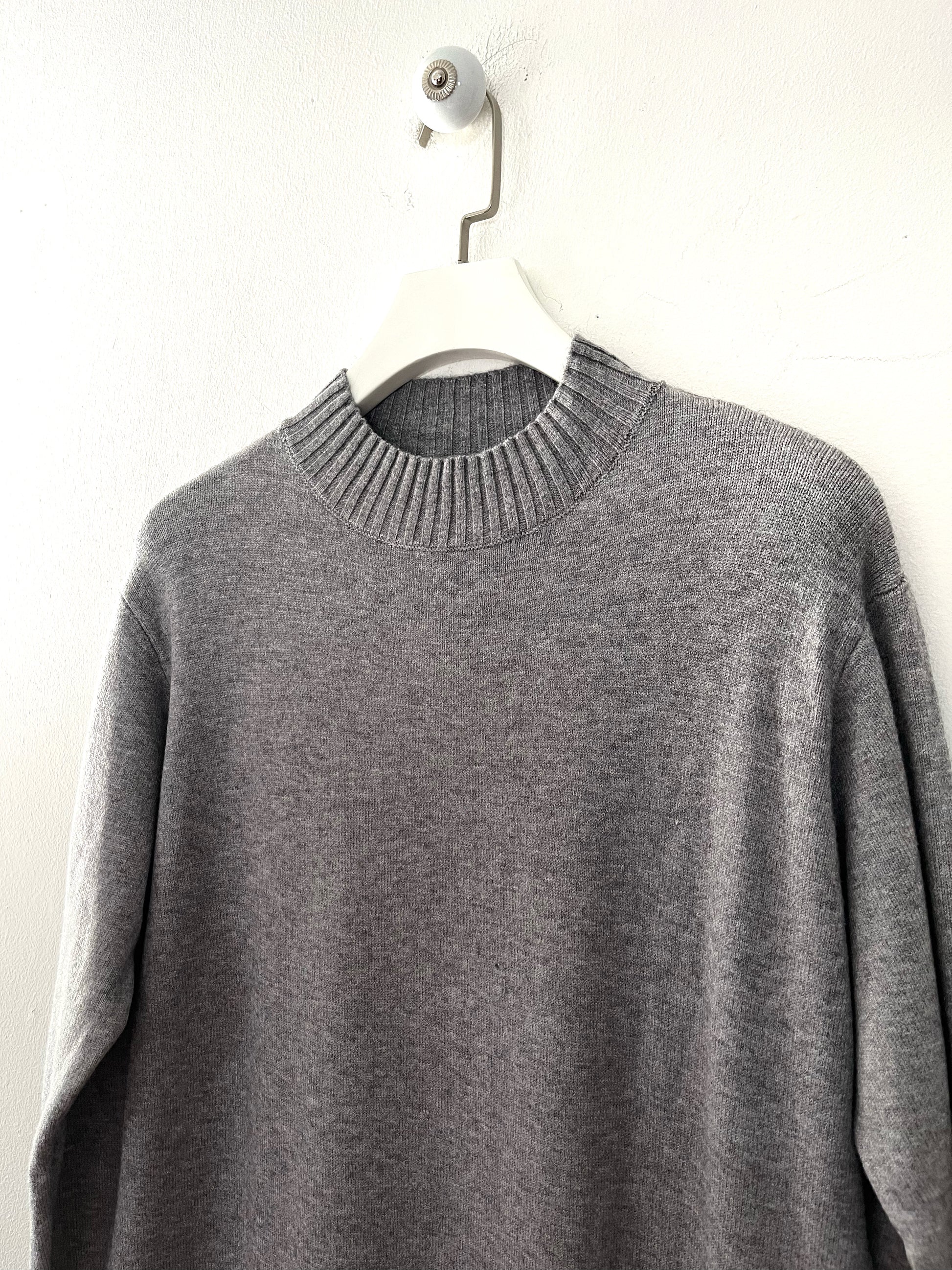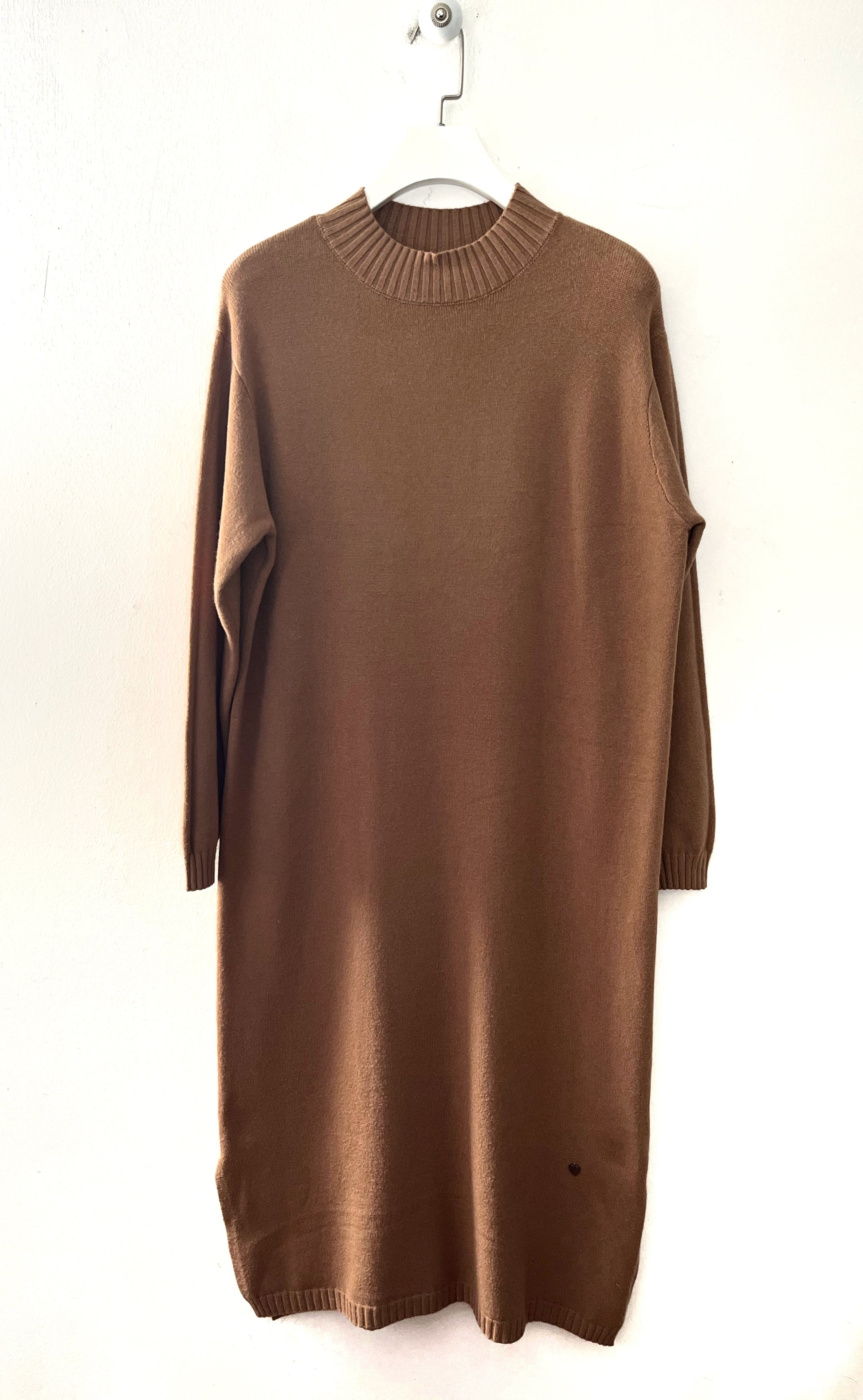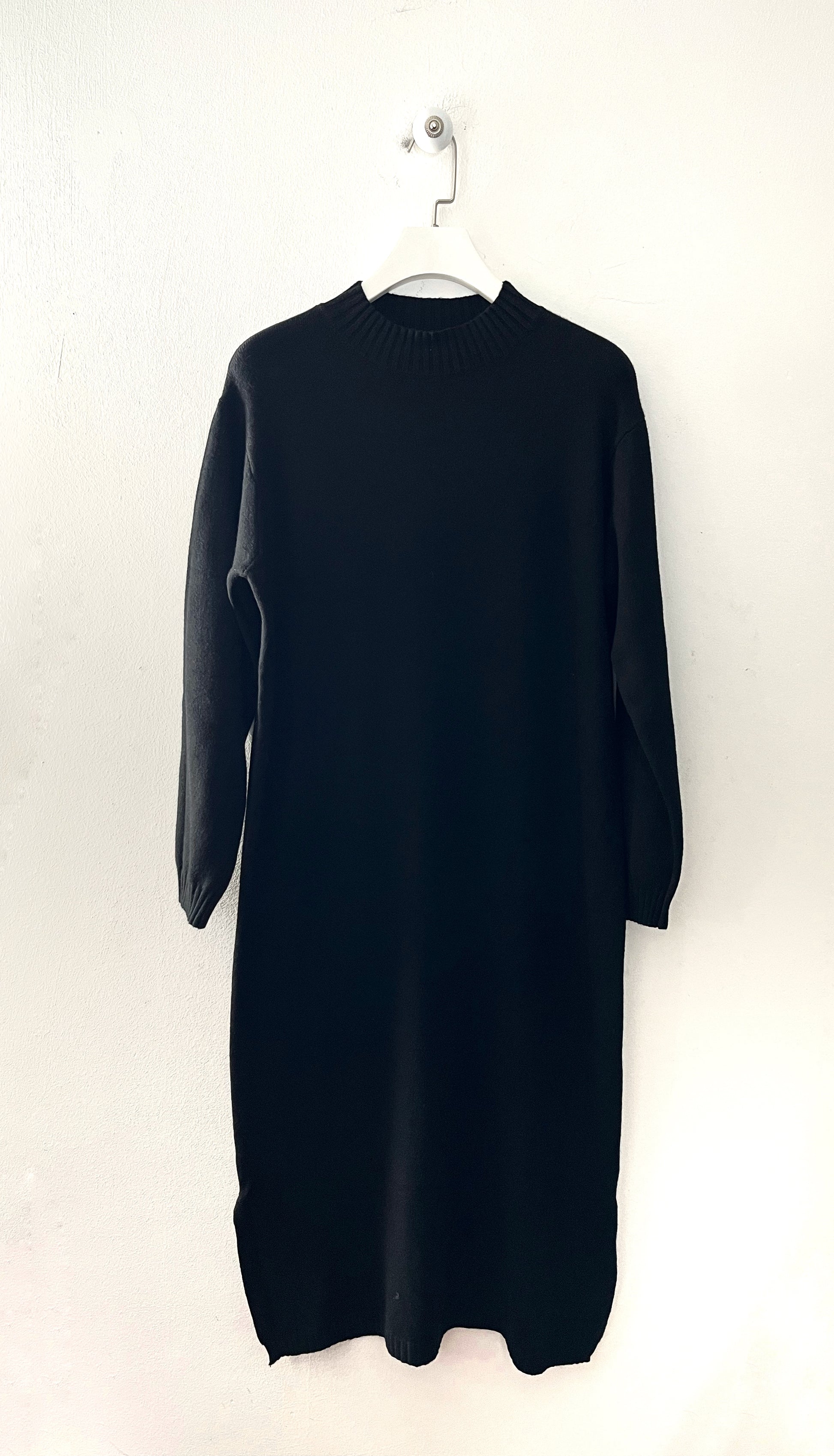 Maxi abito in calda viscosa, lupetto. Spalla ribassata. Polsino e bordo a coste, spacchi laterali su fondo.