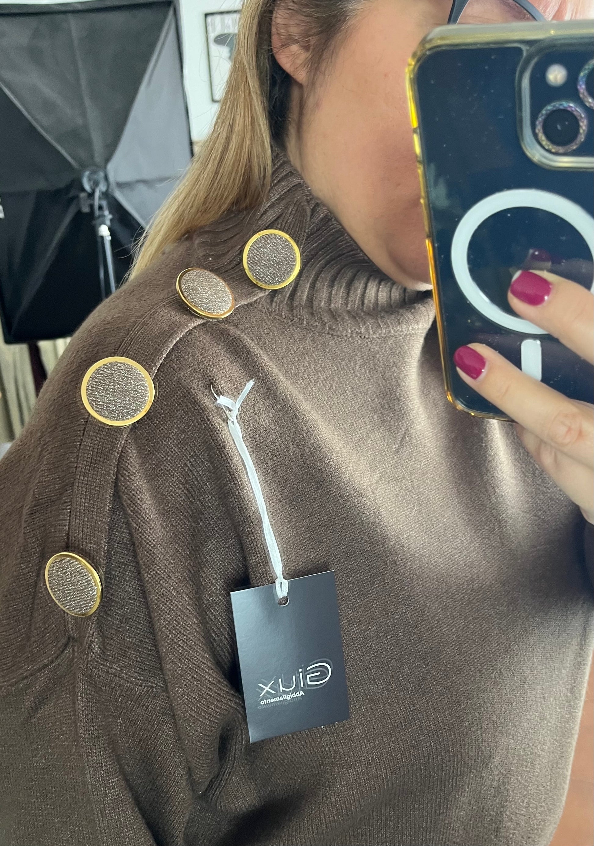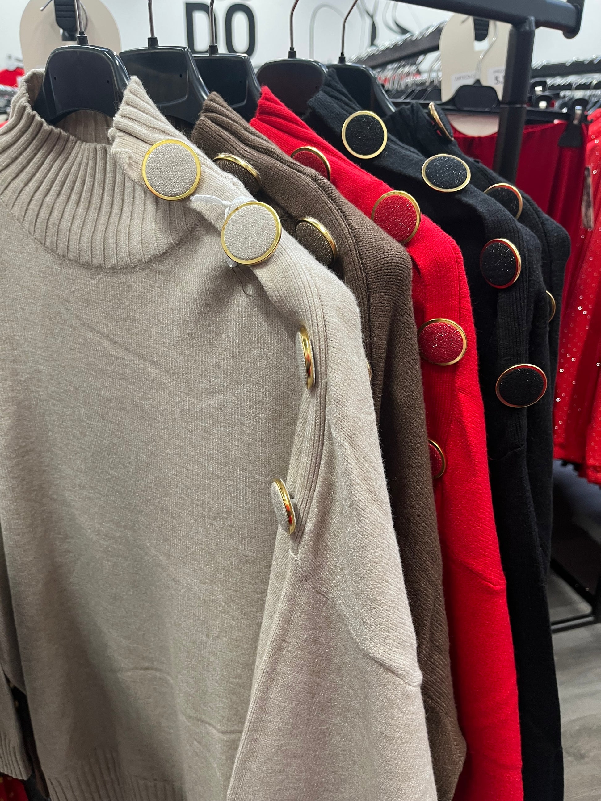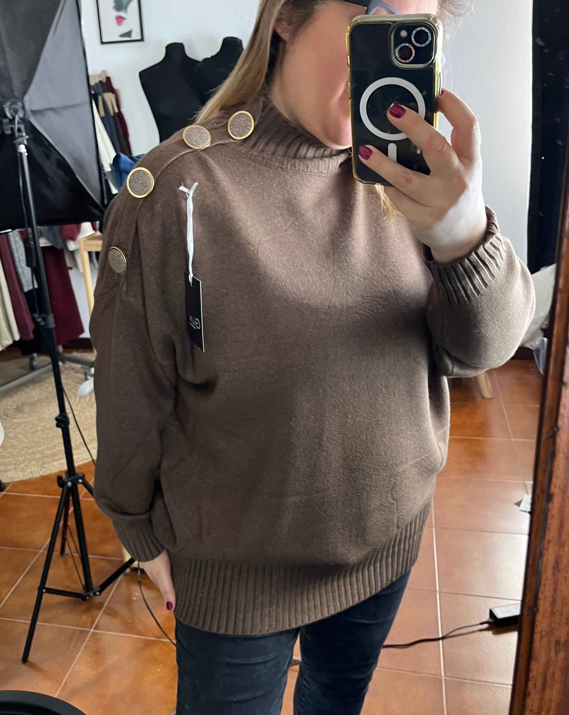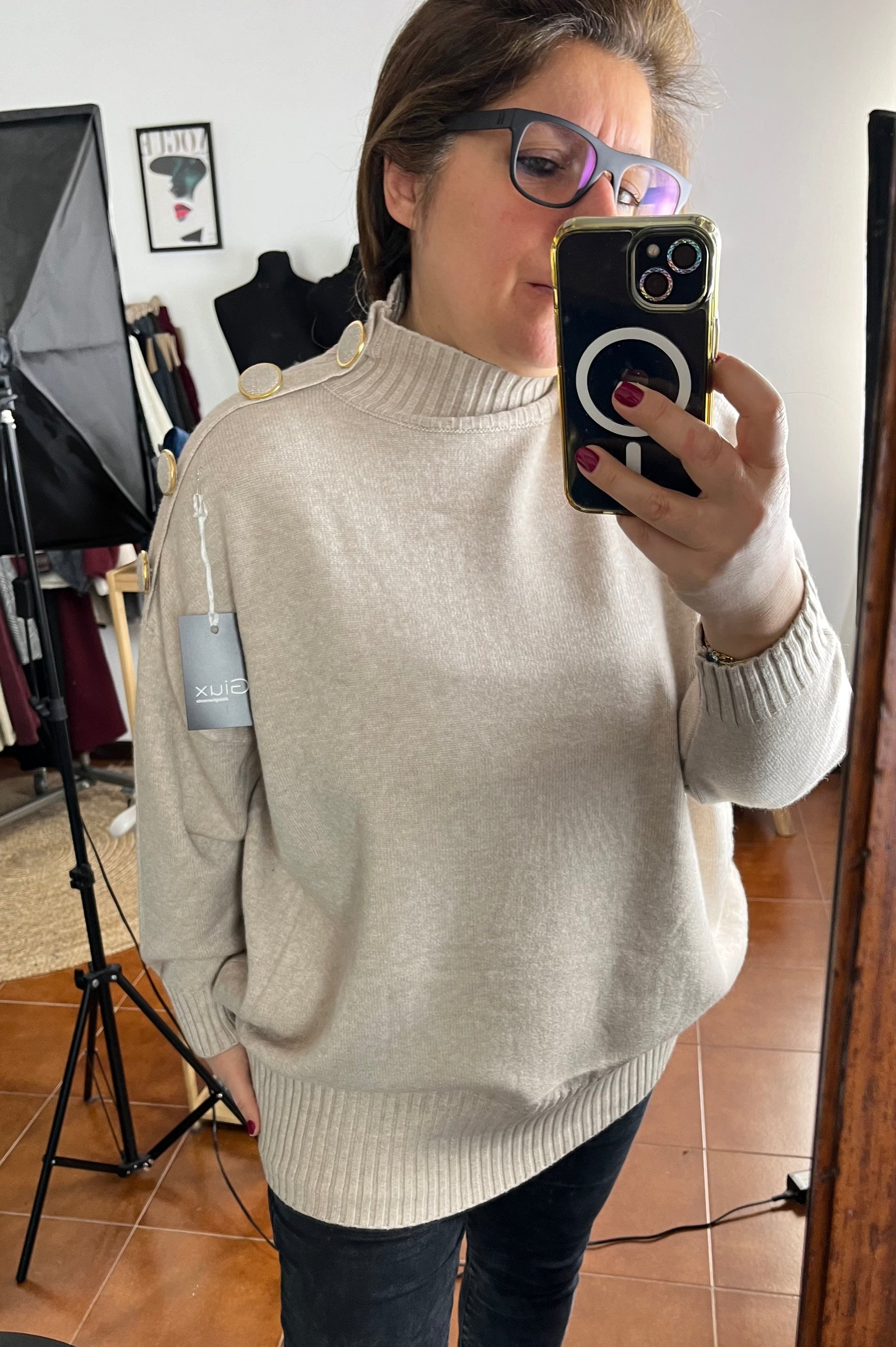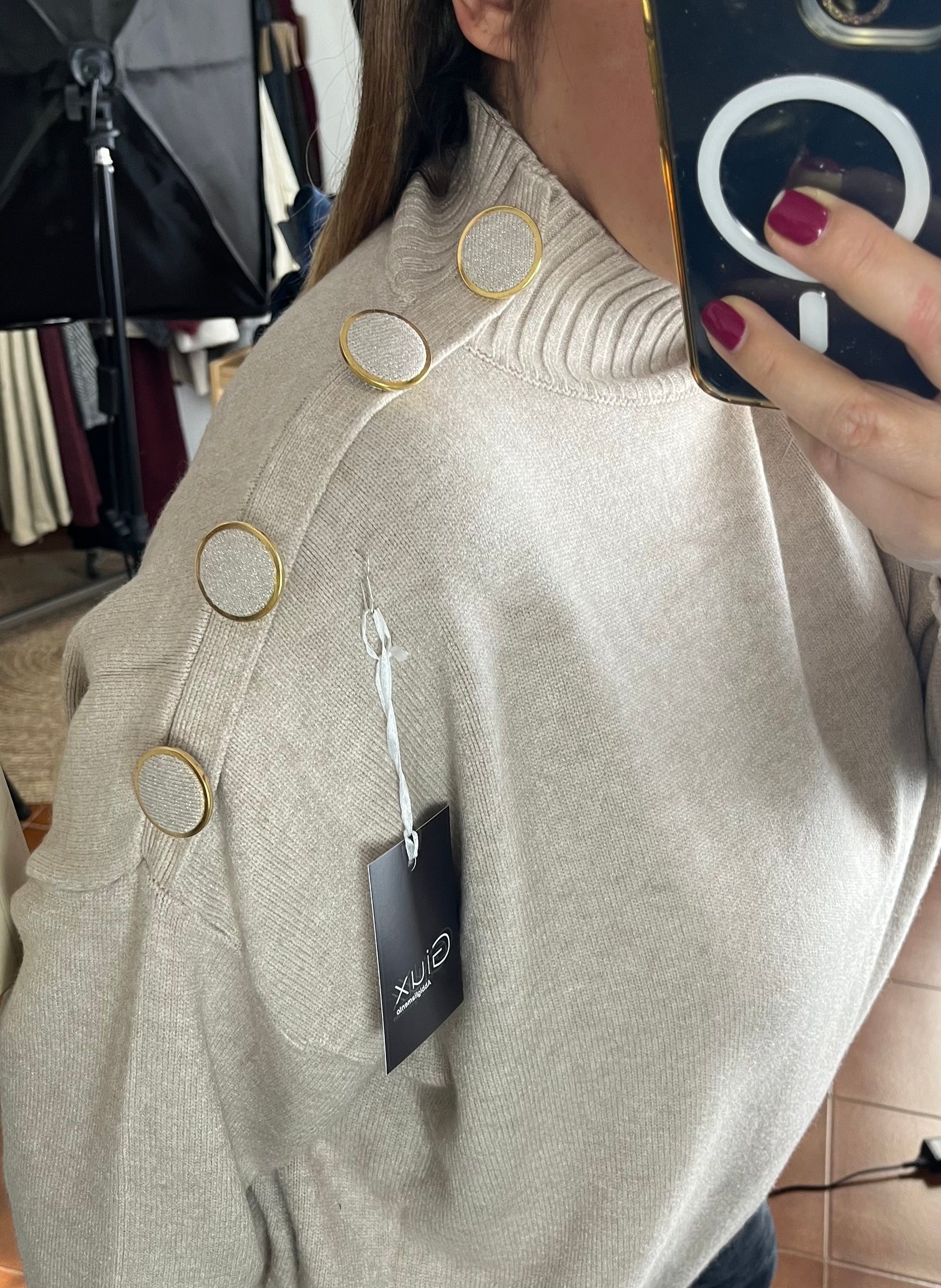 Maxi maglia a lupetto in calda viscosa, bottoni gioielli sulla spalla. Vestibilita morbida