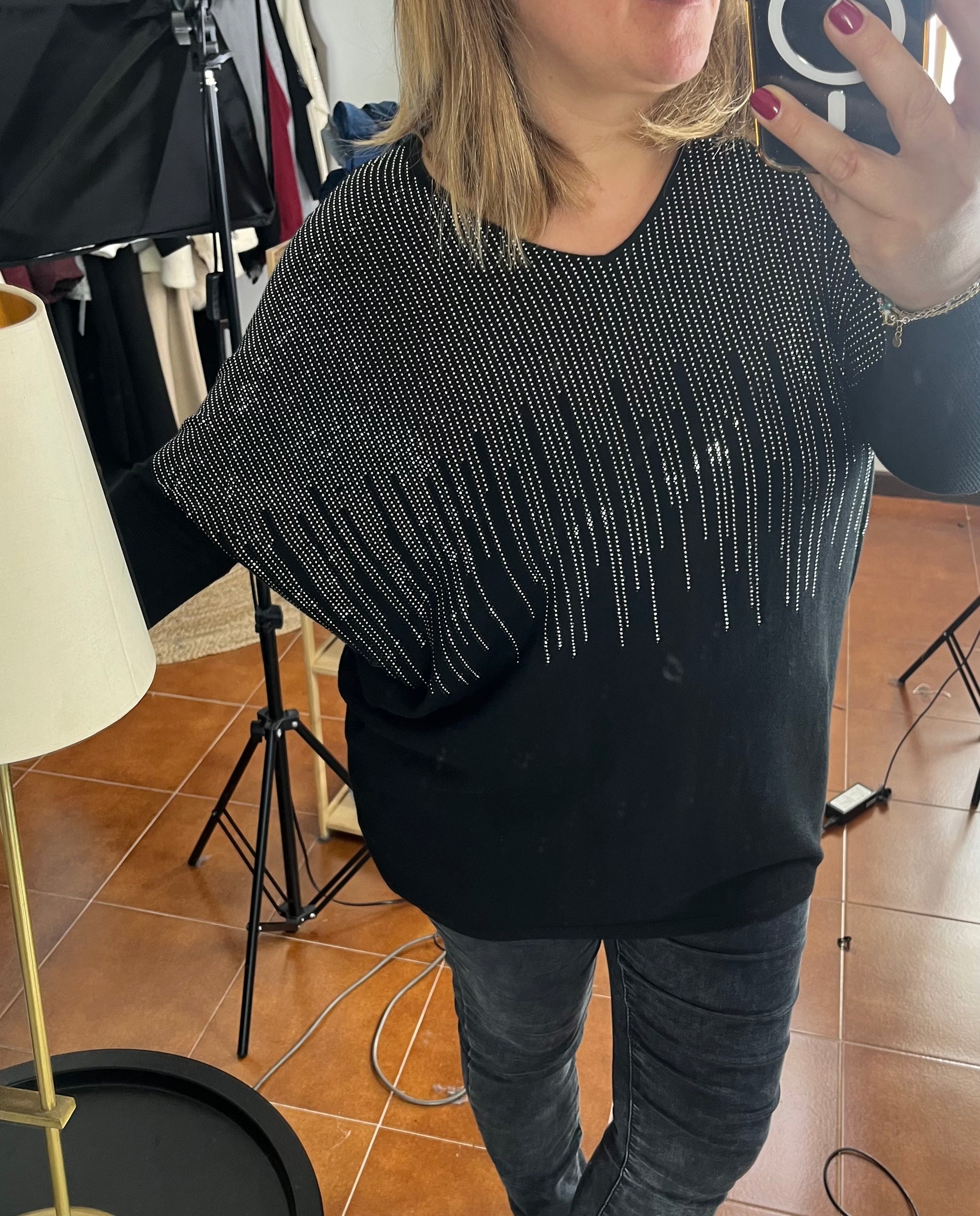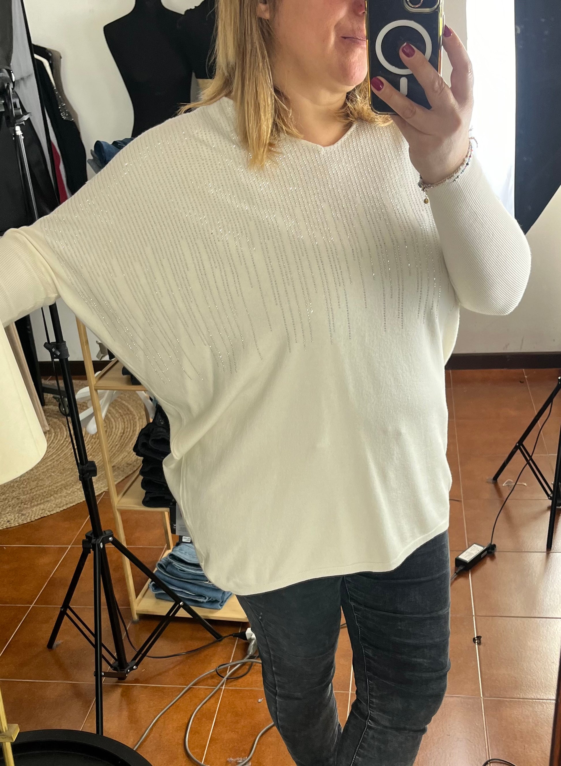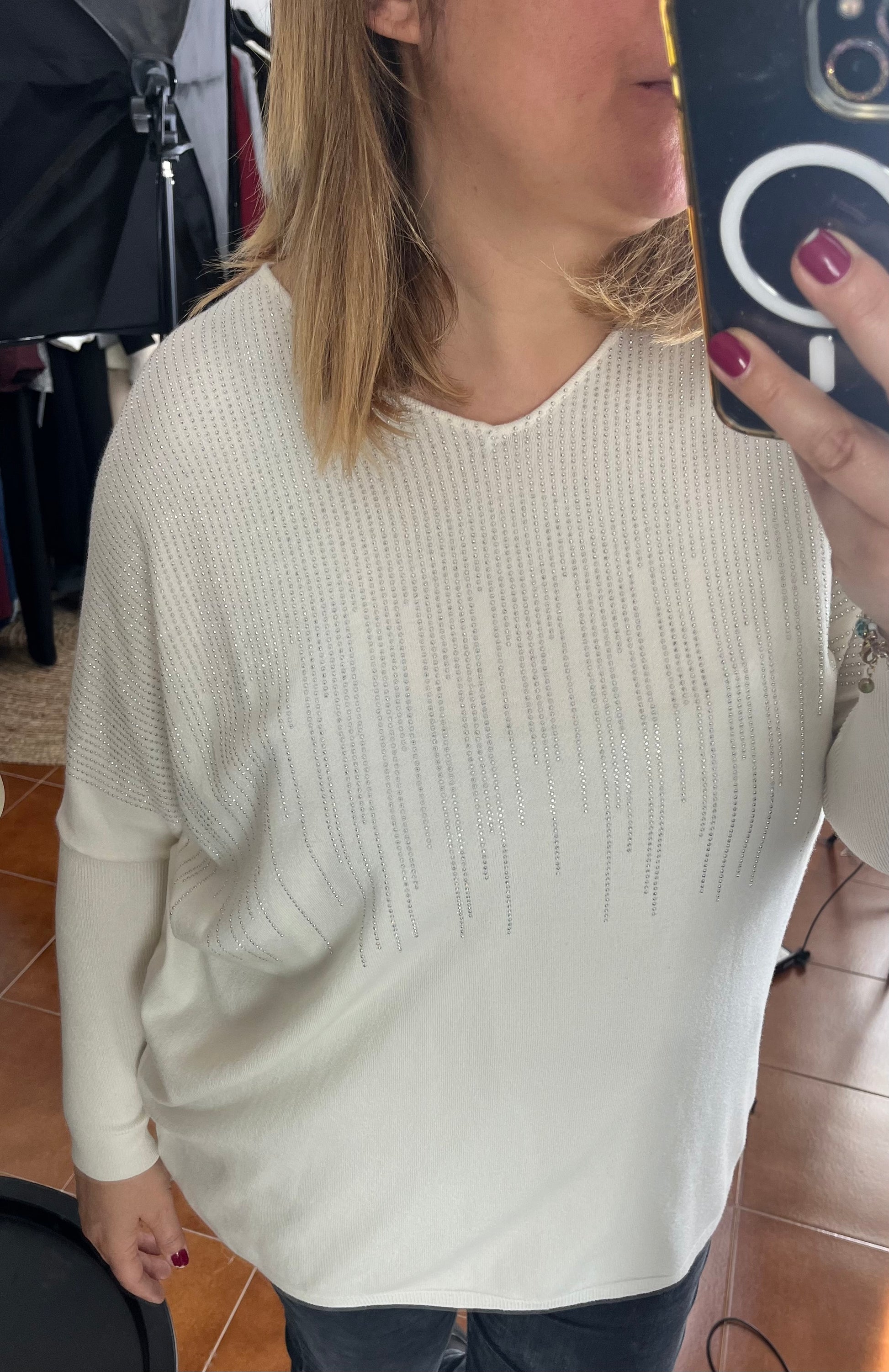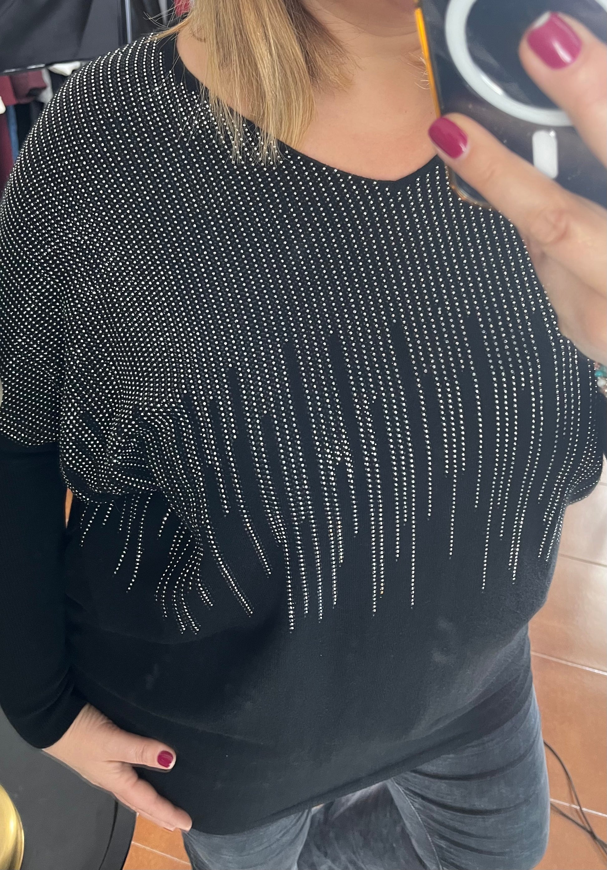 Maxi maglia a V in calda viscosa, beillantini applicati sul davanti. Manica aderente. Vestibilita morbida