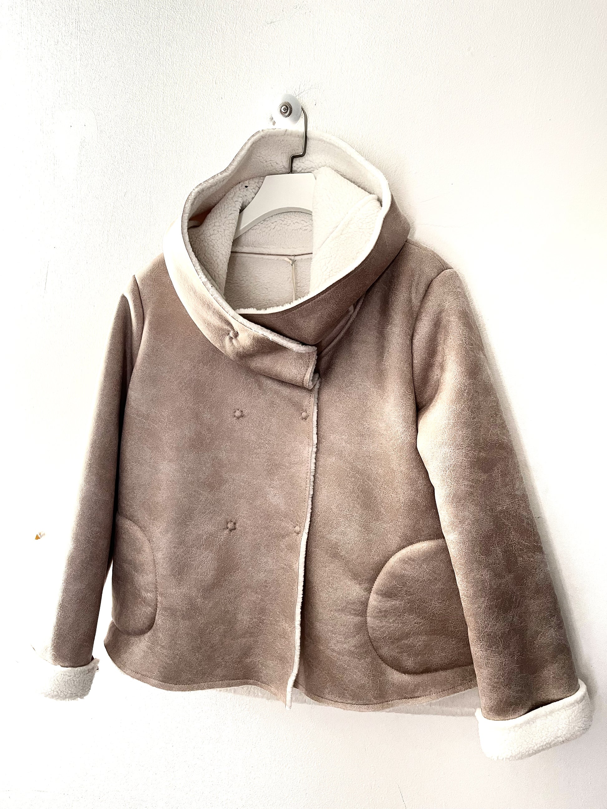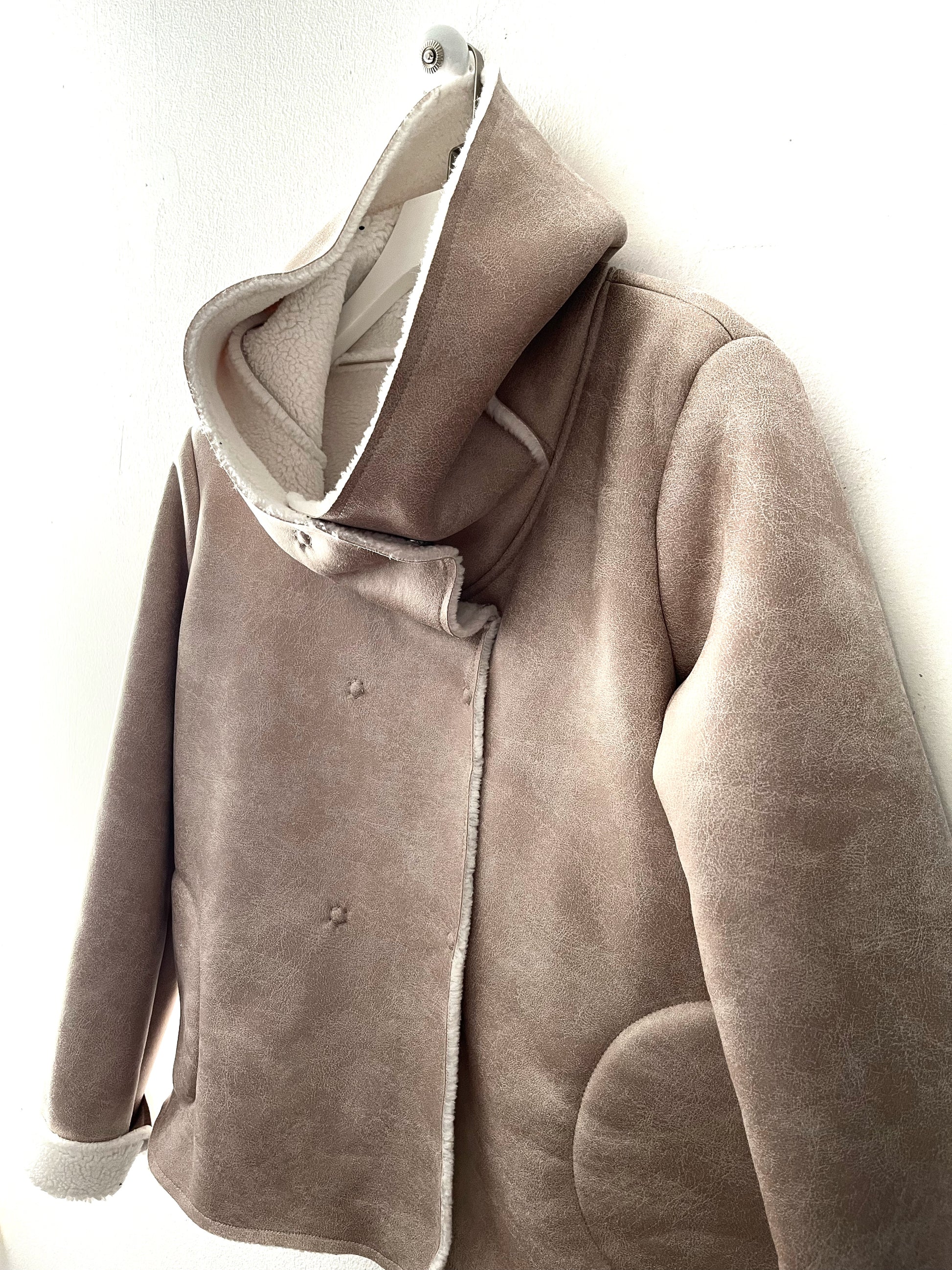 Montone con cappuccio, chiusura con clip doppiopetto. Tasche sul davanti, manica lunga, orsetto all’interno. Più lunga dietro.