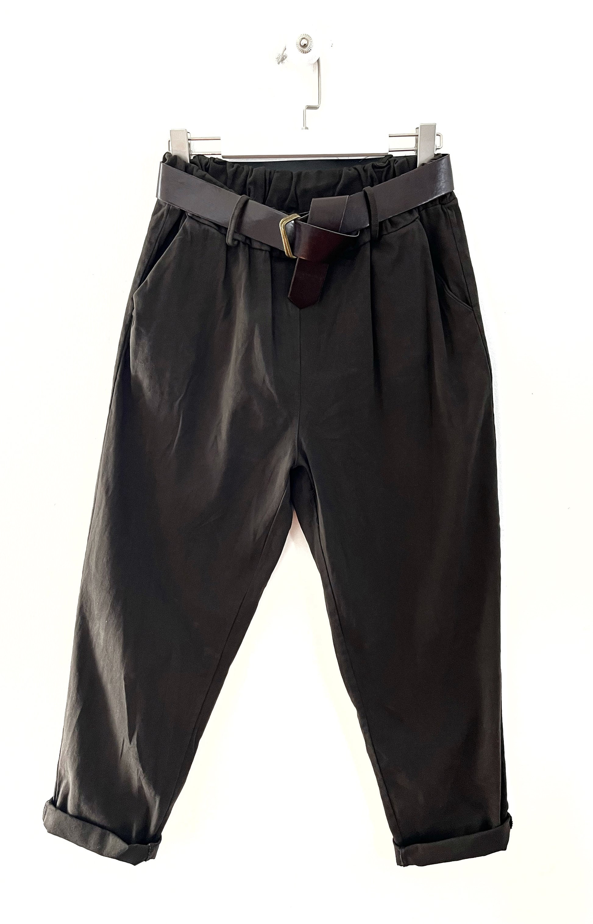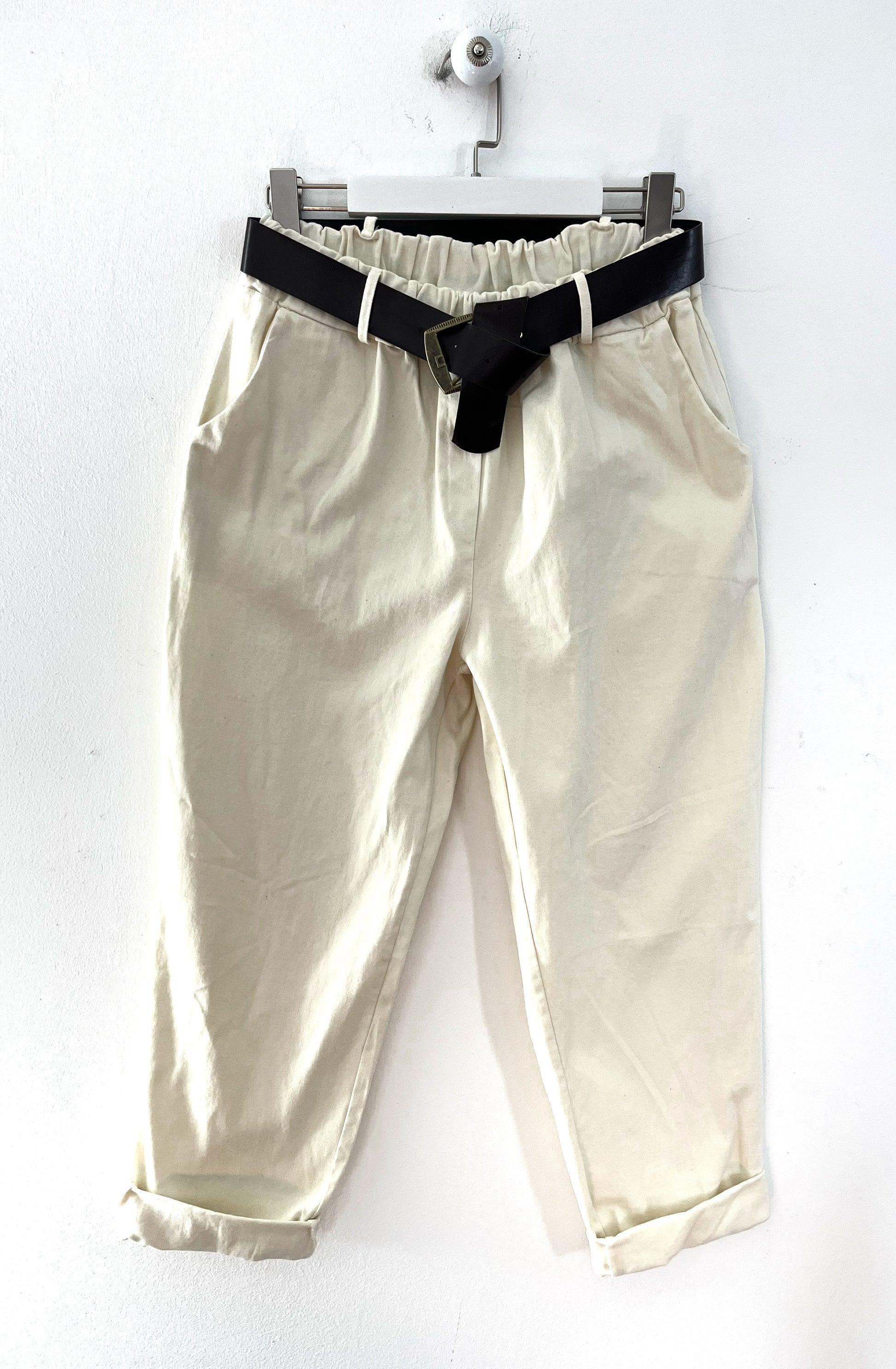 Pantalone in cotone autunnale. Vita alta con elastico in vita, passanti con cintura. 2 tasche davanti oblique.