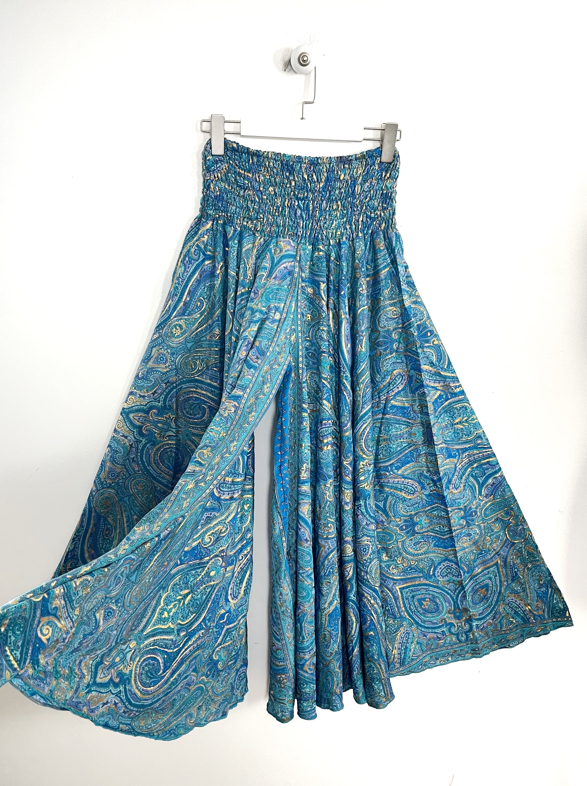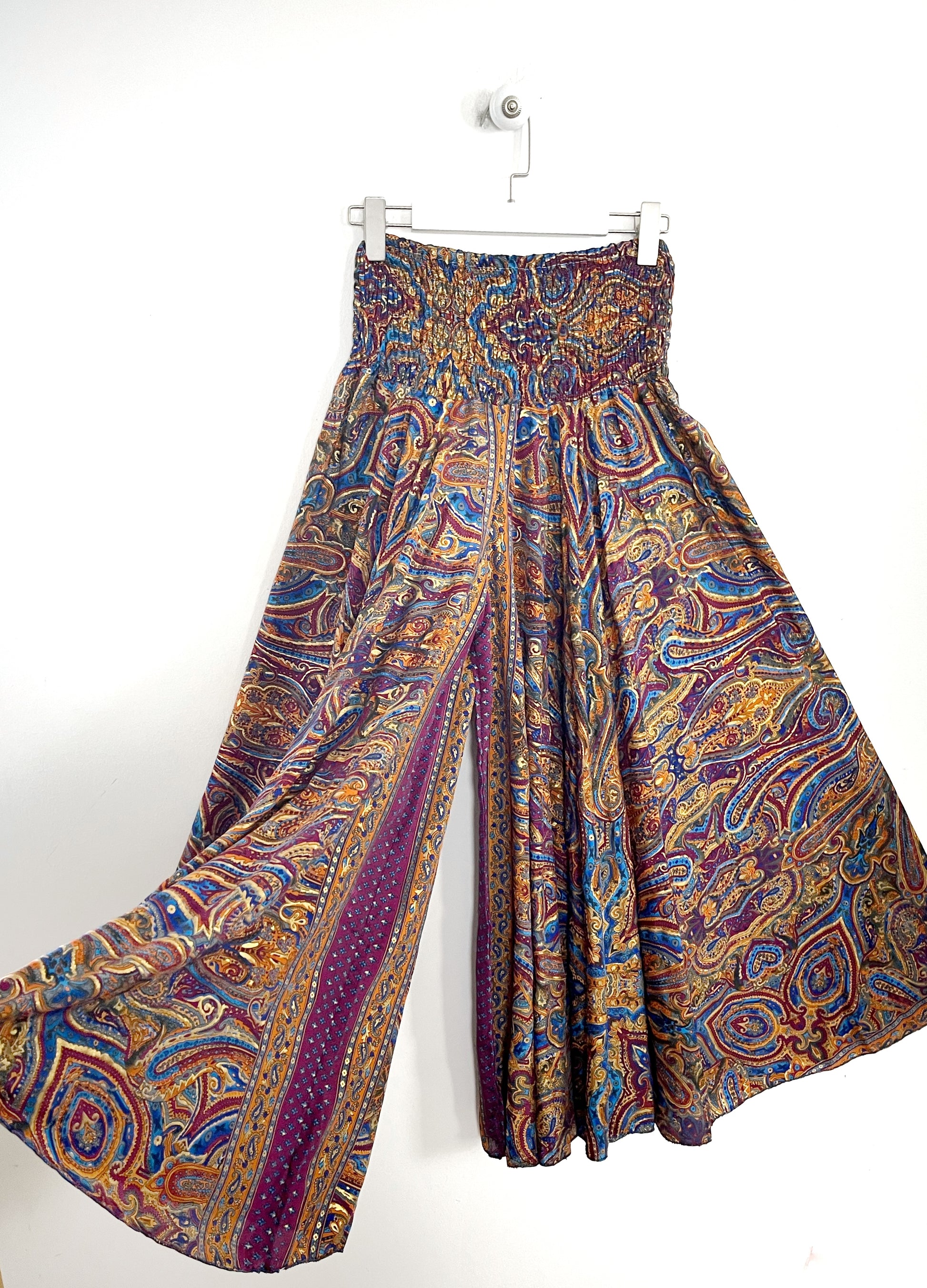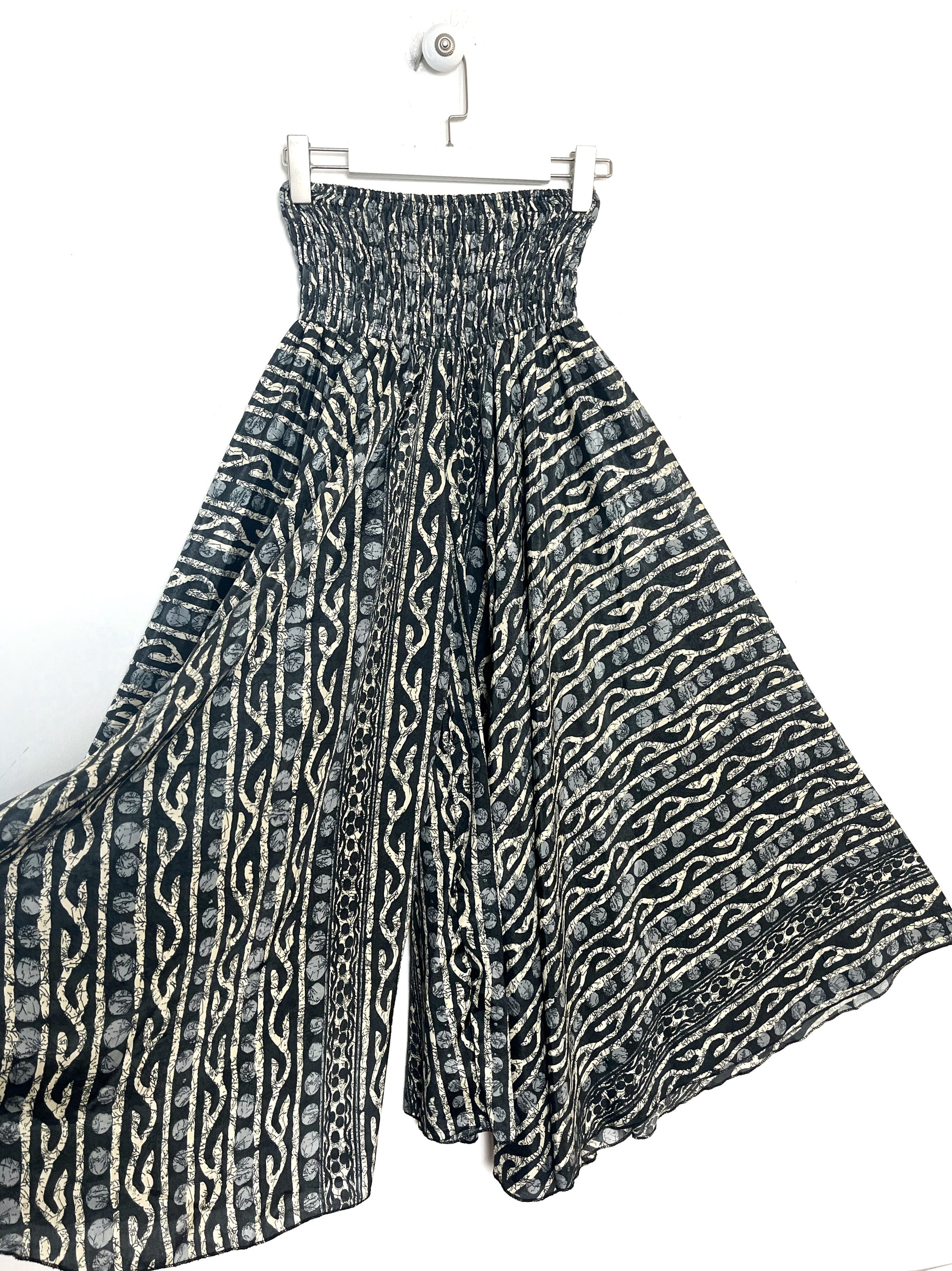 Pantalone con baschina in vita in punto smock, gambale molto largo alla caviglia.