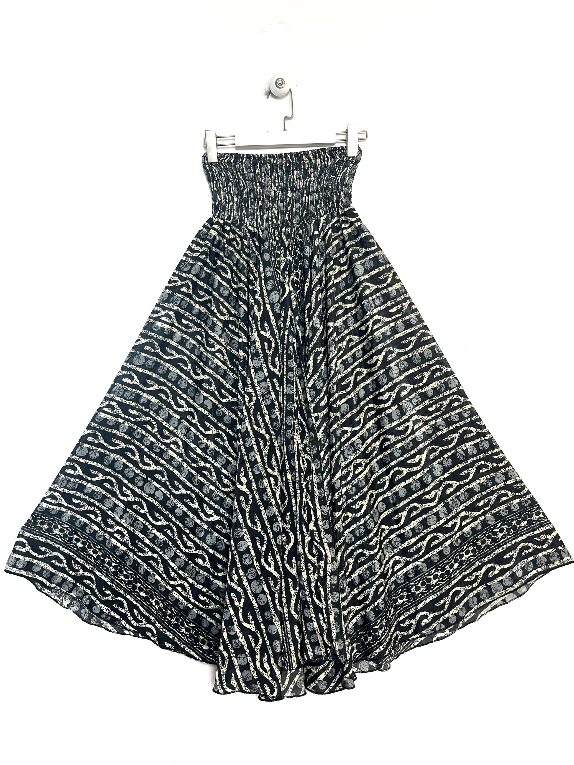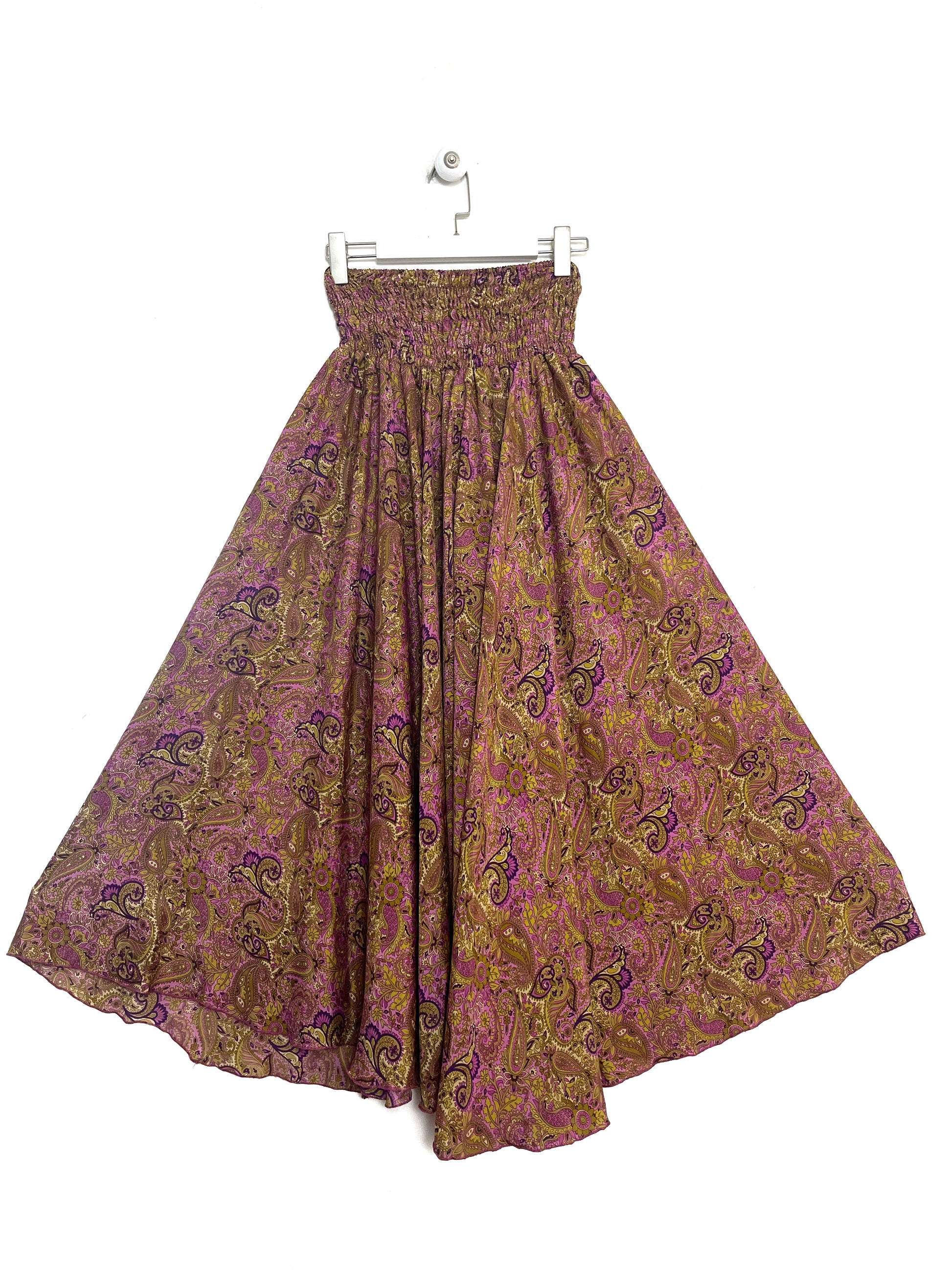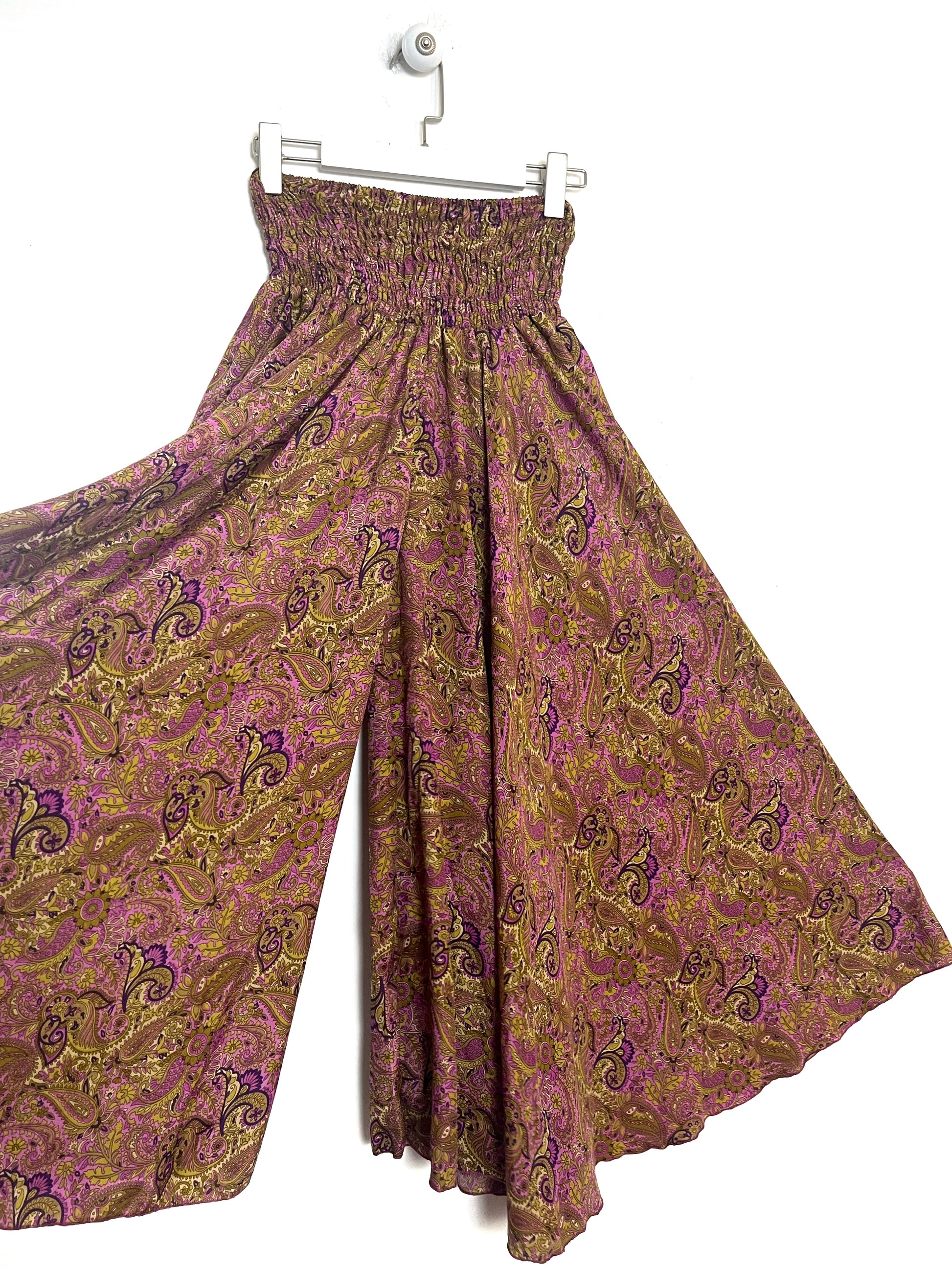 Pantalone con baschina in vita in punto smock, gambale molto largo alla caviglia.
