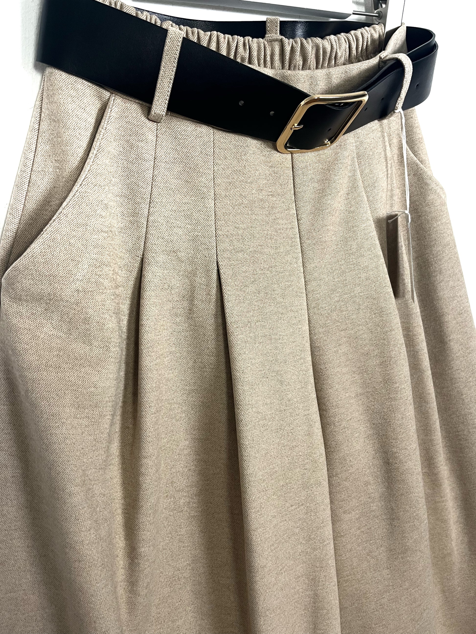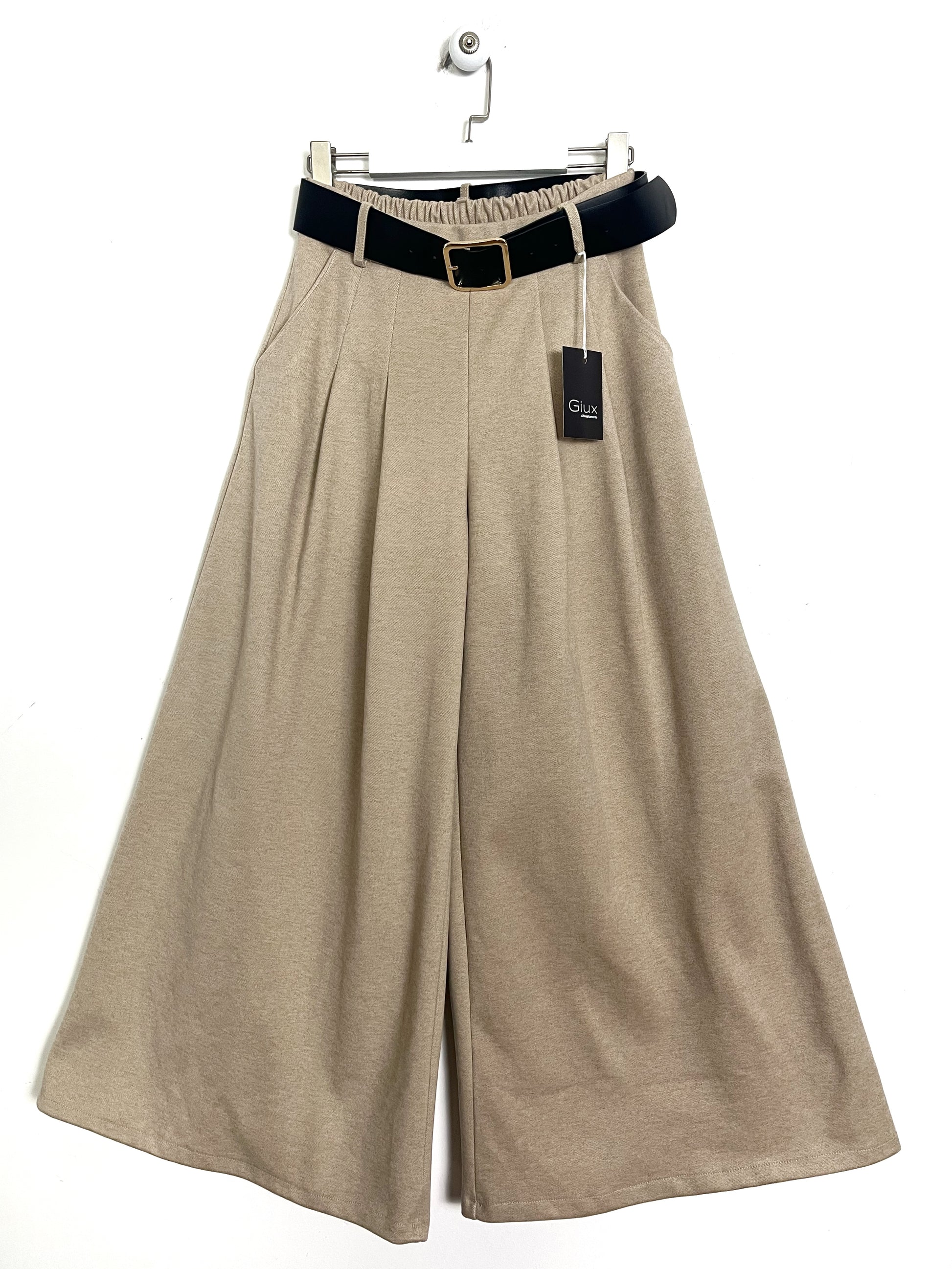 Pantalone tinta unita con elastico in vita, passanti con cintura. Tasche laterali. Gamba a palazzo.