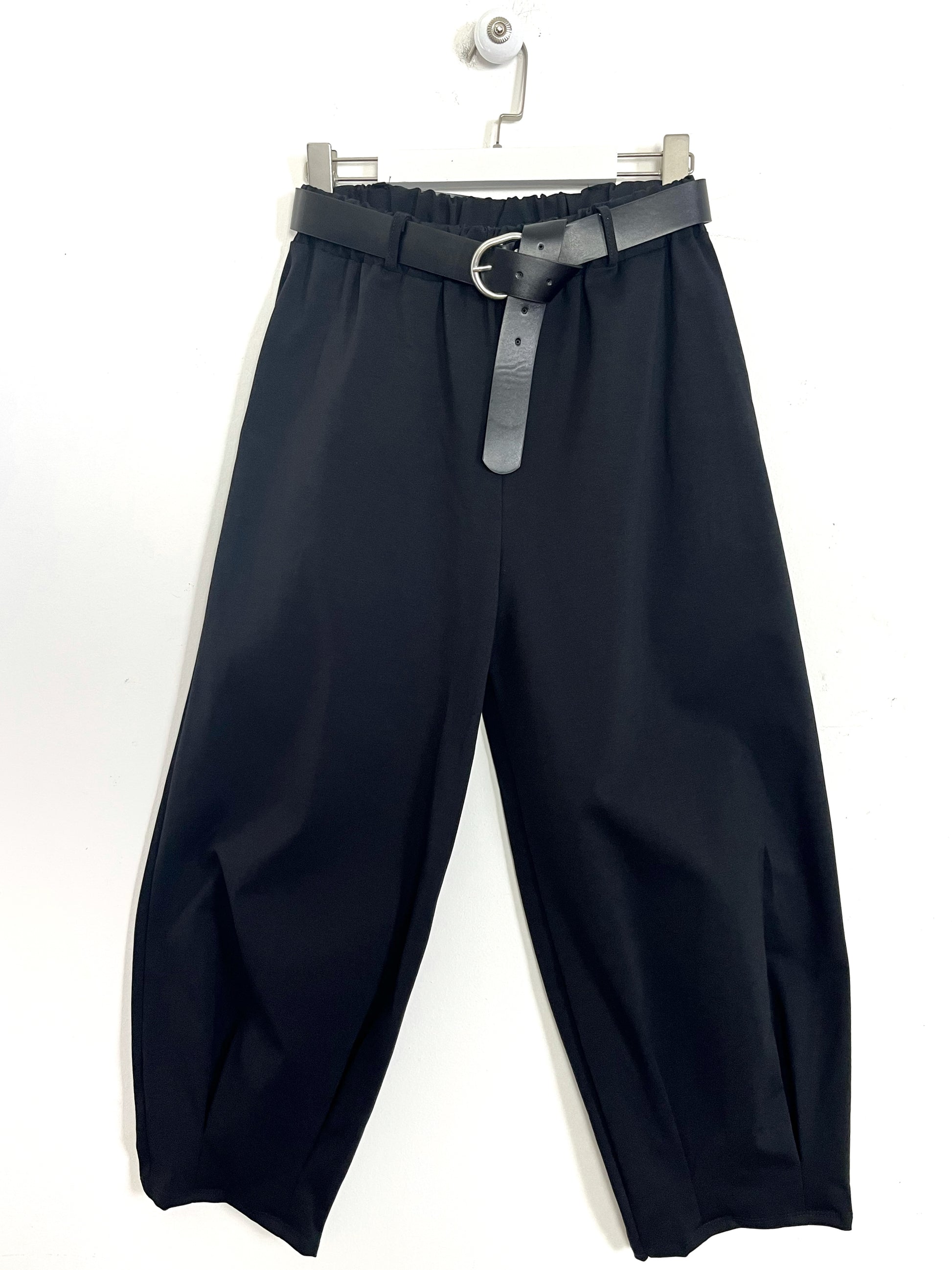 Pantalone in tessuto punto Milano, vita alta con elastico, tasche laterali a scomparsa. Forma a baloon, ampio sulla coscia che va a stringersi in fondo con pence, lunghezza alla caviglia.