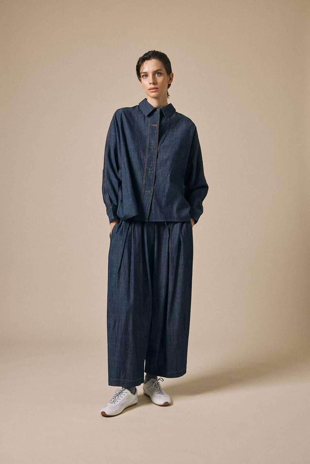 Pantalone in denim scuro, modello a baloon, morbido su tutta la gamba. Elastico in vita chiusa da asola e bottone, con coulisse. Tasche laterali a scomparsa. Lunghezza alla caviglia