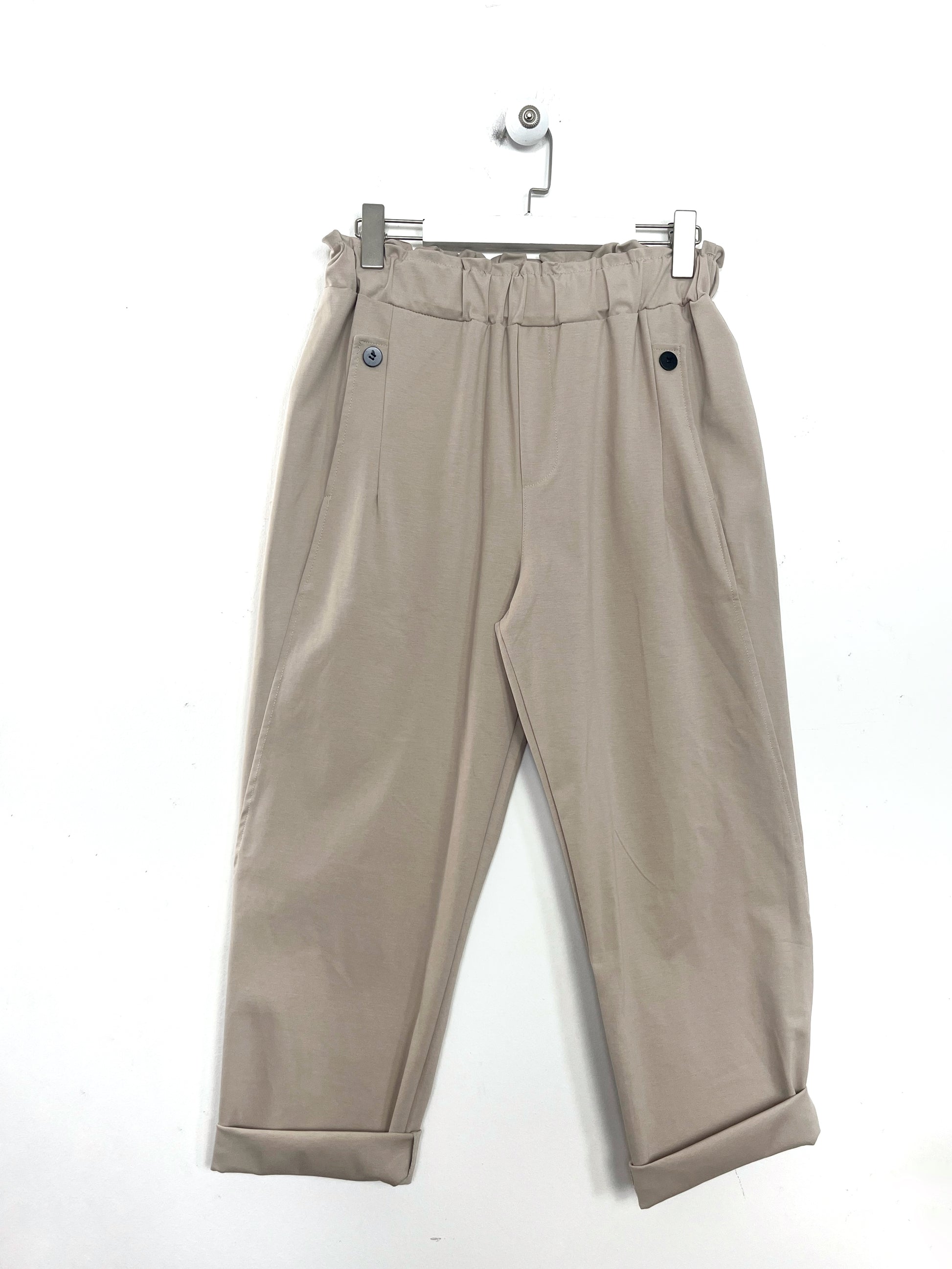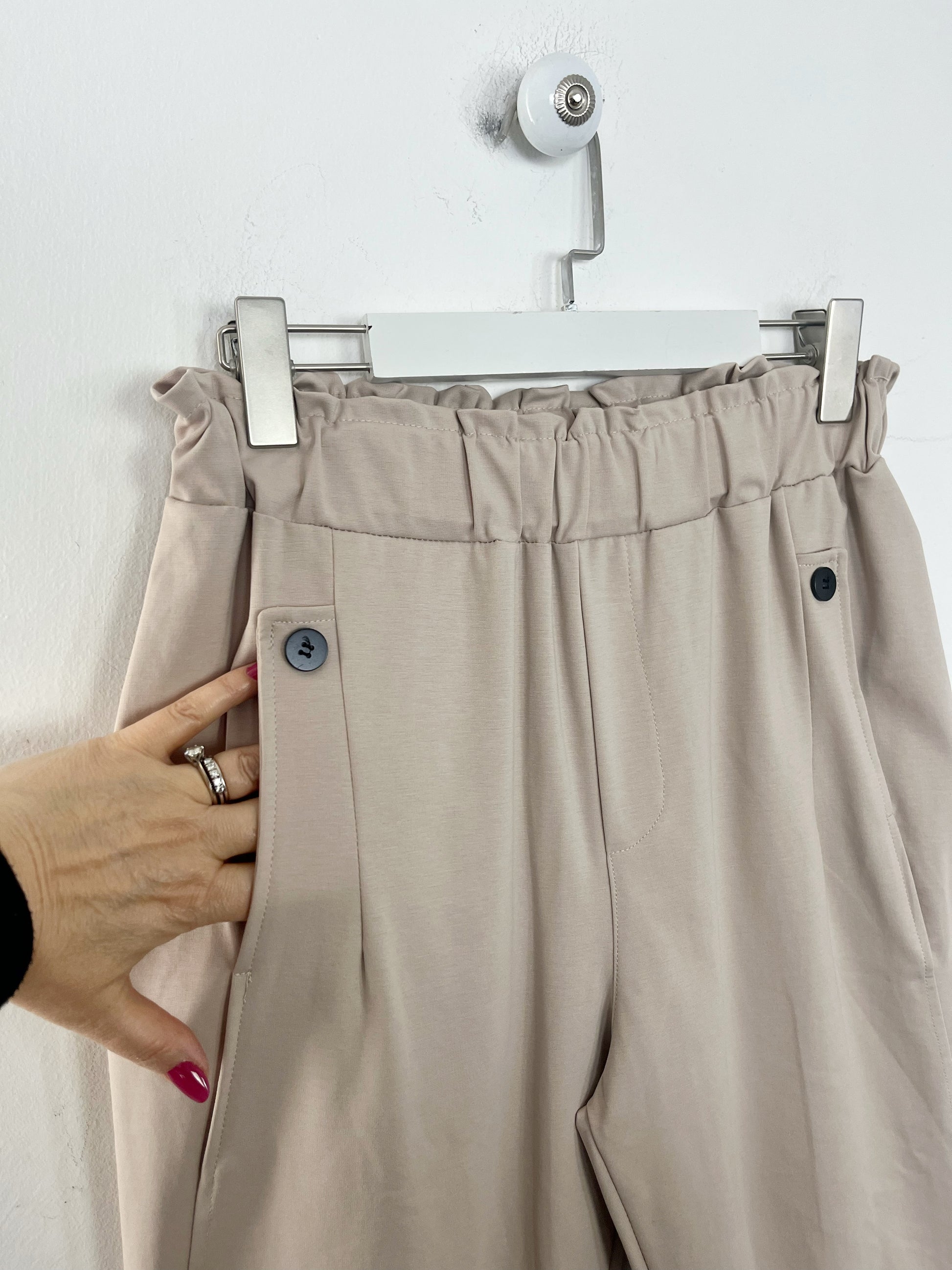 Pantalone in tessuto punto Milano, vita alta con elastico dietro, con Tasche. Gamba morbida