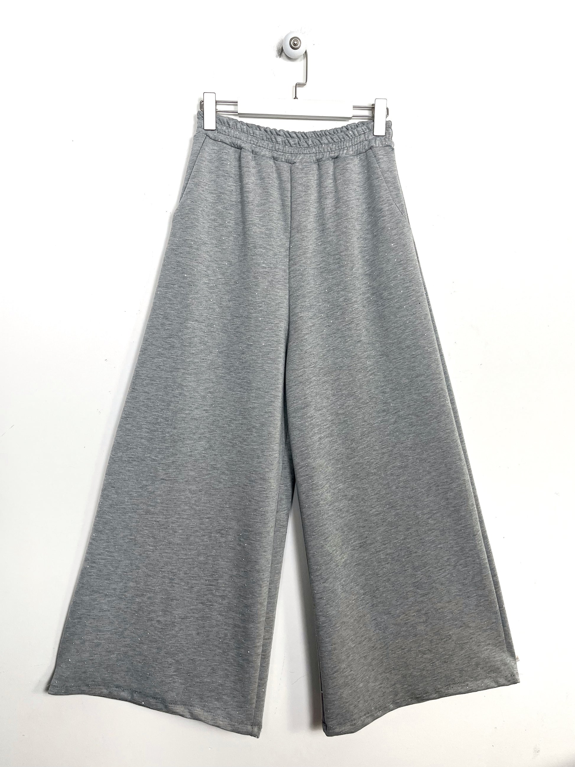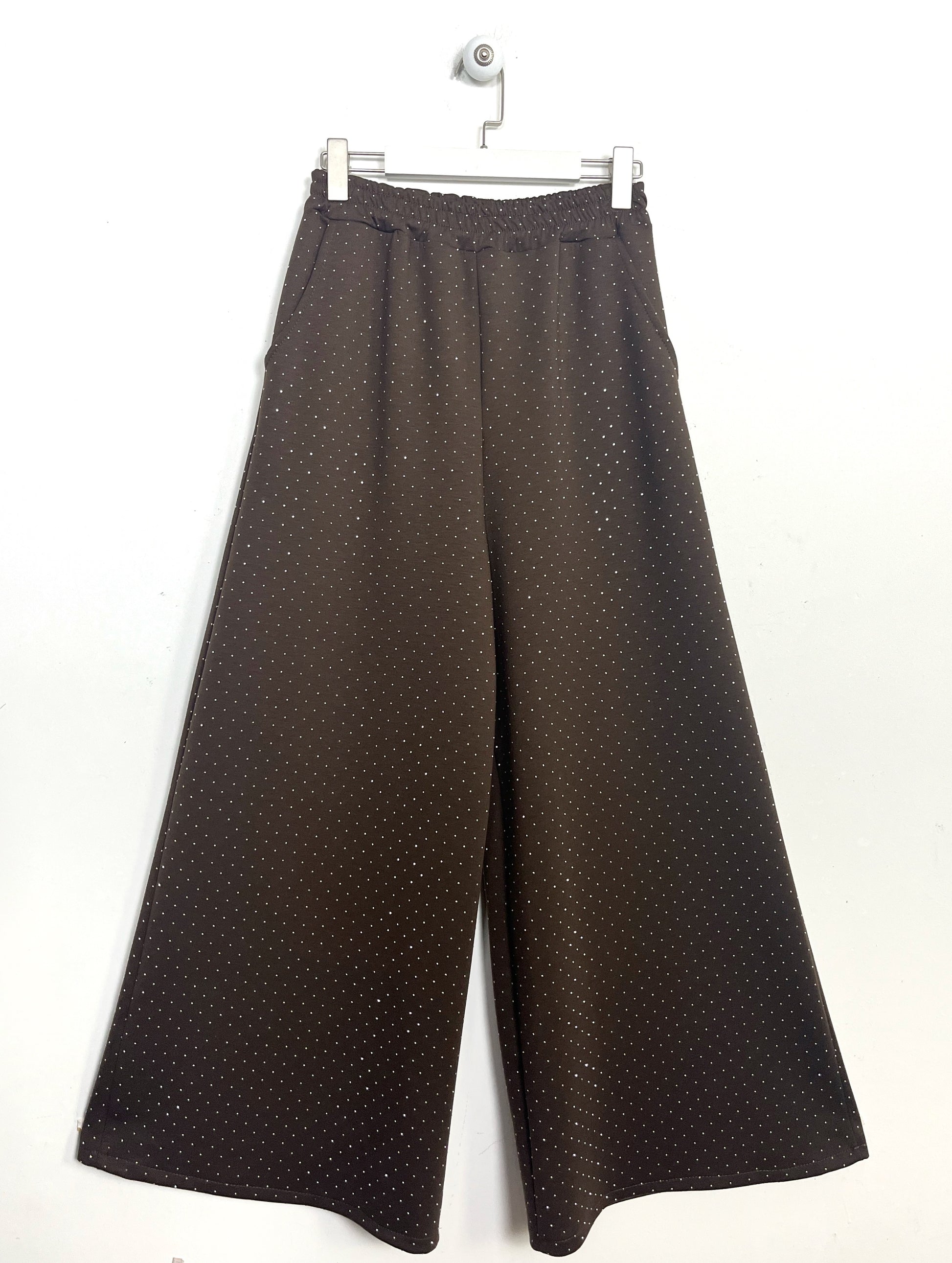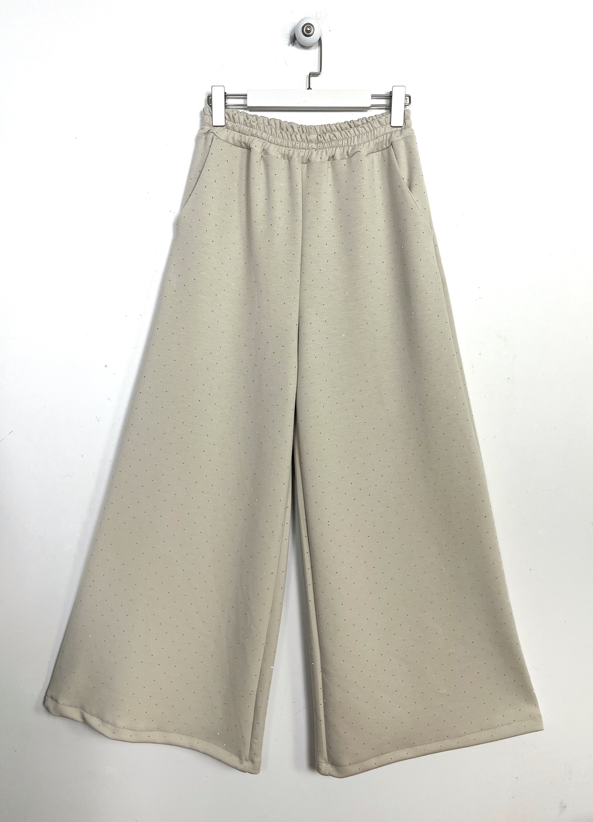 Pantalone in neoprene, gamba molto ampia. Vita alta con elastico. Con strass applicati