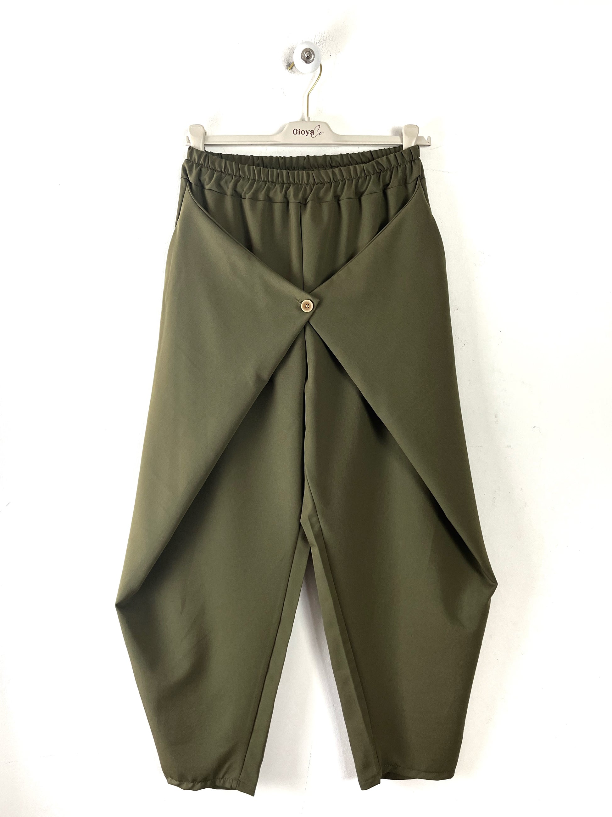 Pantalone in misto viscosa e Elasticizzata. Vita alta con elastico in vita. 2 ali chiuse sul davanti con un bottone, tasche a scomparsa laterali.