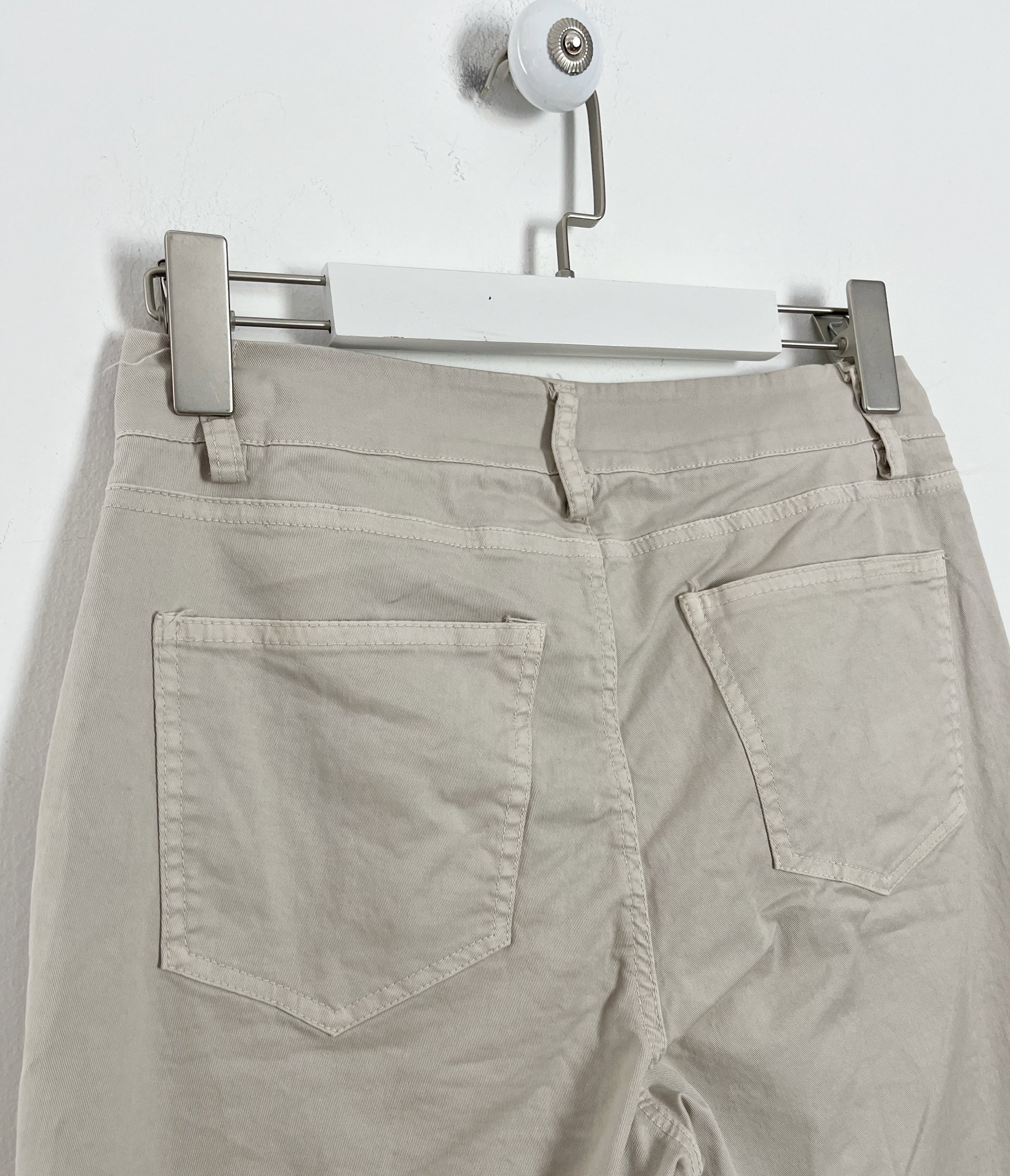 Pantalone in cotone elasticizzato. Gamba a sigaretta con vita alta, leggero effetto stropicciato. Chiusura con bottoni gioiello, 5 tasche.