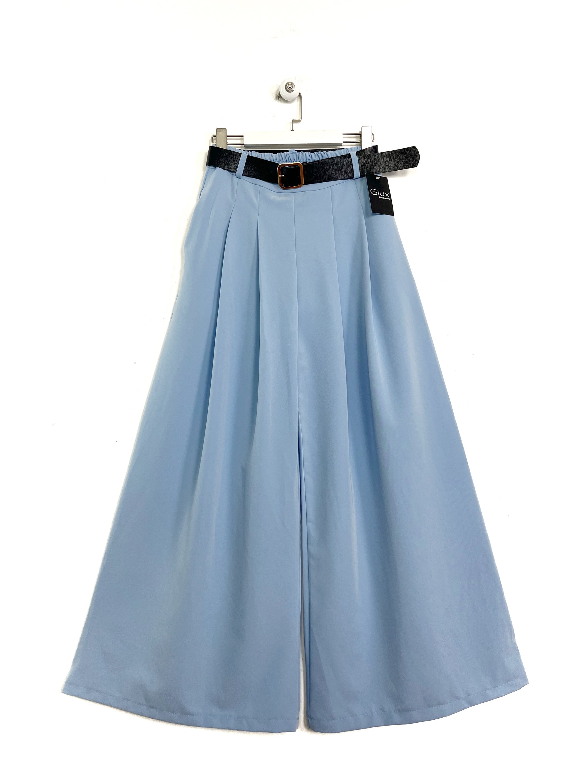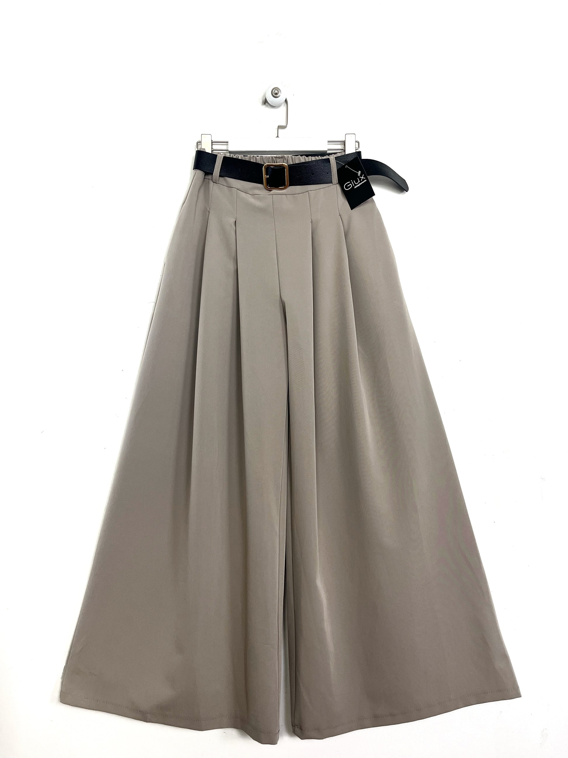 Pantalone in misto viscosa con gamba fluida a palazzo. Vita alta con pence, baschina sul davanti ed elastico dietro, passanti con cintura. Tasche laterali.
